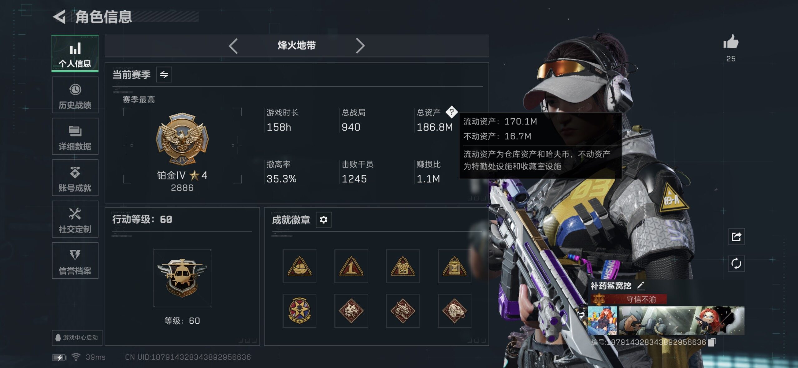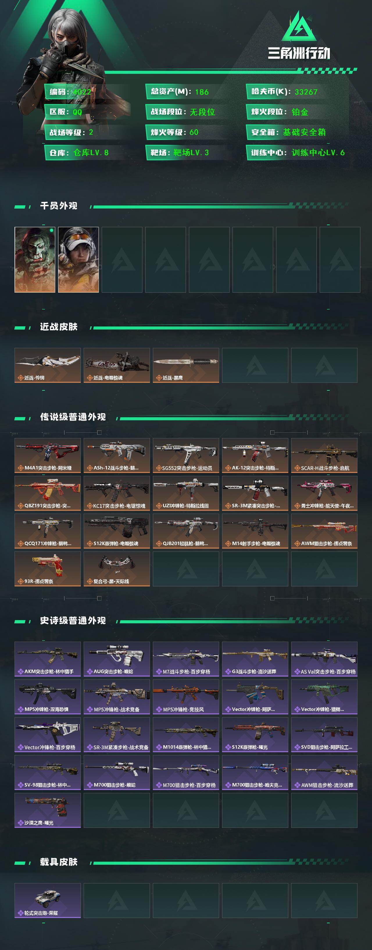 186m总资产-33267k哈伏币-60烽火等级-铂金-2战场等级-无军衔
