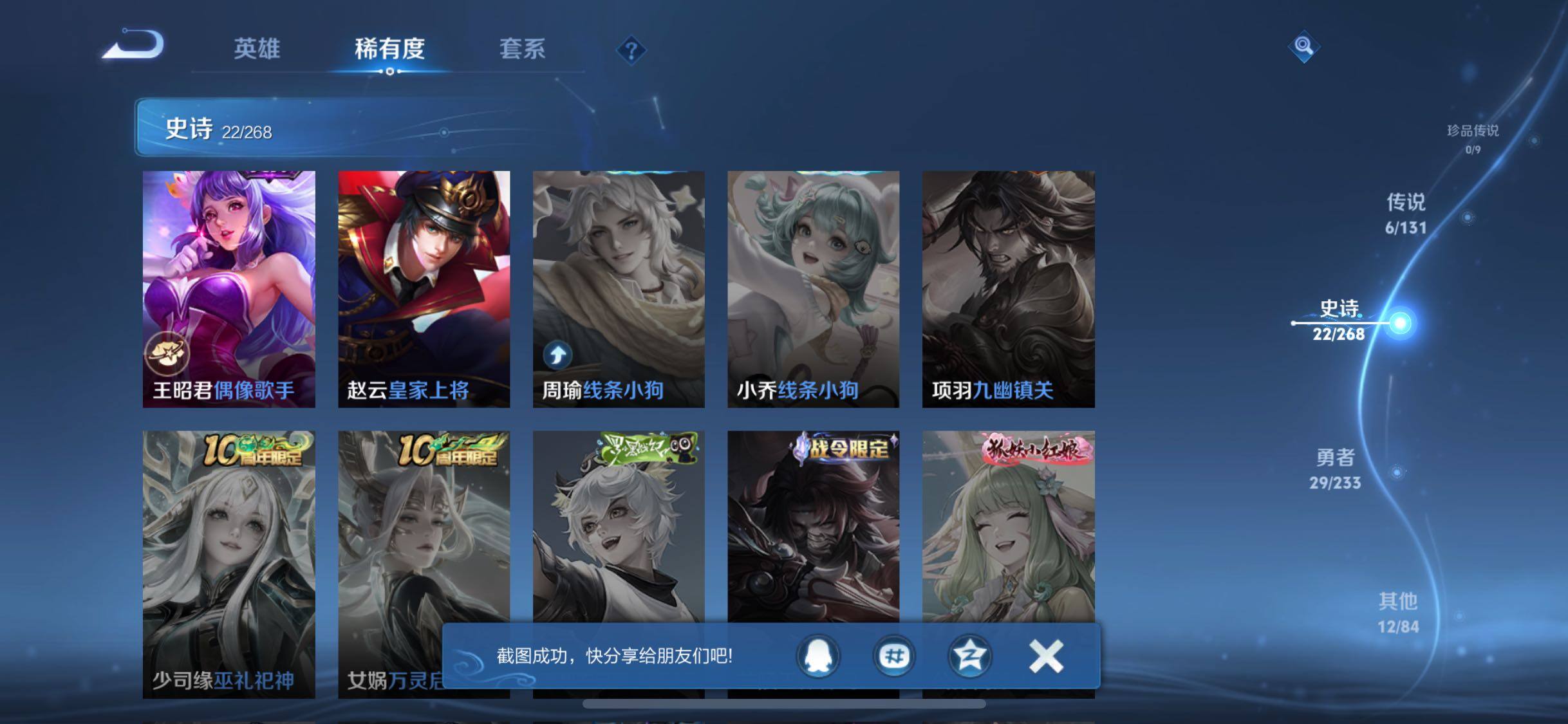 【史诗皮肤】:赵云皇家上将,王昭君偶像歌手,狄仁杰魔术师,妲己魅力维加斯,曹操幽灵船