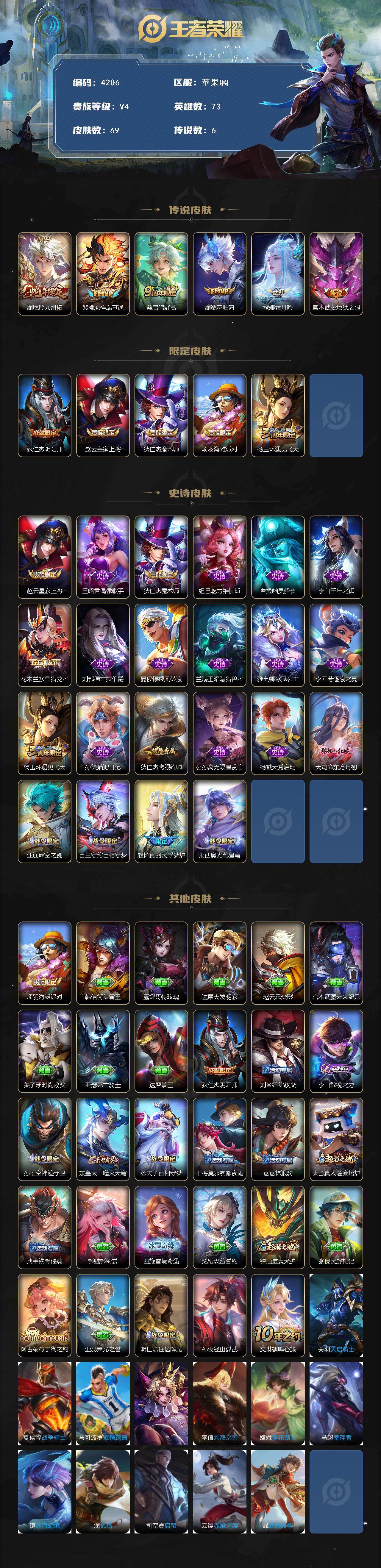 /苹果Q-V4-最强王者段位-73英雄-69皮肤-6传说-22史诗