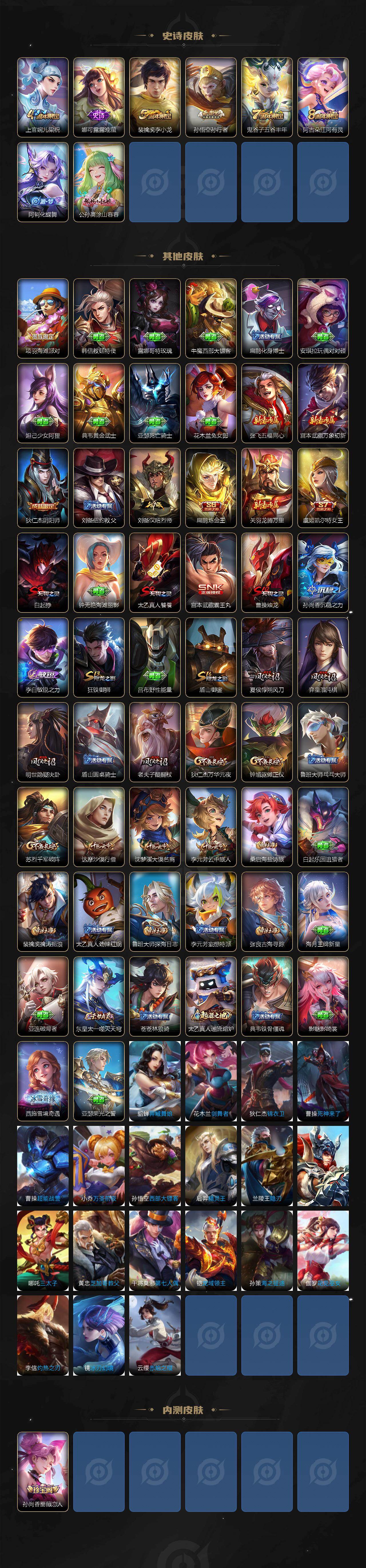 【限定皮肤】:白起狰,狄仁杰阴阳师,虞姬凯尔特女王,赵云皇家上将,孙尚香蔷薇恋人,扁鹊炼金王,夏侯惇朔风刀,曹操烛龙,狄仁杰魔术师,狄仁杰万华元夜,达摩沙漠行僧,项