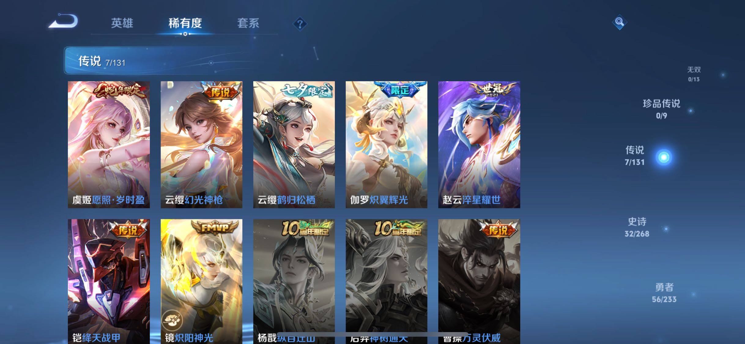 【传说皮肤】:虞姬愿照岁时盈,云缨幻光神枪,云缨鹤归松栖,伽罗炽翼辉光,赵云淬星耀世,铠绛天战甲,镜炽阳神光