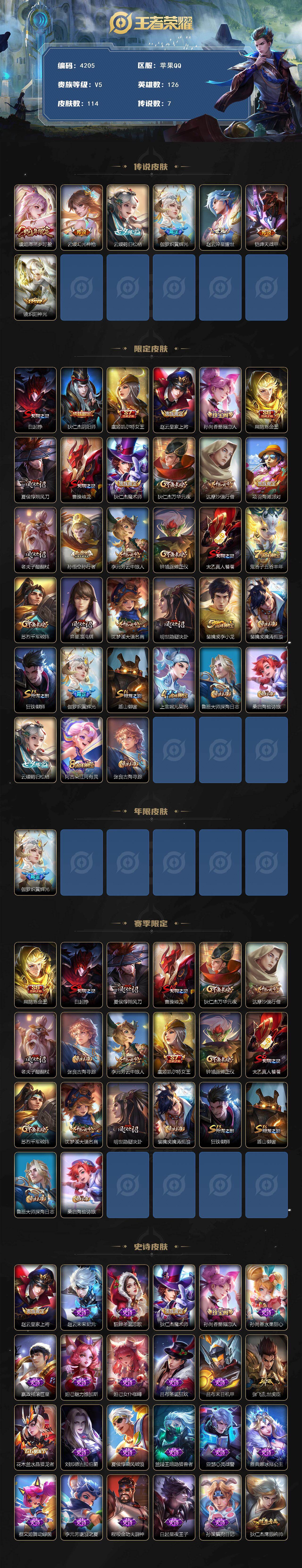 /苹果Q-V5-至尊星耀V段位-126英雄-114皮肤-7传说-32史诗