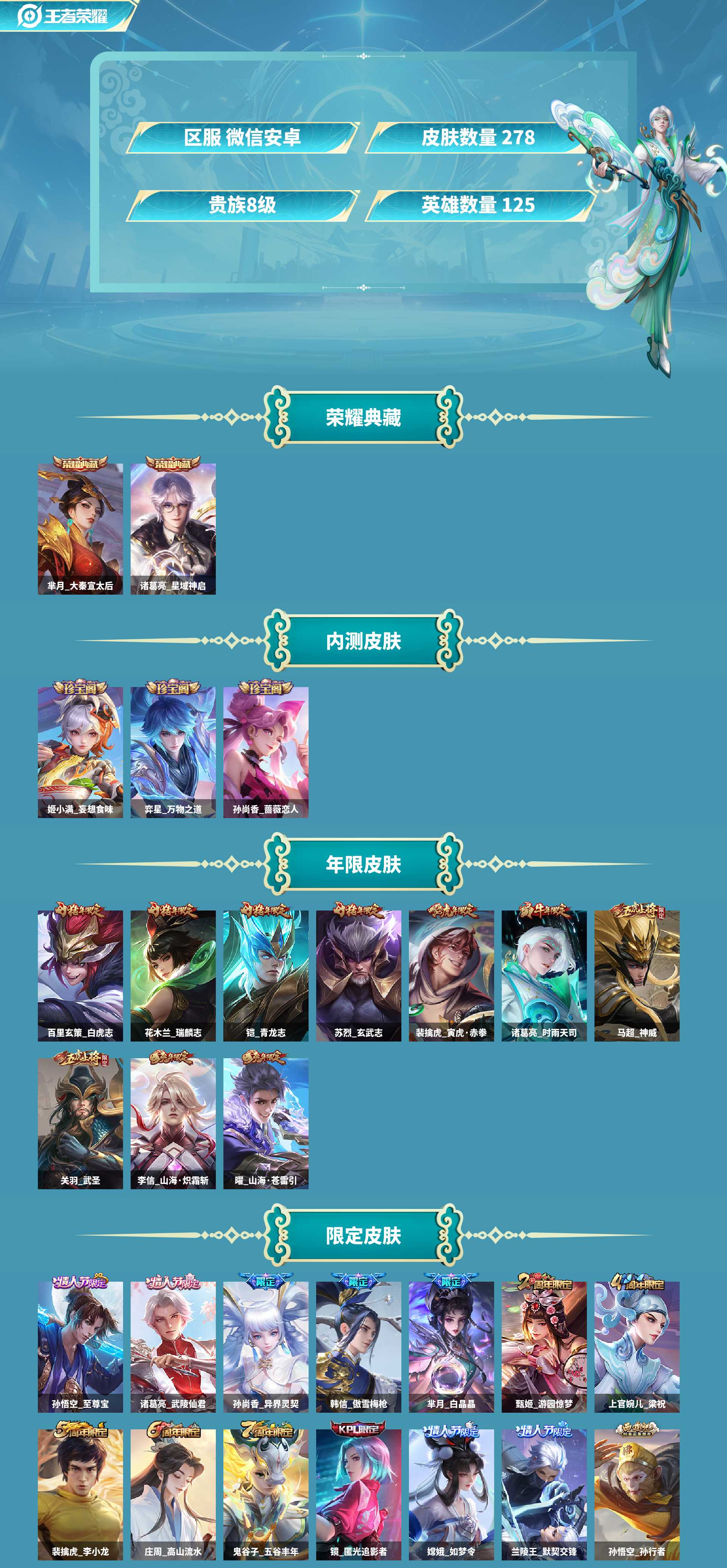 特价安卓v区微信一切正常 278皮2水诸葛亮星域神启,芈月大秦宣太后28传说传说皮肤:宫本武藏地狱之眼,桑启鸣野蒿,百里玄策白虎志,关羽武圣,吕布遇见神鼓,兰陵王默契交锋,貂蝉猫影幻舞,公孙离记忆之芯,李信山海炽霜斩,孙悟空齐天大圣,曜山海苍雷引,吕布怒海麟威,李白诗剑行,诸葛亮时雨天司,李信一念神魔,曜李逍遥,马超无双飞将,虞姬启明星使,诸葛亮武陵仙君,露娜启示之音,李元芳飞鸢探春,曜云鹰飞将,
