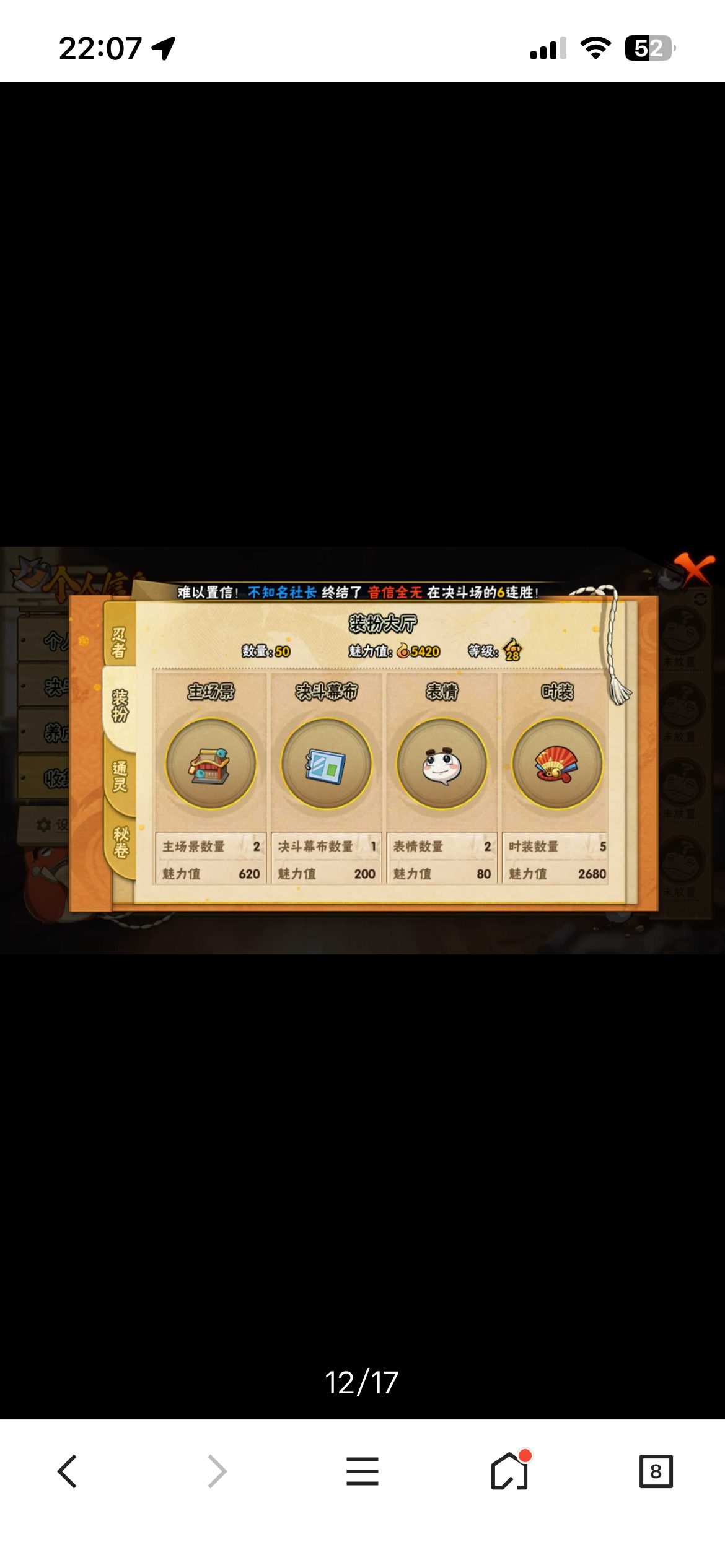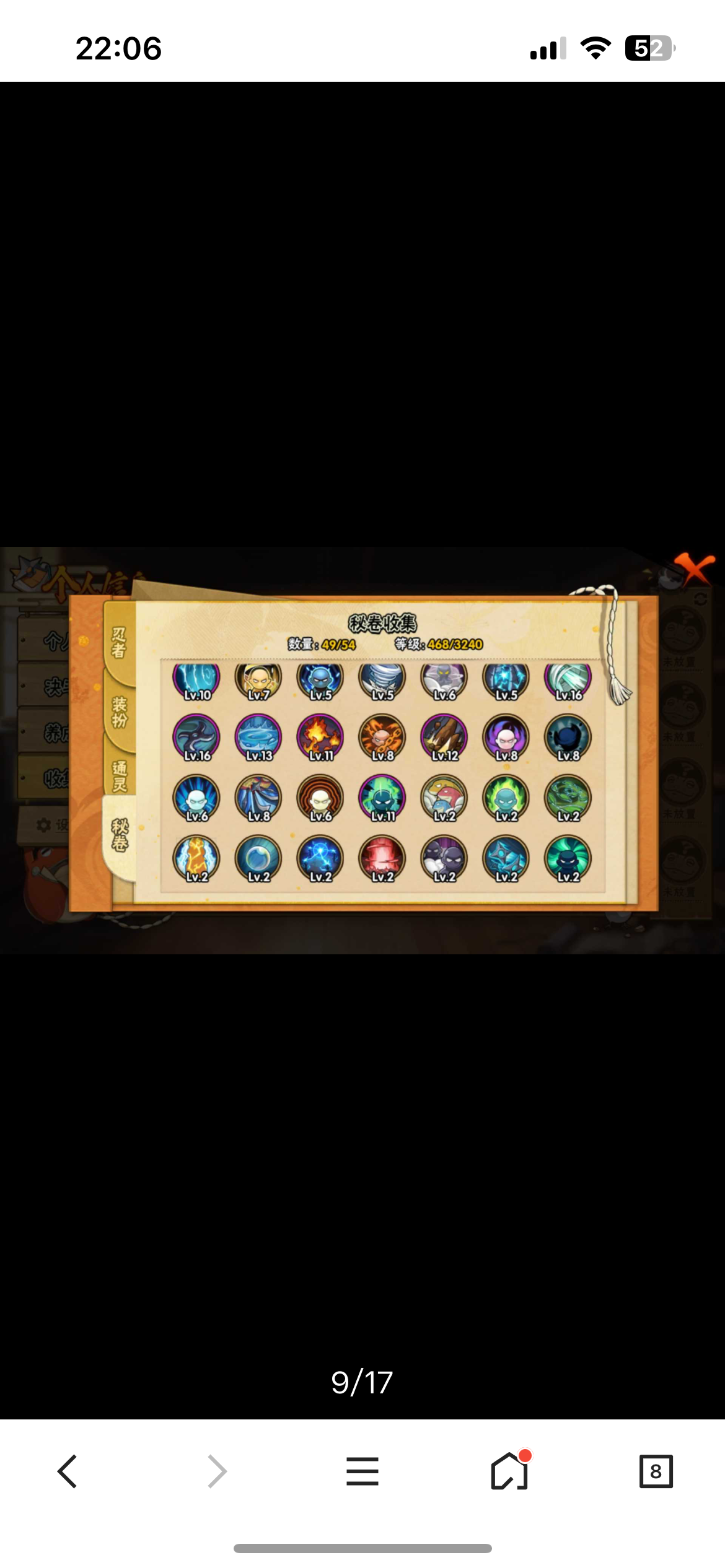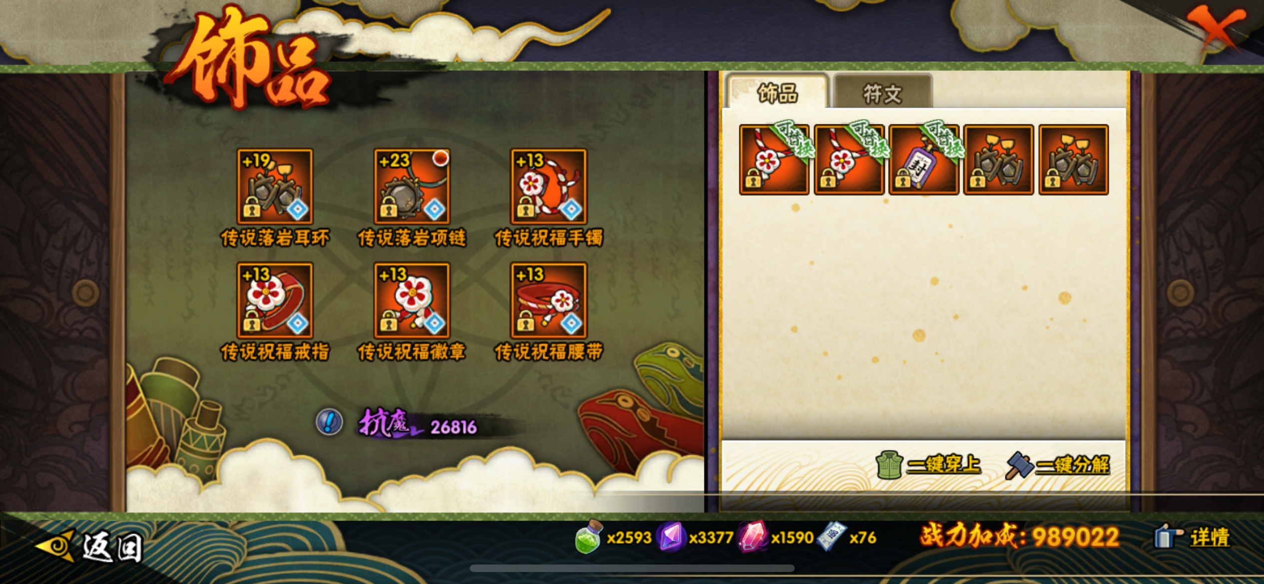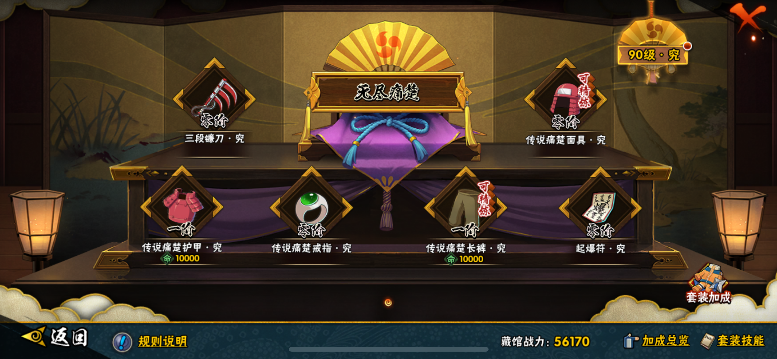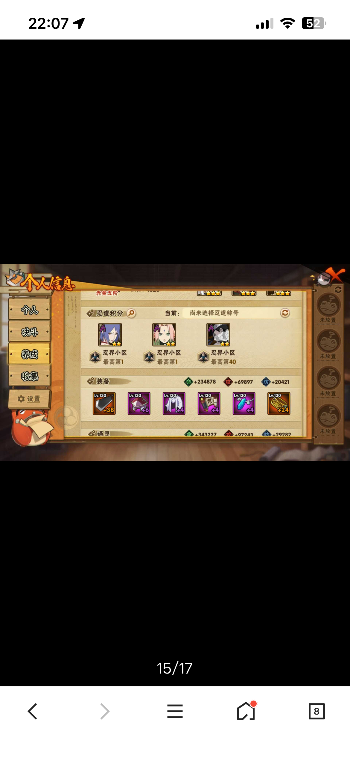 913区高战力号,忍者不多,战力方面玩得很好,战力排名26名,90级满套究,饰品正在做祈愿,玩了很久的心血号,十尾带土50多片、仙人兜45片,