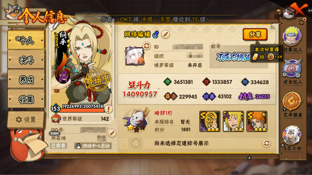 1409w战力超哥创柱无29S+鲛肌蝎创生20直购64A/绿牛84碎片/名片赤夜之影