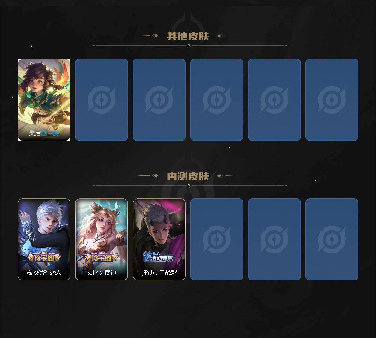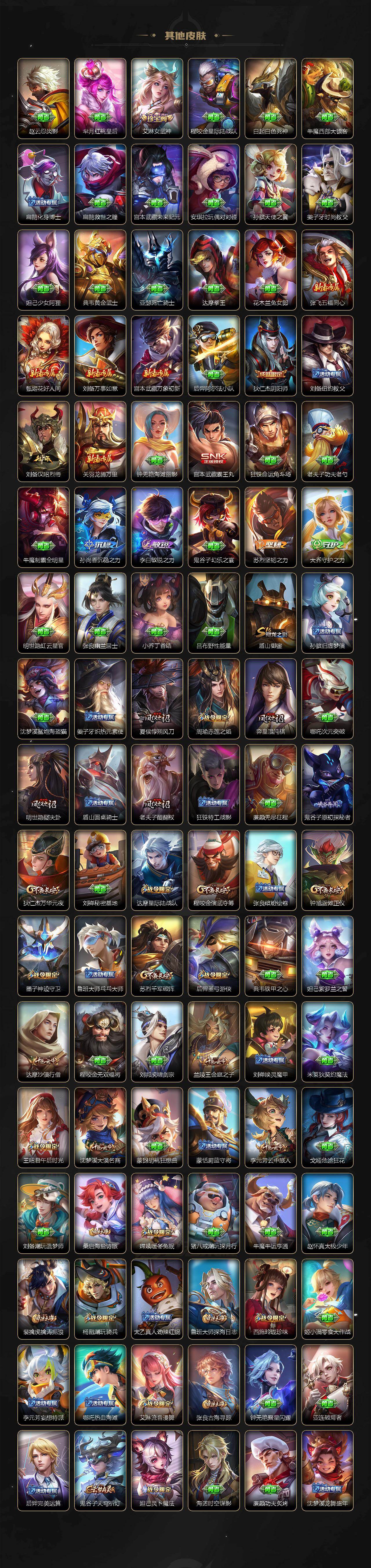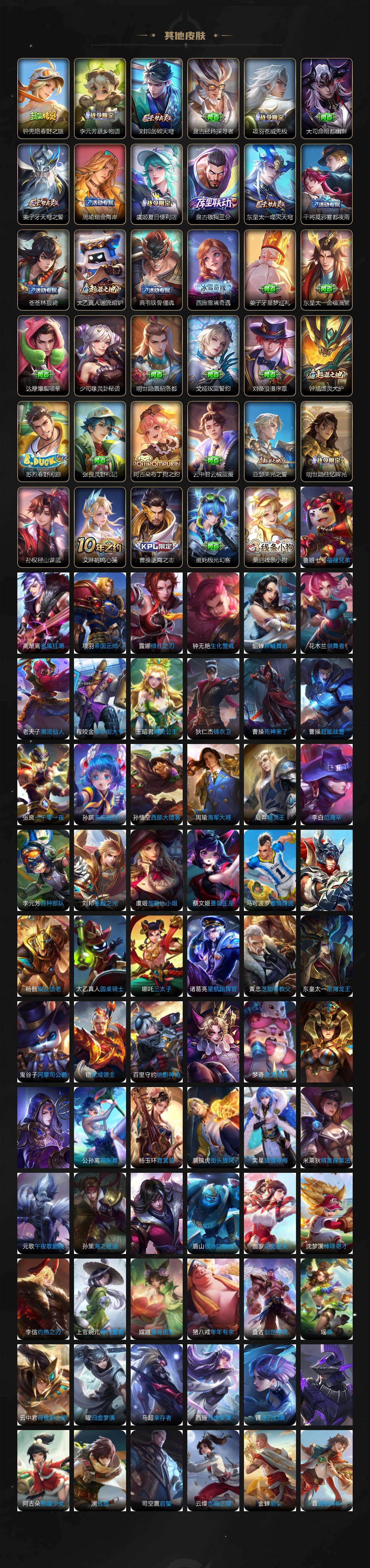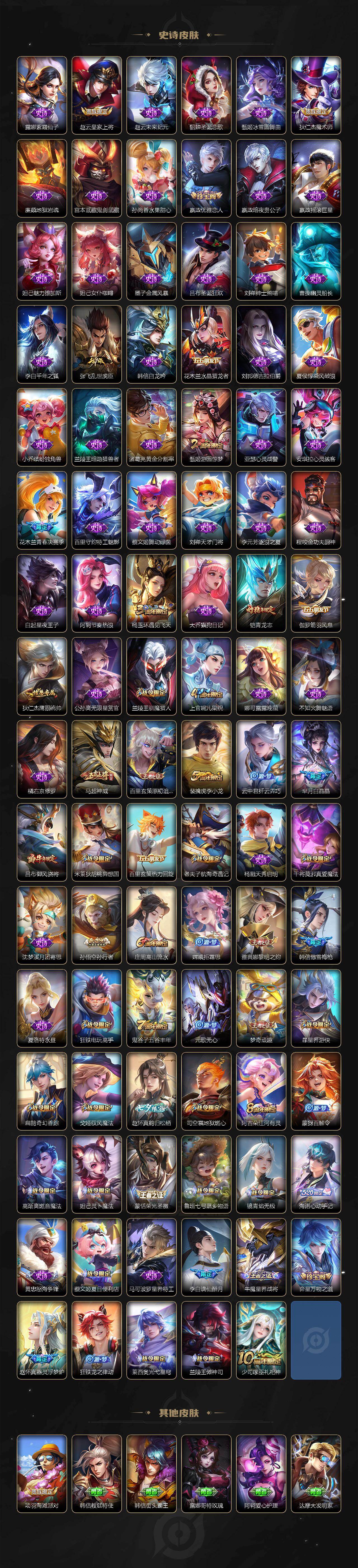 【传说皮肤】:后羿神树通天,司空震愿照山河定,女娲愿照千秋盛,云缨幻光神枪,桑启鸣野蒿,孙策乘龙淬吴钩,赵云乘龙铭钟鼎,澜逐花归海,大乔时之奇旅,吕布遇见神鼓,曜山海苍雷引,裴擒虎寅