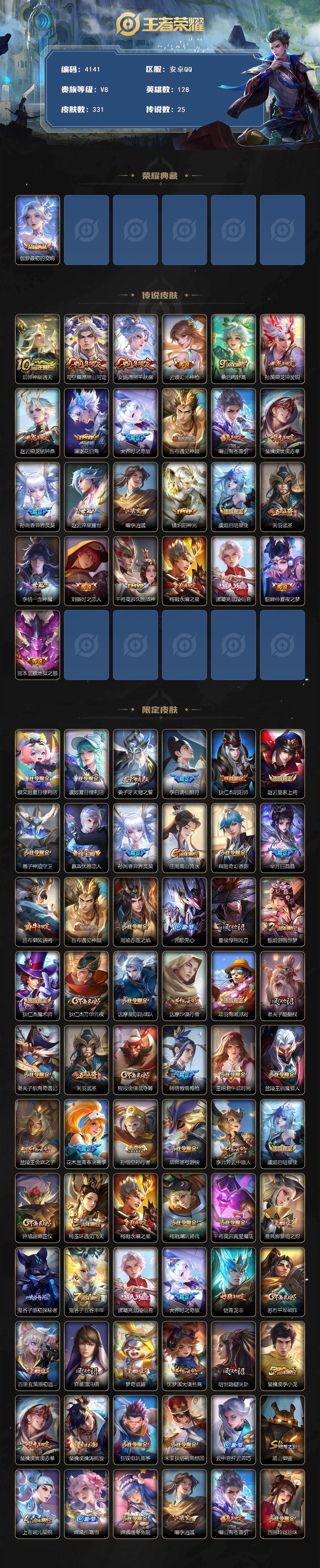 安卓Q-V8-永恒钻石V段位-128英雄-331皮肤-1典藏皮肤-25传说-94史诗