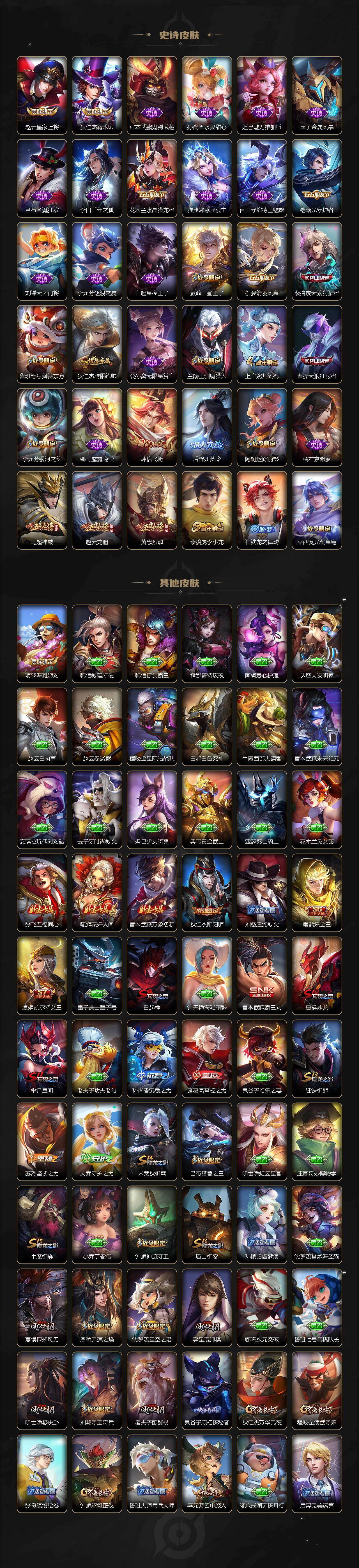 【限定皮肤】:白起狰,虞姬夏日便利店,狄仁杰阴阳师,虞姬凯尔特女王,赵云皇家上将,赵云龙胆,嬴政白昼王子,鲁班七号狮舞东方,阿轲迷踪丽影,扁鹊炼金王,芈月重明,吕布猎兽之王,周瑜赤莲