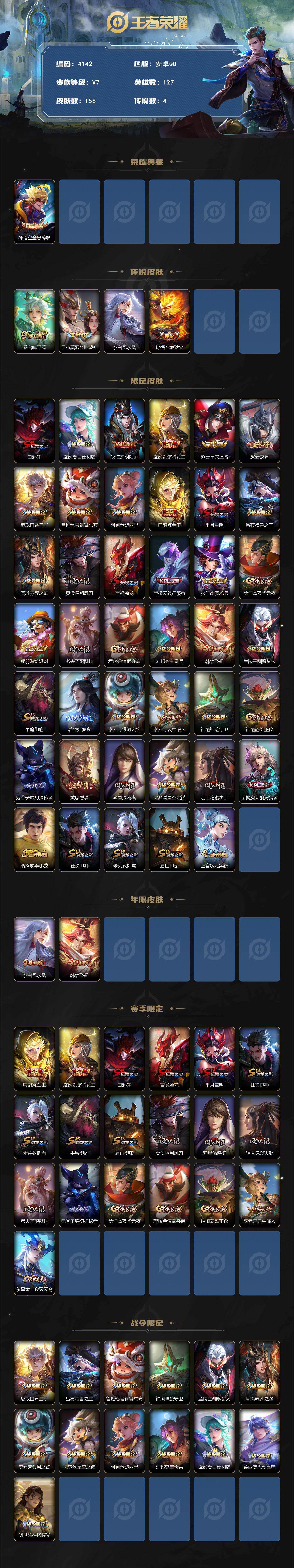 安卓Q-V7-至尊星耀IV段位-127英雄-158皮肤-1典藏皮肤-4传说-36史诗