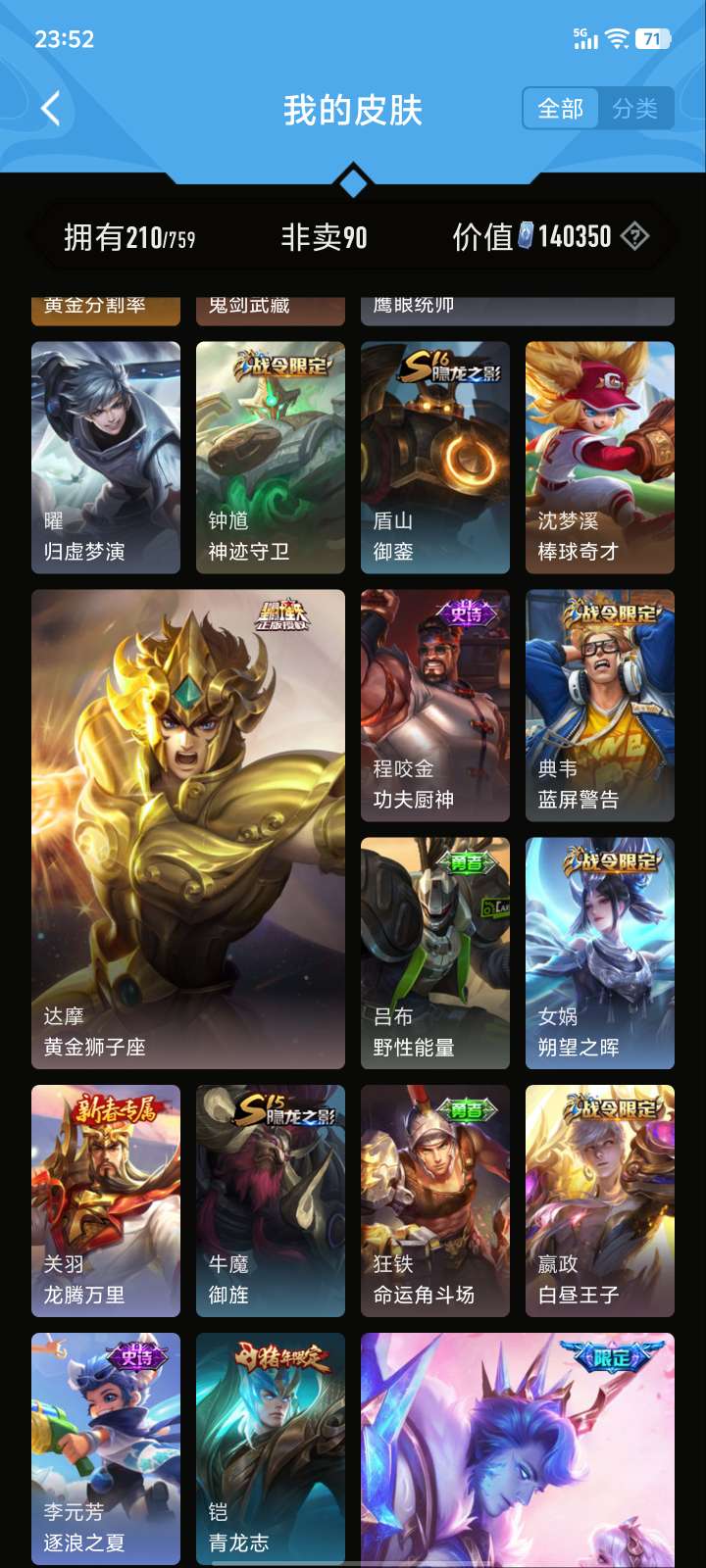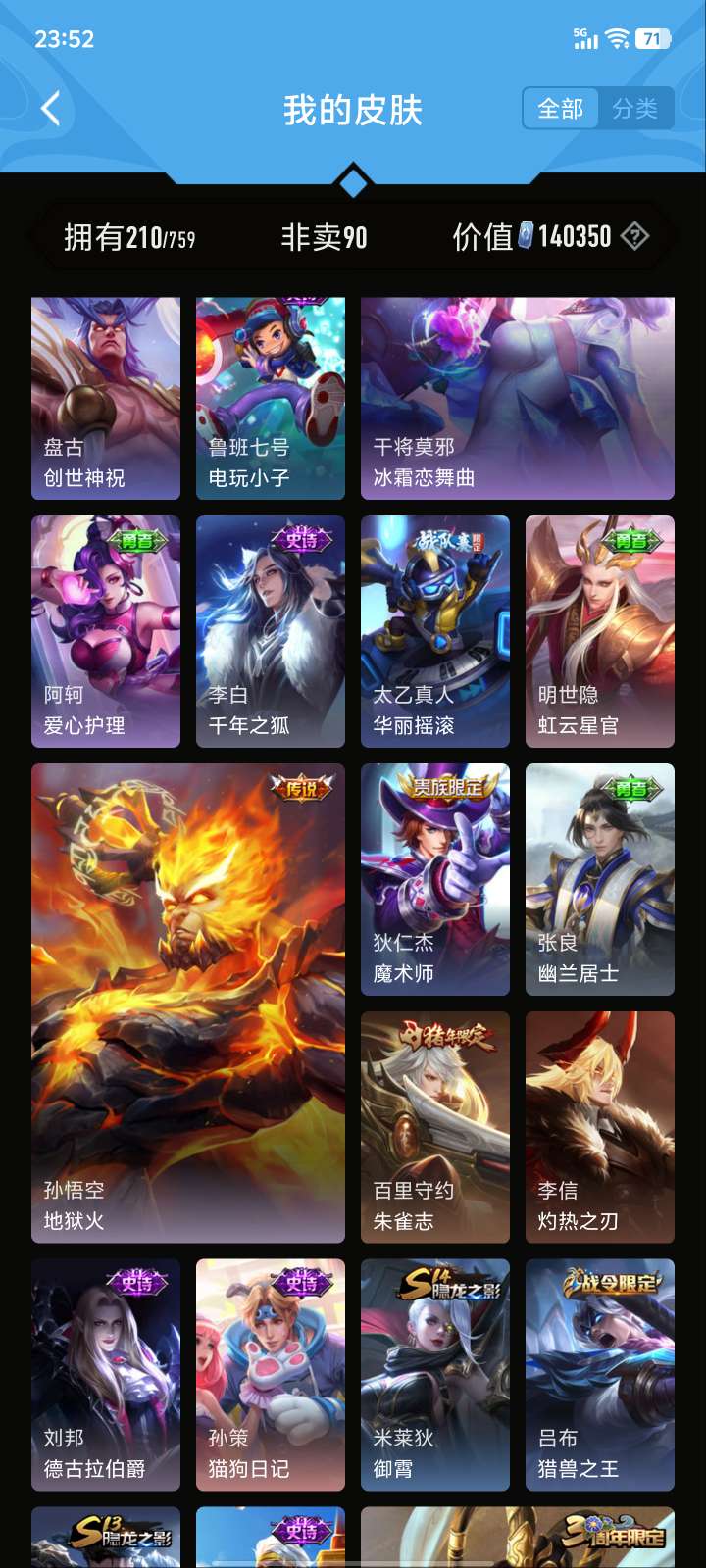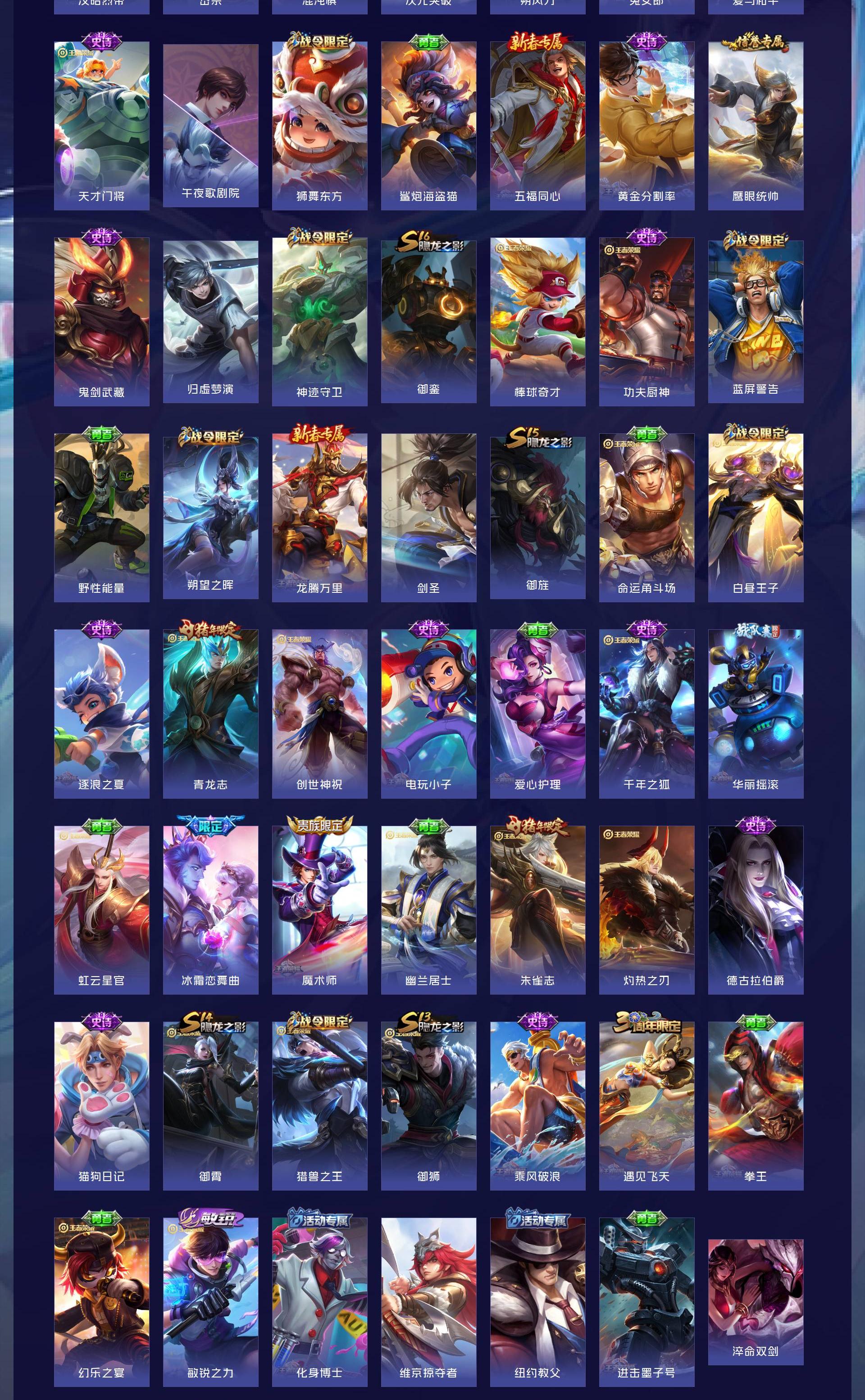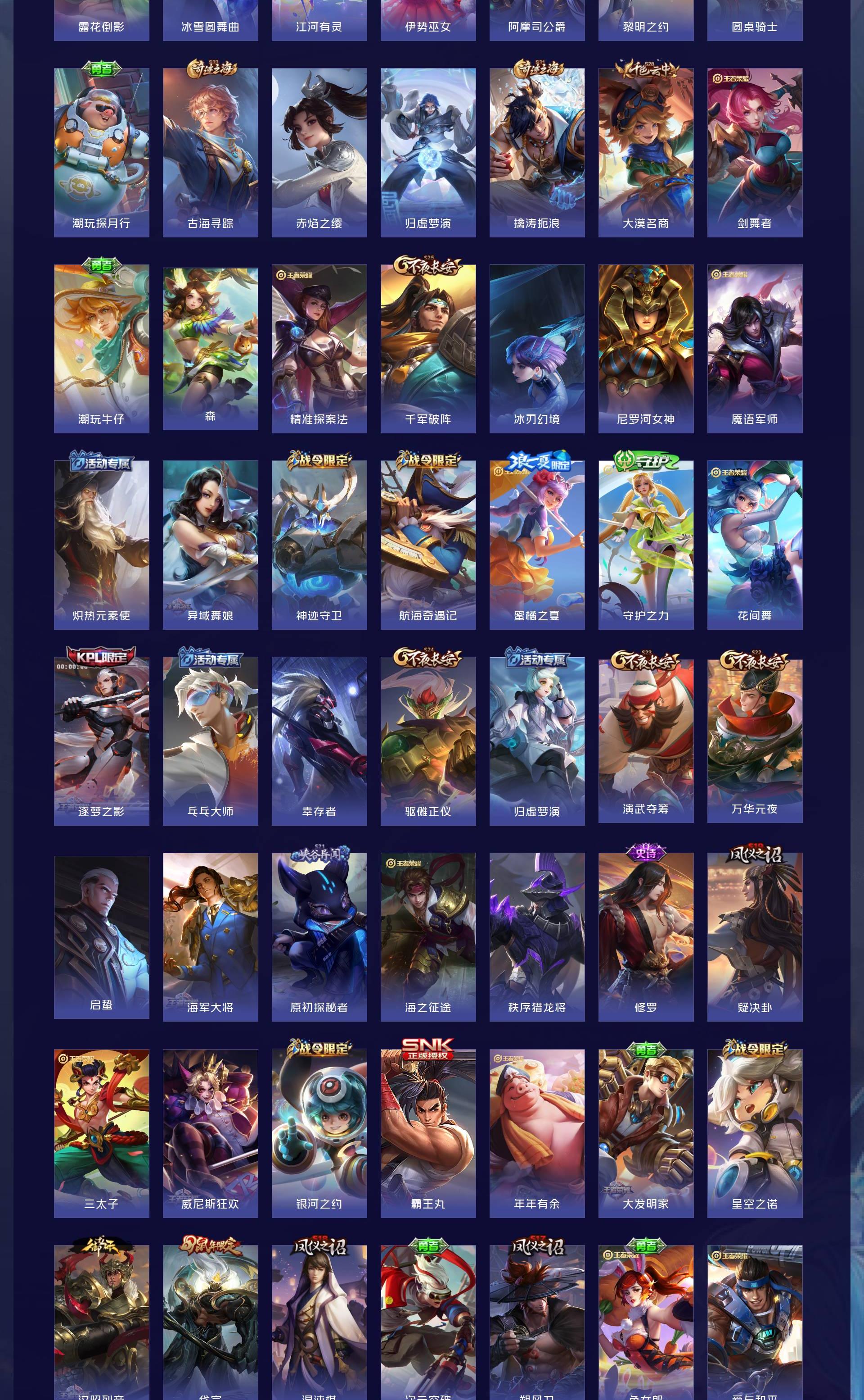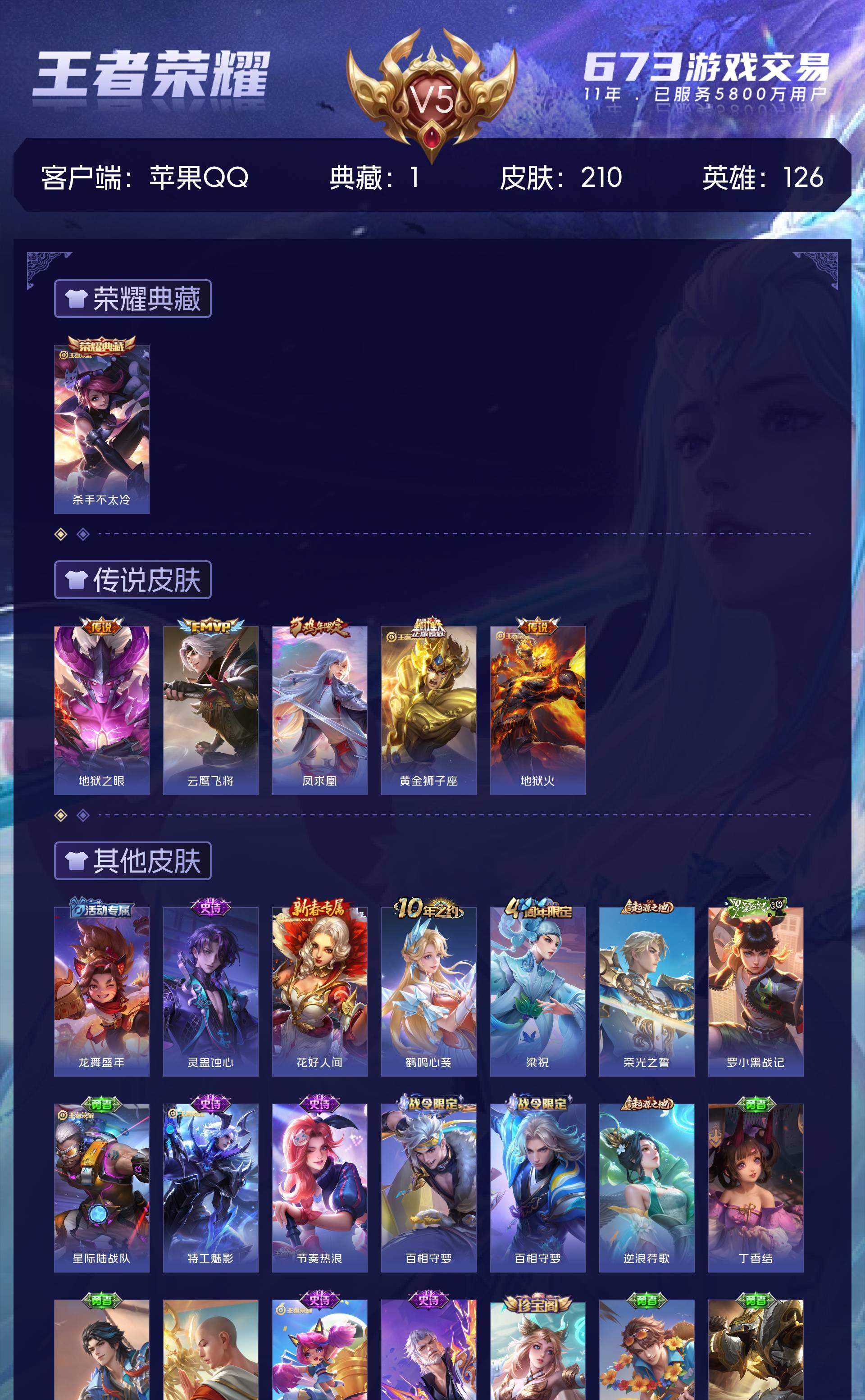 V5 皮肤210 英雄126 至尊星耀 荣耀典藏1 星传说1 传说5 其他皮肤210