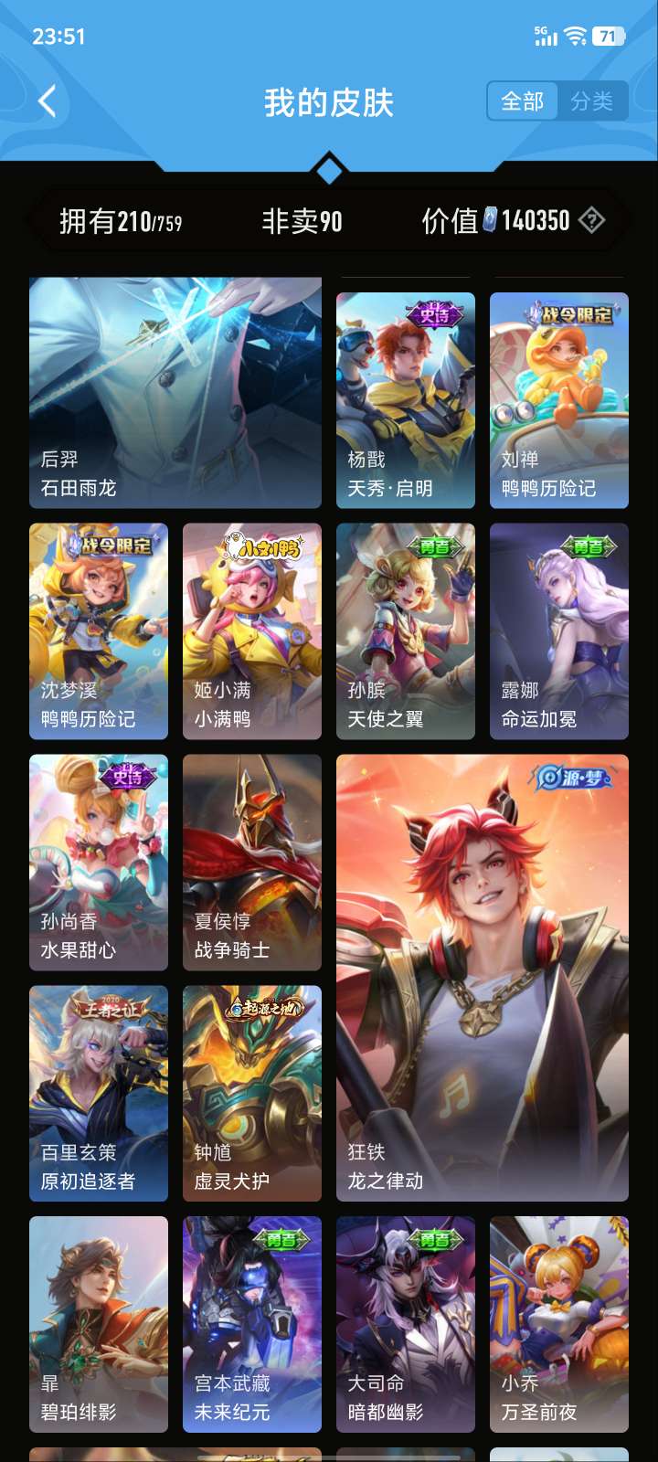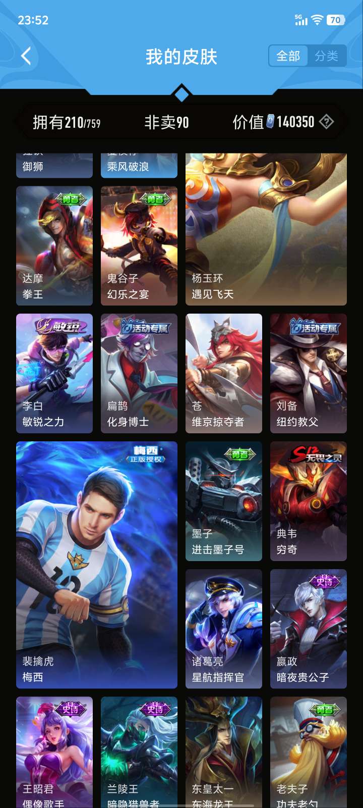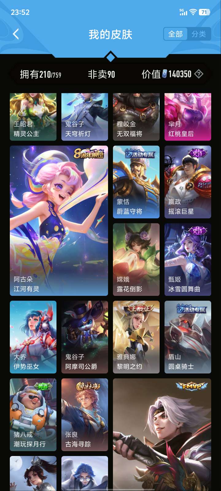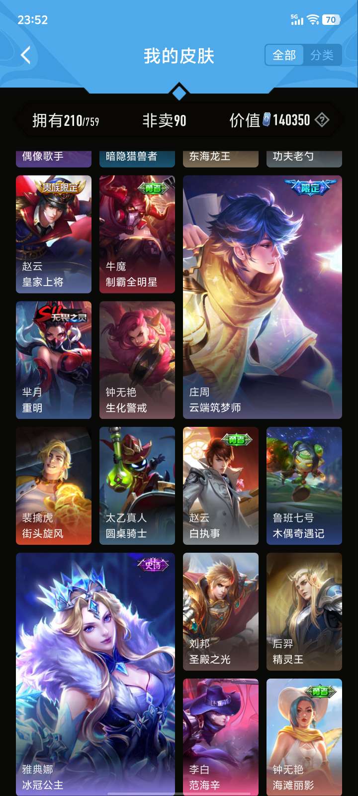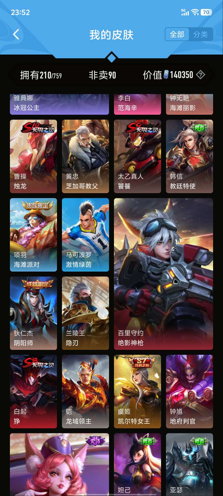 V5 皮肤210 英雄126 至尊星耀 荣耀典藏1 星传说1 传说5 其他皮肤210