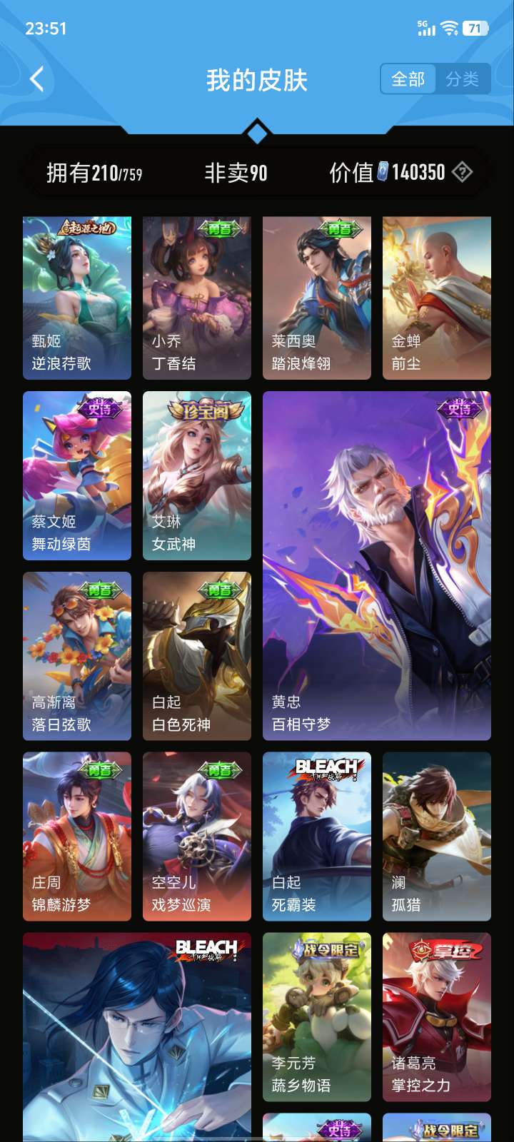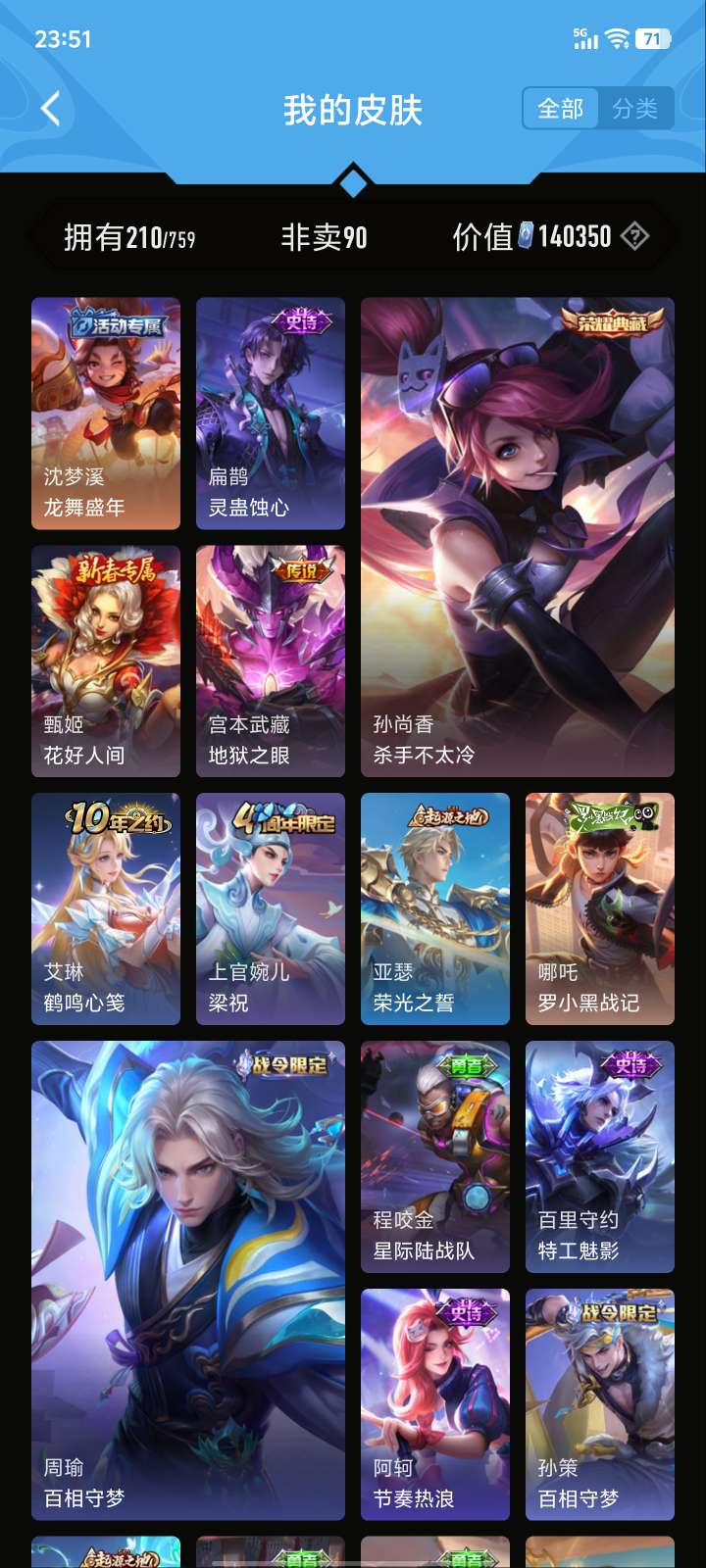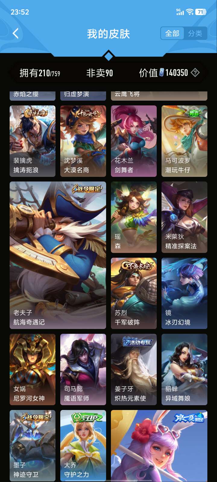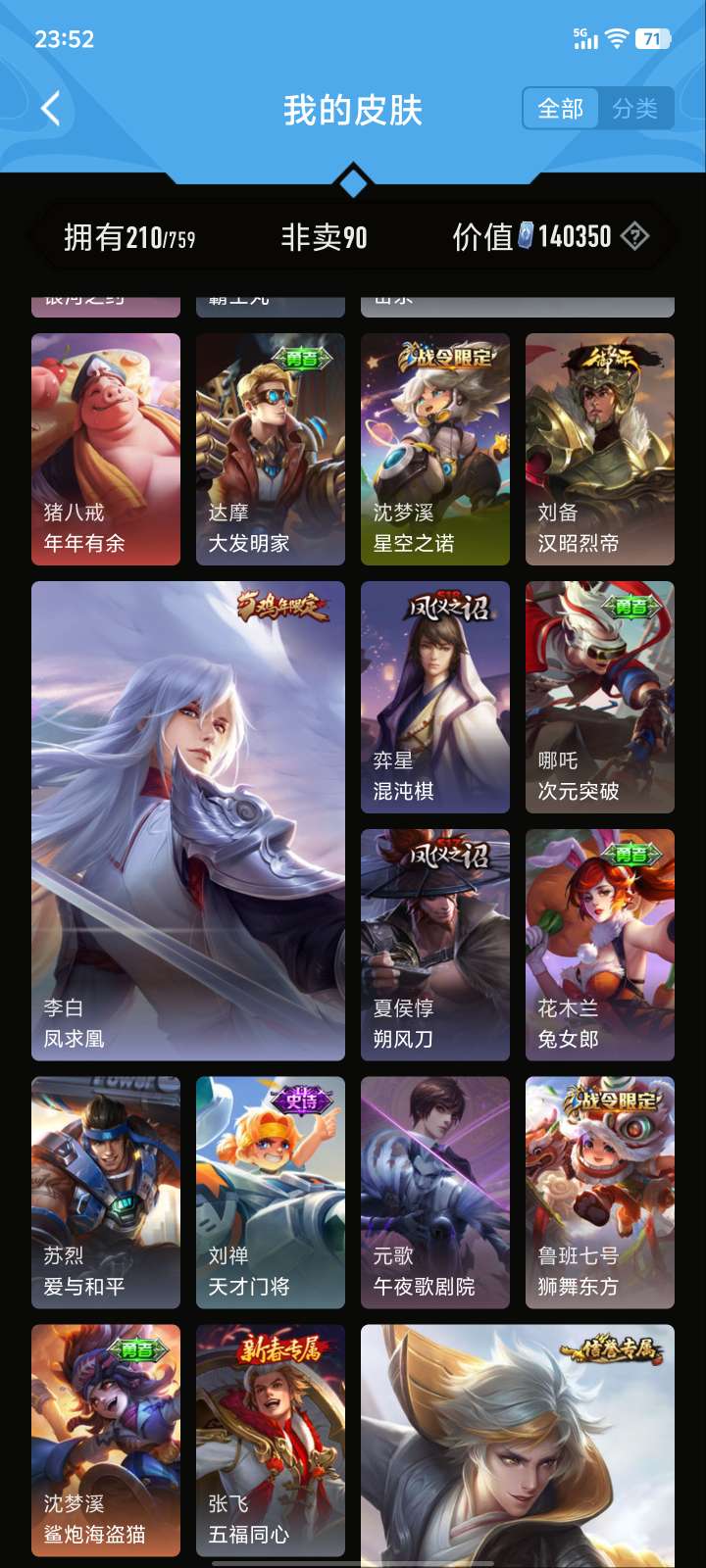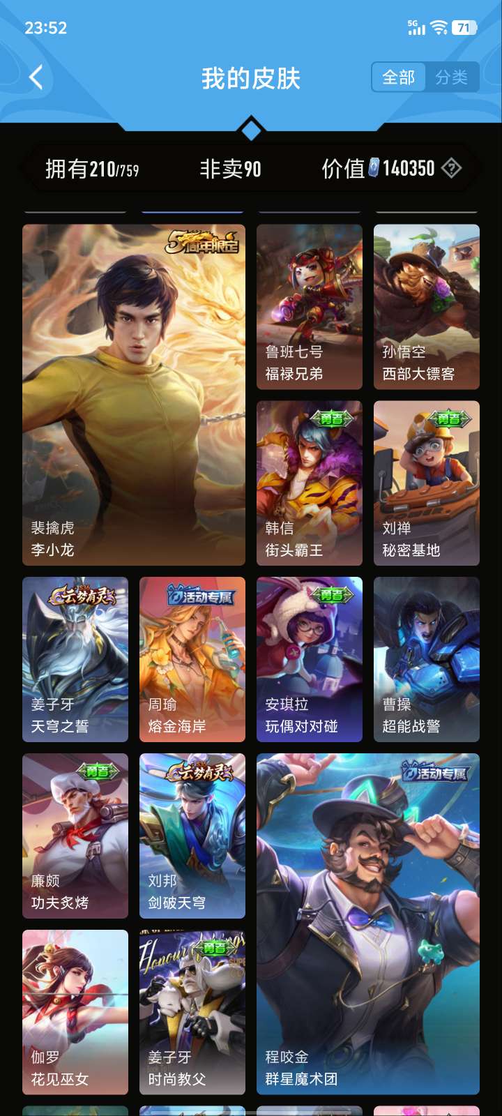 V5 皮肤210 英雄126 至尊星耀 荣耀典藏1 星传说1 传说5 其他皮肤210
