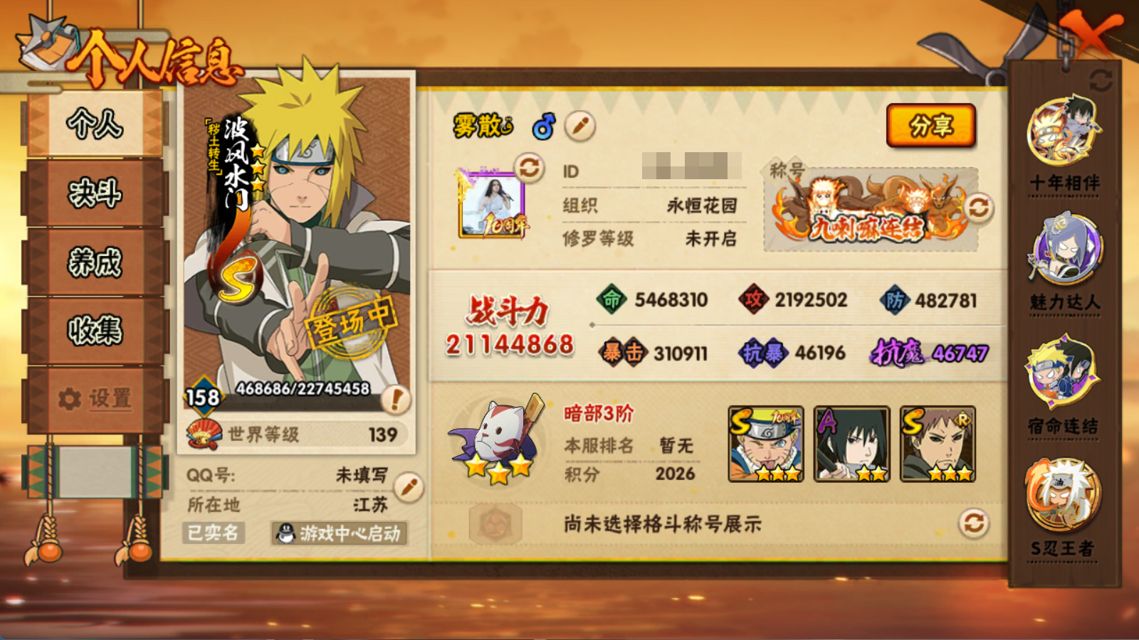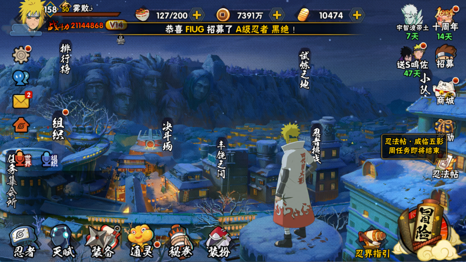 氪1.3W本服榜18!2114W战力 超哥 三代风 创斑 破面40S+298点券鸡翅+面麻 侠隐佐助 盾狗 飘带9个198直购53A+5直购通灵+最终章主场景+2紫皮