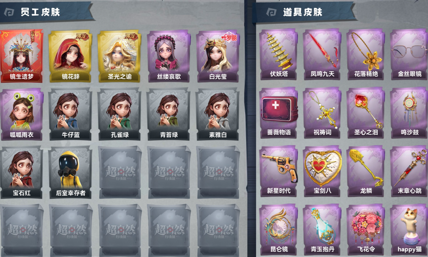 ZR206,红皮:1,金皮:2,紫皮:3,道具皮:19,铲铲币:238w,累充:15900金砖,幻梦皮肤:巫铃儿-镜生遗梦,金色皮肤:薇薇安-圣光之谕、巫铃儿-镜花辞,紫色皮肤:薇薇安-白光莹、爱丽丝-丝缕哀歌、小黄-呱呱雨衣,员工:小黄、爱丽丝、零、阿念、逍遥、薇薇安、巫铃儿、莉莉、艾伦、爱德华、兰、小满,道具皮肤:传送按钮-昆仑镜、夜视仪-金丝眼镜、音响-happy猫、音响-鸣沙鼓、葫芦-伏妖
