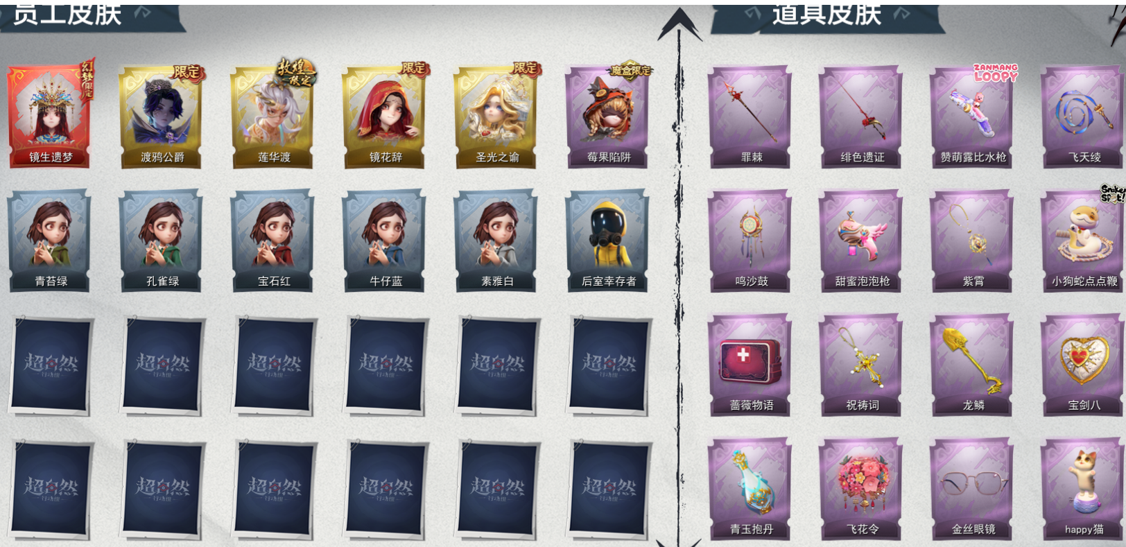 ZR212红皮:1,金皮:4,紫皮:1,道具皮:23,铲铲币:5315w,累充:20680金砖,幻梦皮肤:巫铃儿-镜生遗梦,金色皮肤:零-渡鸦公爵、逍遥-莲华渡、薇薇安-圣光之谕、巫铃儿-镜花辞,紫色皮肤:莉莉-莓果陷阱,员工:小黄、爱丽丝、零、阿念、逍遥、薇薇安、巫铃儿、莉莉、艾伦、兰,道具皮肤:铲子-龙鳞、桃木剑-绯色遗证、摸金符-祝祷词、音响-happy猫、桃木剑-凤鸣九天、夜视仪-金丝眼镜