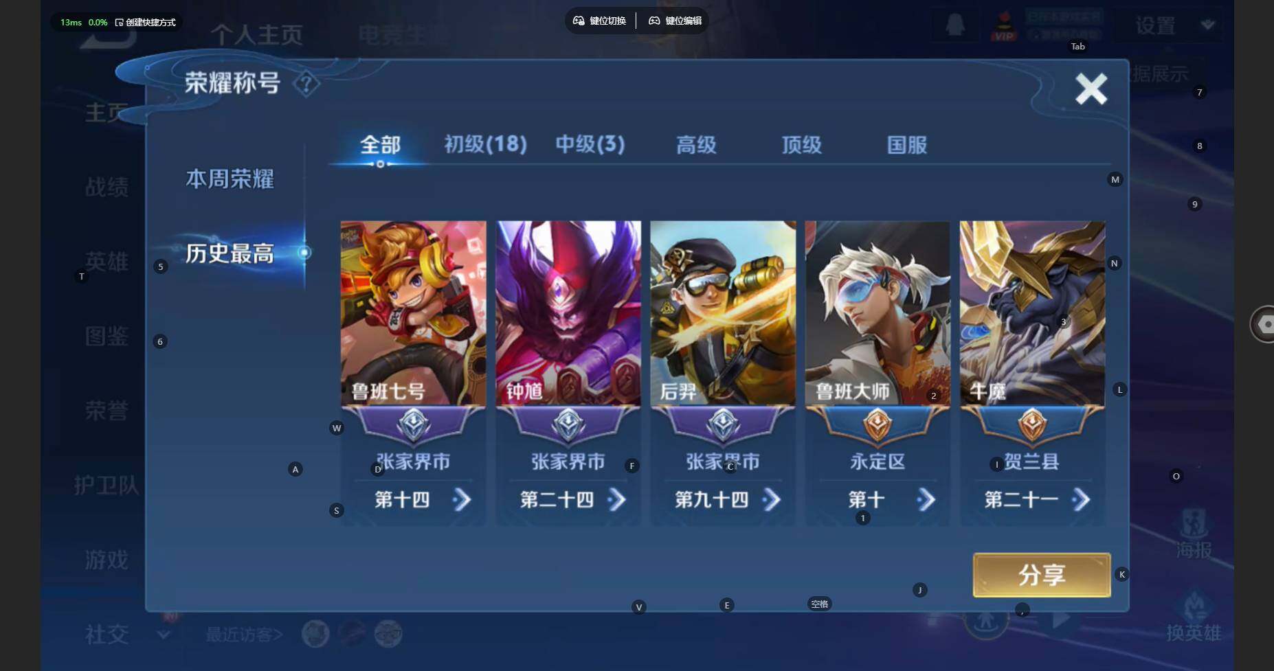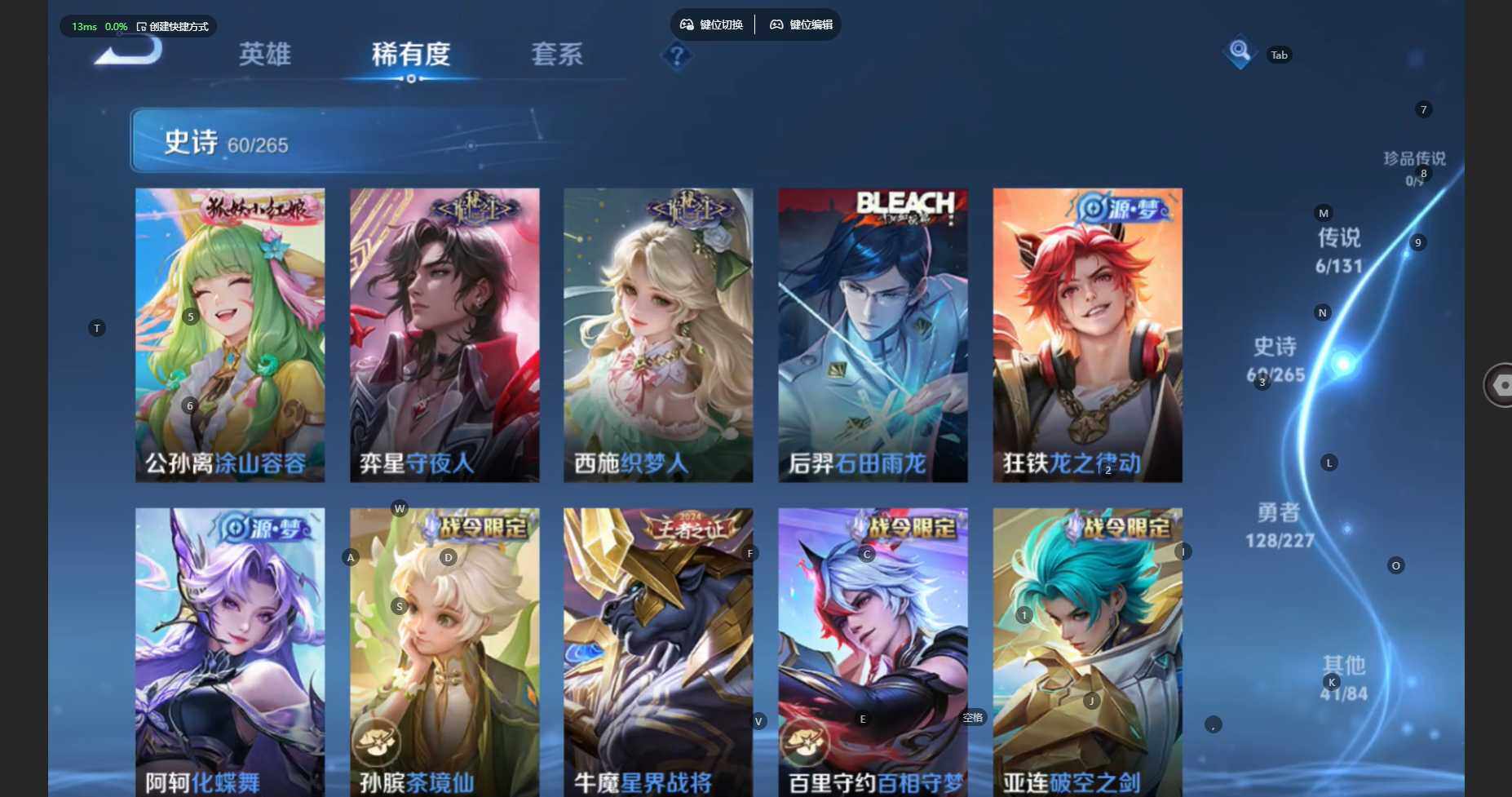 苹果Q-V7-最强王者段位-127英雄-236皮肤-1典藏皮肤-6传说-76限定-7印记-6按键