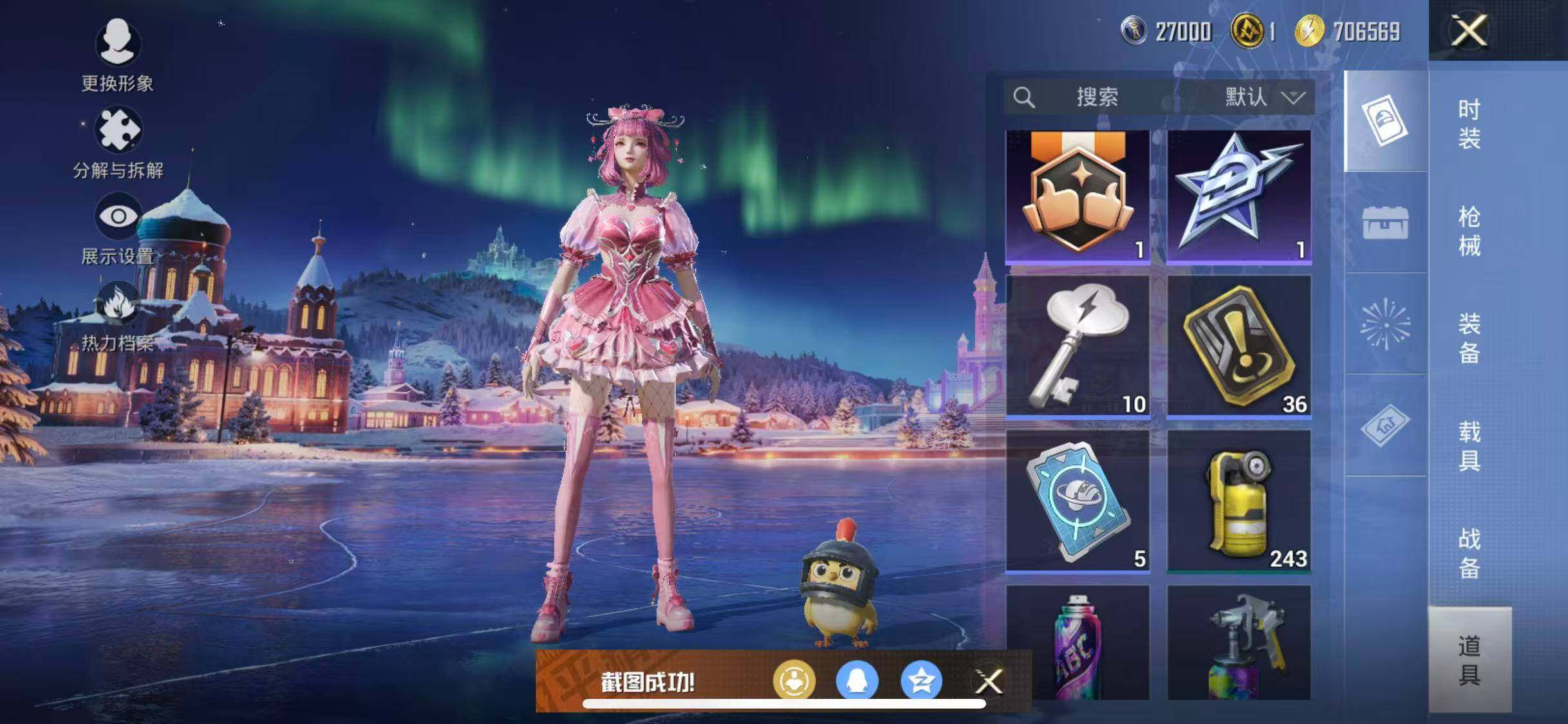 苹果,手Q-3粉装-3特效枪-0载具-1粉色飞行器-50658热力值-17王牌