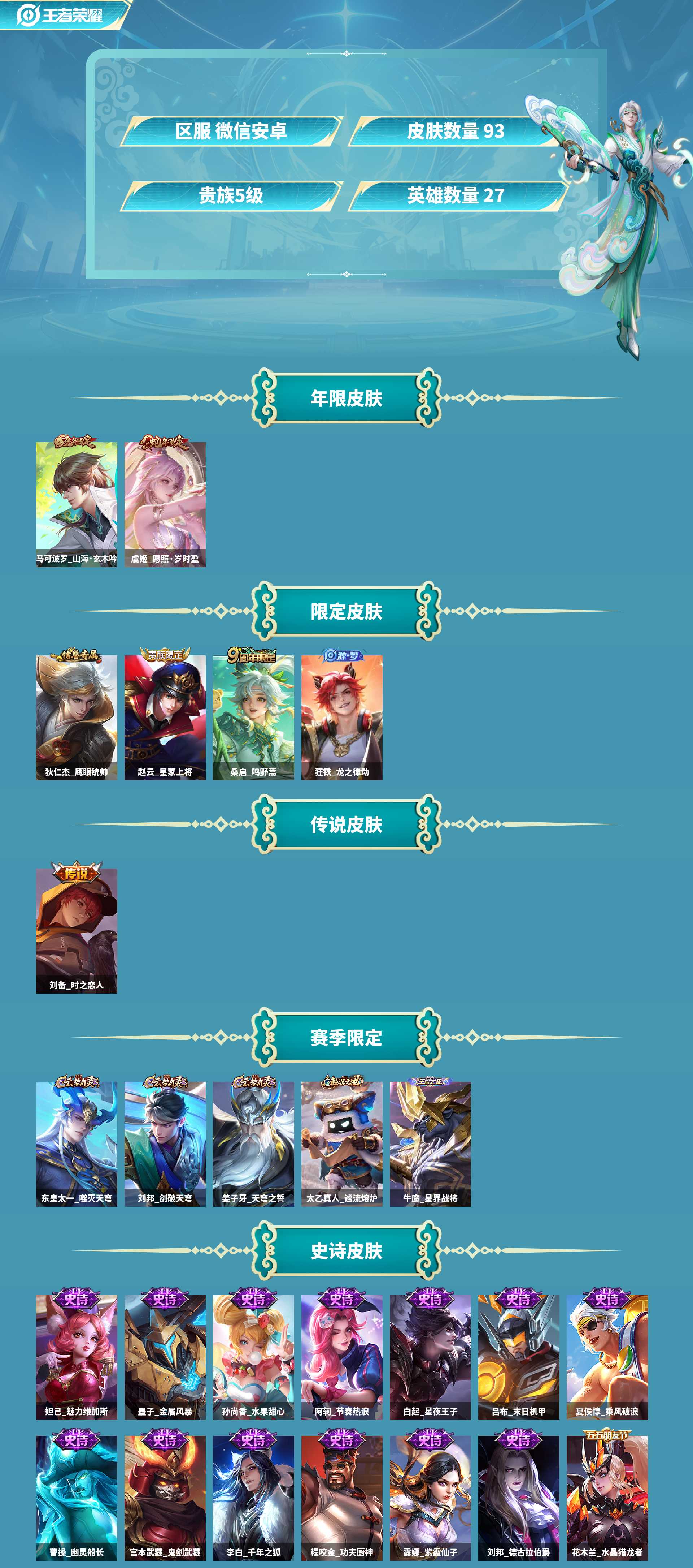 小号微信一切正常,安全靠谱!王者成品号皮肤数93传说皮肤数3