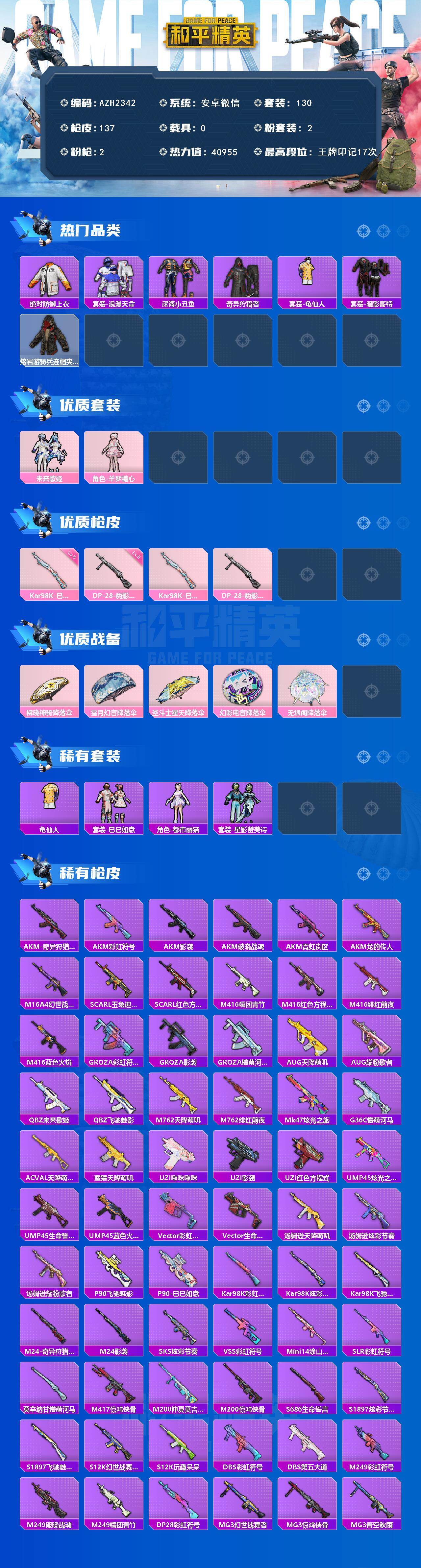 【AZH2342】安卓 微信【17印记 羊梦糖心巡查衣暗影哥特深海小丑鱼】2粉装-2特效枪-0载具-0粉色飞行器-40955热力值-17王牌印记-130套装-137枪皮