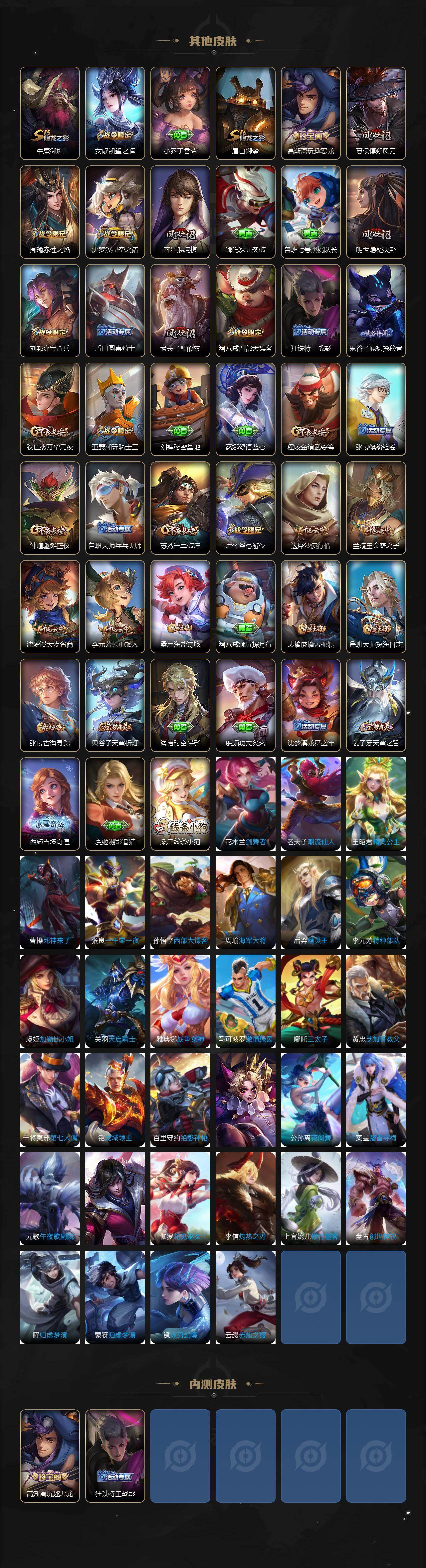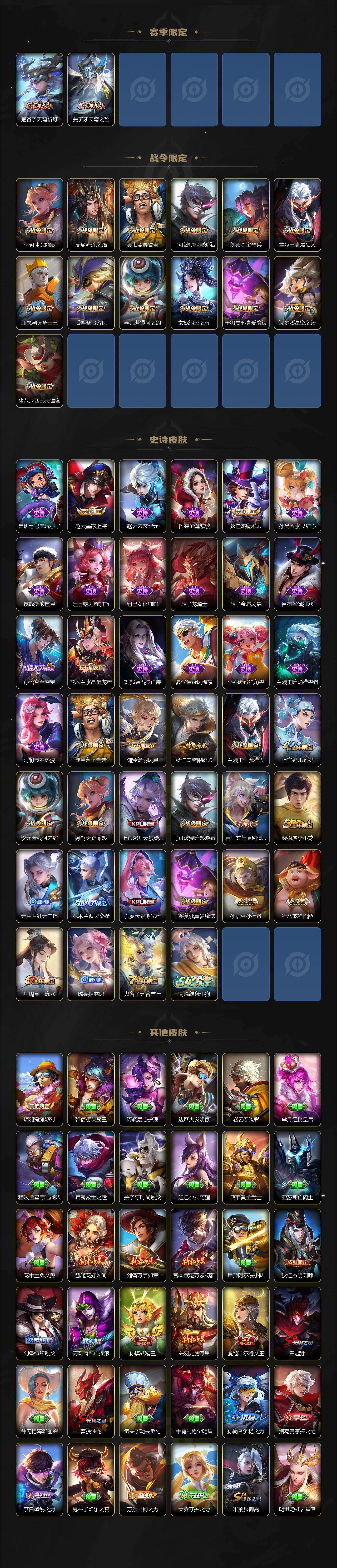 【限定皮肤】:白起狰,姜子牙天穹之誓,狄仁杰阴阳师,虞姬凯尔特女王,赵云皇家上将,庄周高山流水,高渐离死亡摇滚,高渐离玩趣恶龙,阿轲迷踪丽影,孙膑妖精王,周瑜赤莲之焰,夏侯惇朔风刀,曹操烛龙,典韦蓝屏警告,马可波罗暗影游猎,狄仁杰