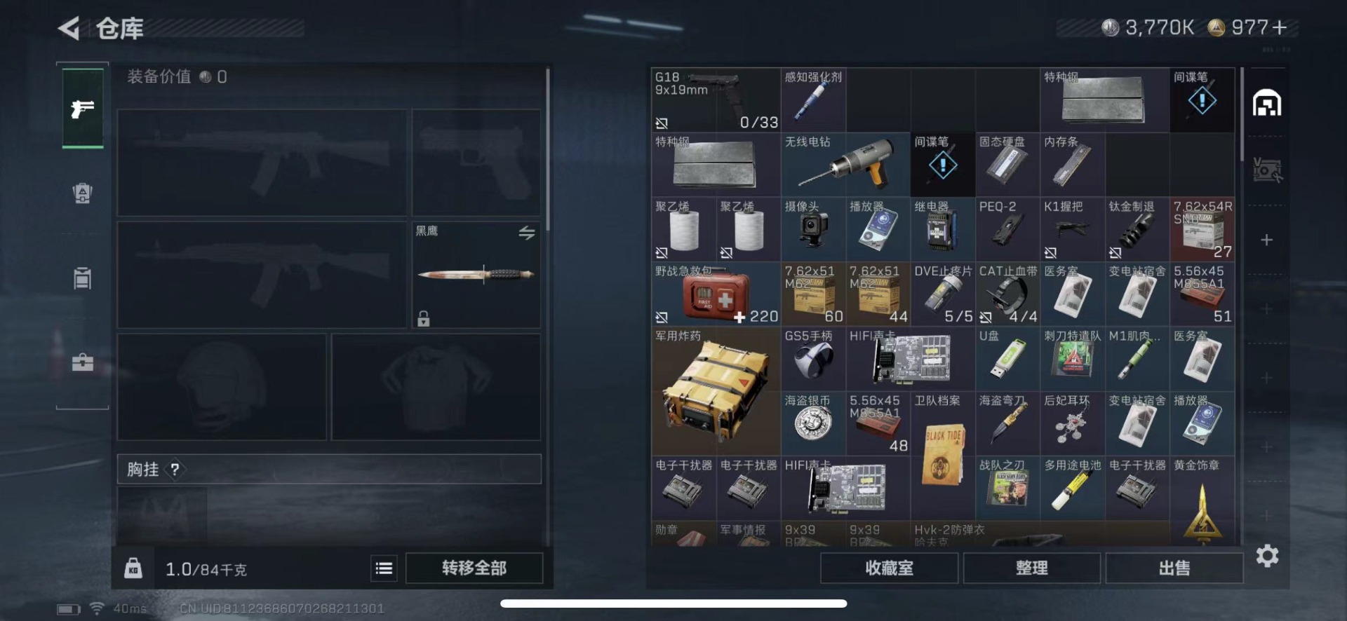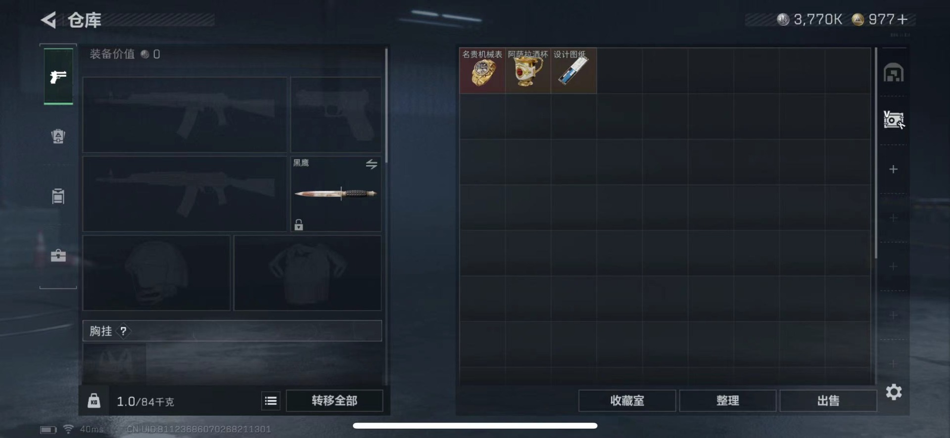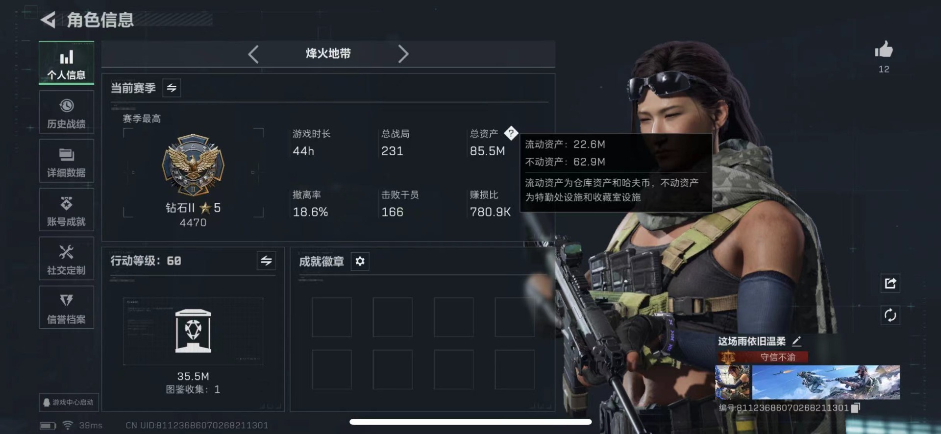 总资产:85.5M 1干员外观 16传说枪械 哈夫币:3.770K 可二次