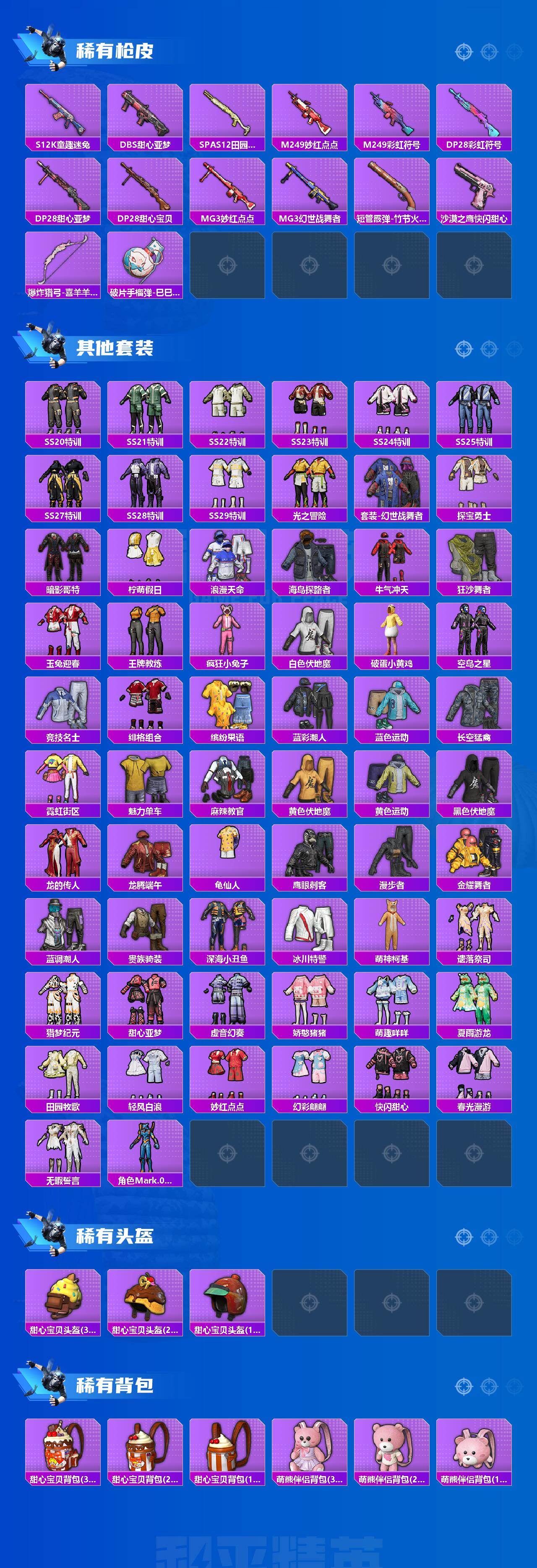 【热门品类】:套装-浪漫天命,套装-深海小丑鱼,角色-军刀雅典娜,套装-龟仙人,套装-暗影哥特,角色-Mark.06,M416-星际漫游,熔岩游骑兵连帽夹克