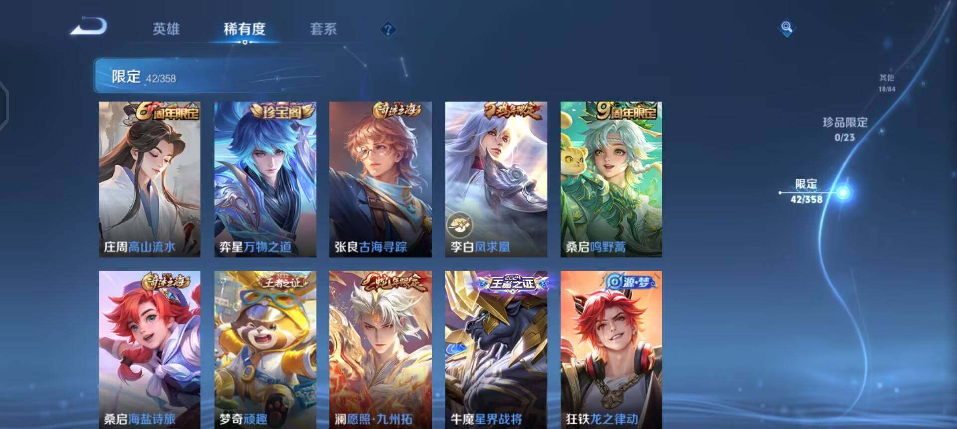 【传说皮肤】:澜愿照九州拓,桑启鸣野蒿,镜炽阳神光,干将莫邪久胜战神,虞姬云霓雀翎,达摩黄金狮子座,李白凤求凰