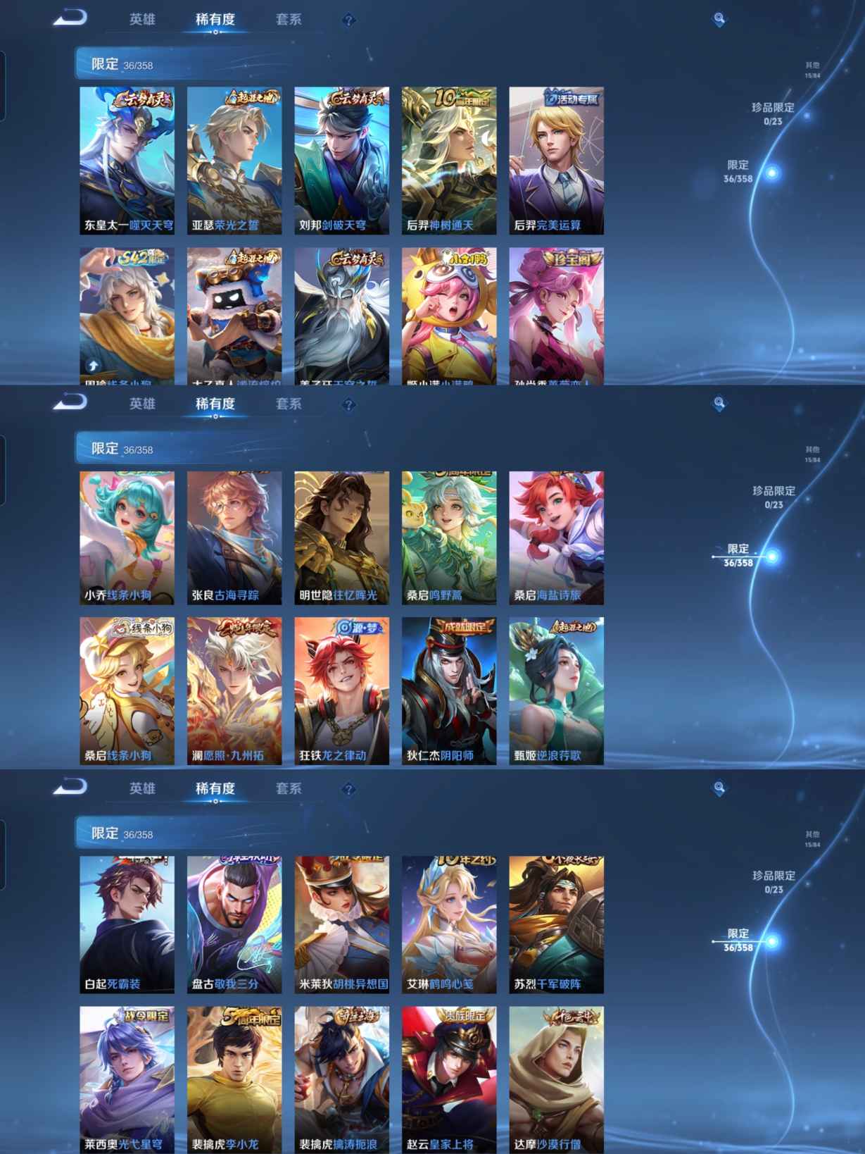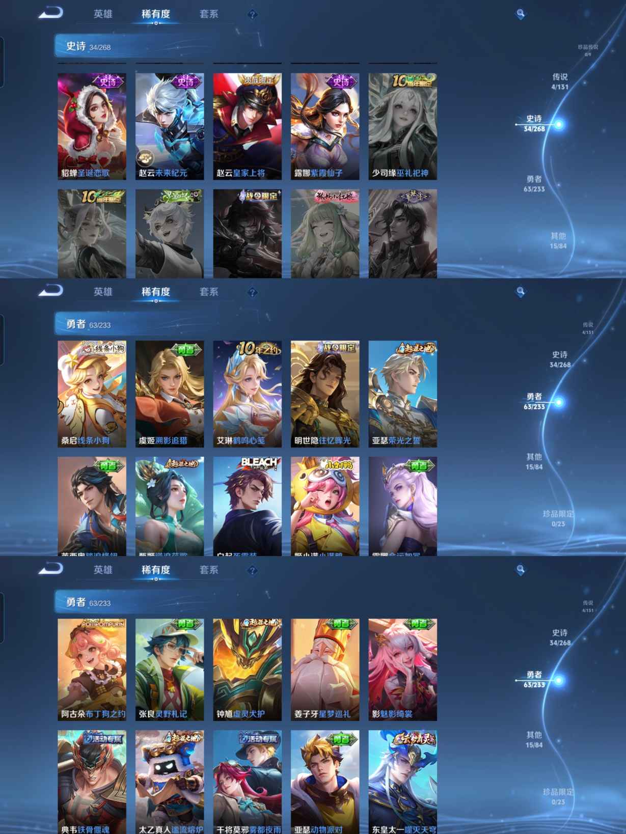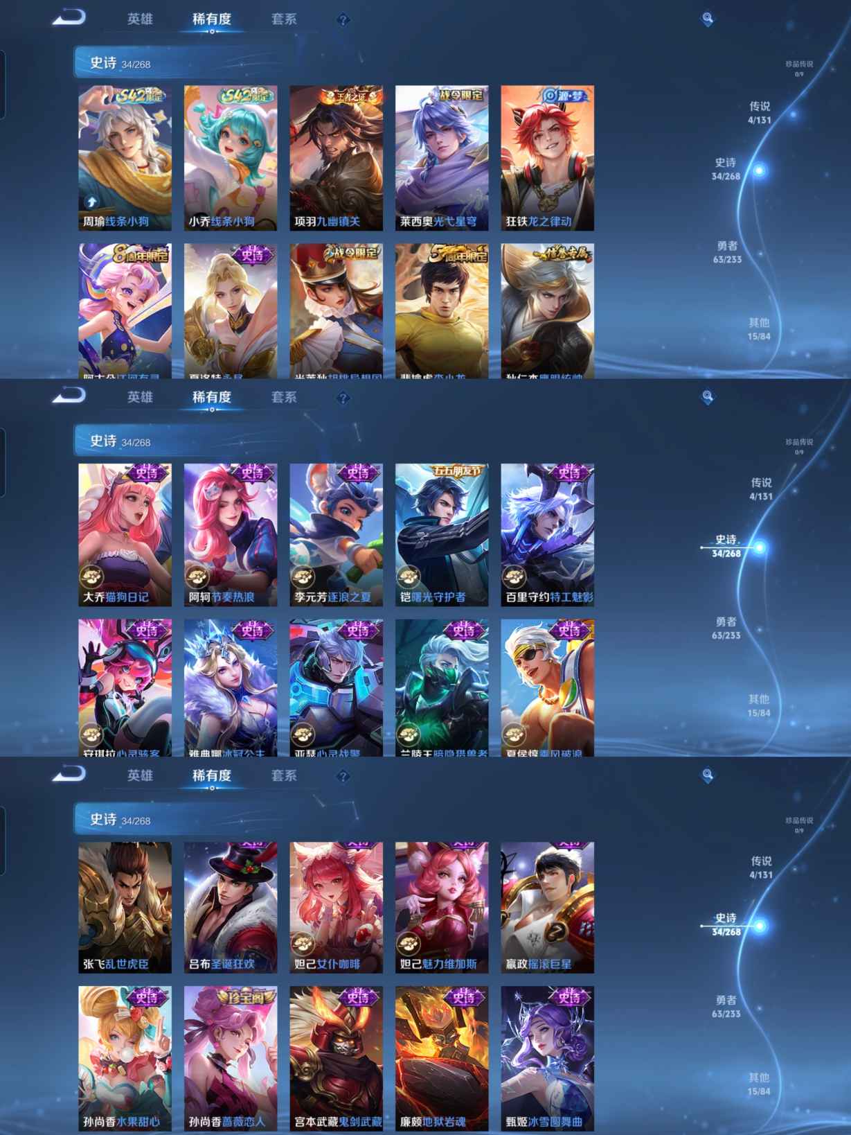 【史诗皮肤】 布丁狗之约 谧流熔炉 龙之律动 线条小狗 九幽镇关 踏浪烽翎 聚星闪耀 江河有灵 光弋星穹 女仆咖啡 魅力维加斯 猫狗日记 鹰眼统帅 圣诞恋歌 鬼剑武藏 曙光守护者 暗隐猎兽者 逐浪之夏 地狱岩魂 紫霞仙子 圣诞狂欢 胡桃异想国 李小龙 水果甜心 蔷薇恋人 乘风破浪 冰冠公主 心灵战警 摇滚