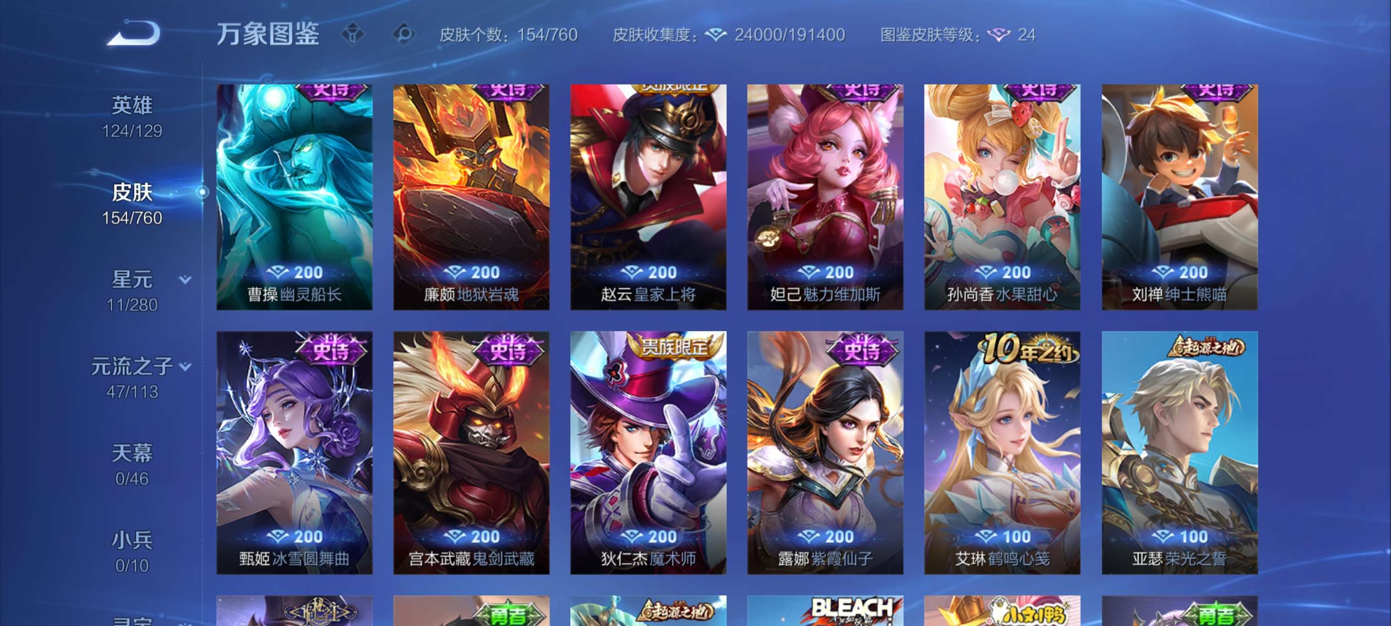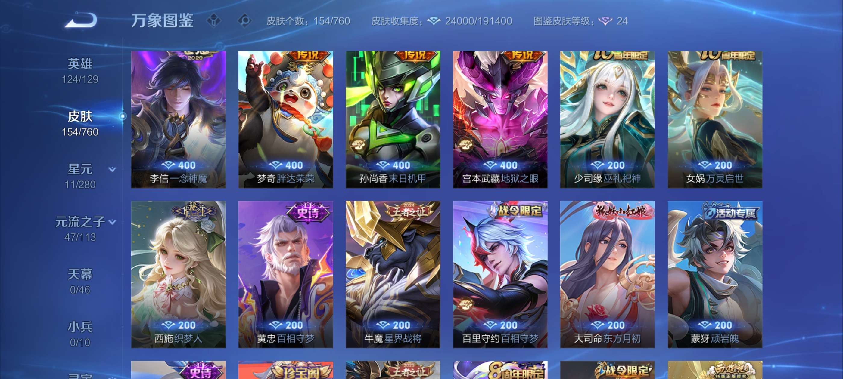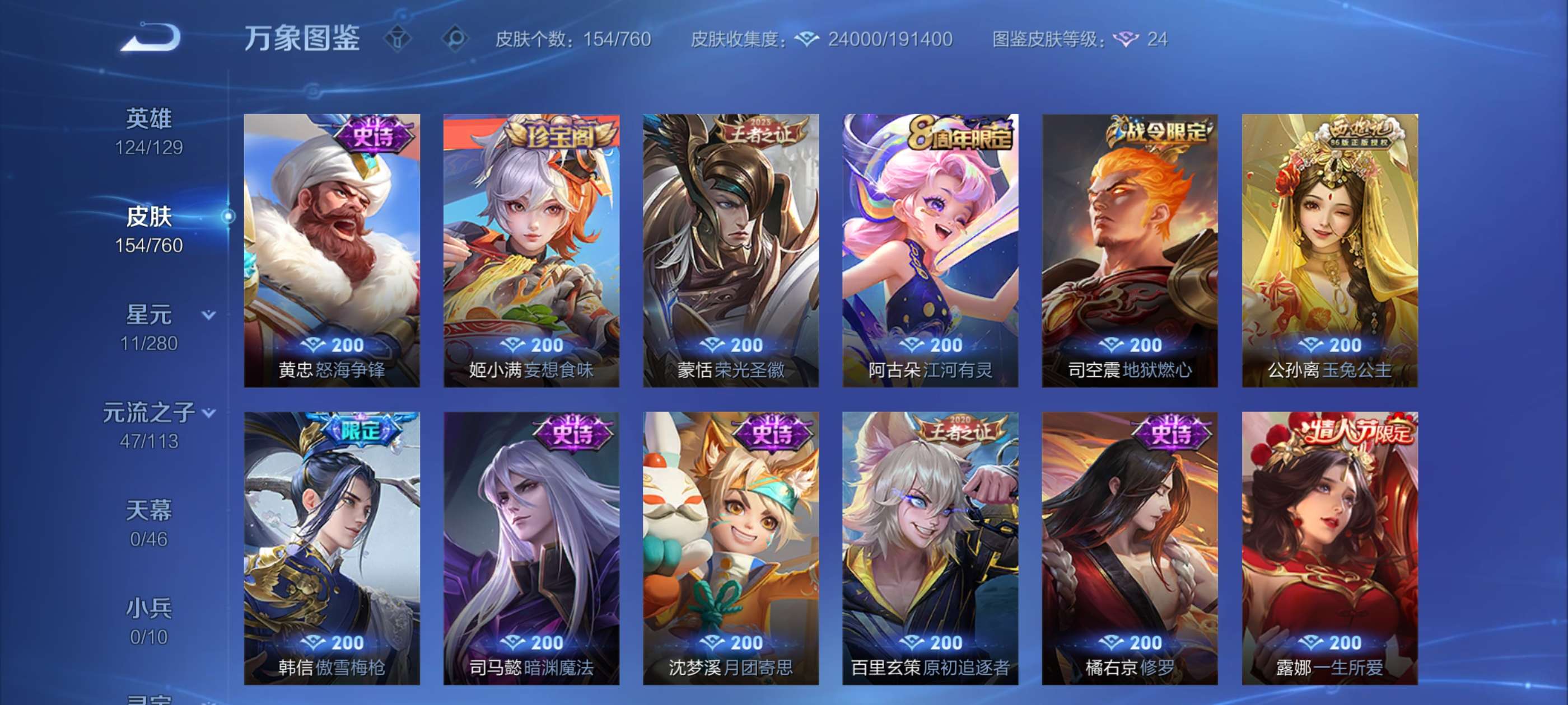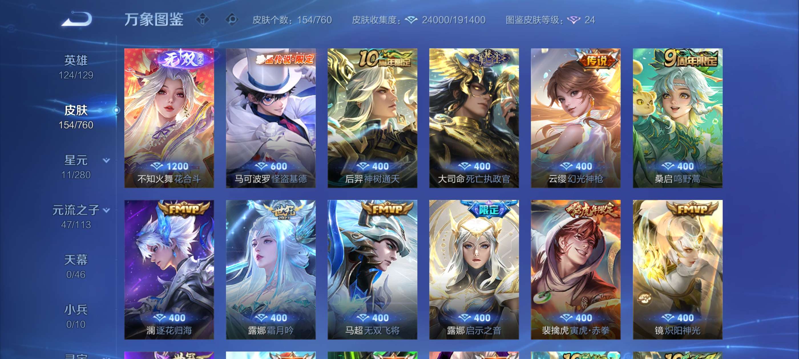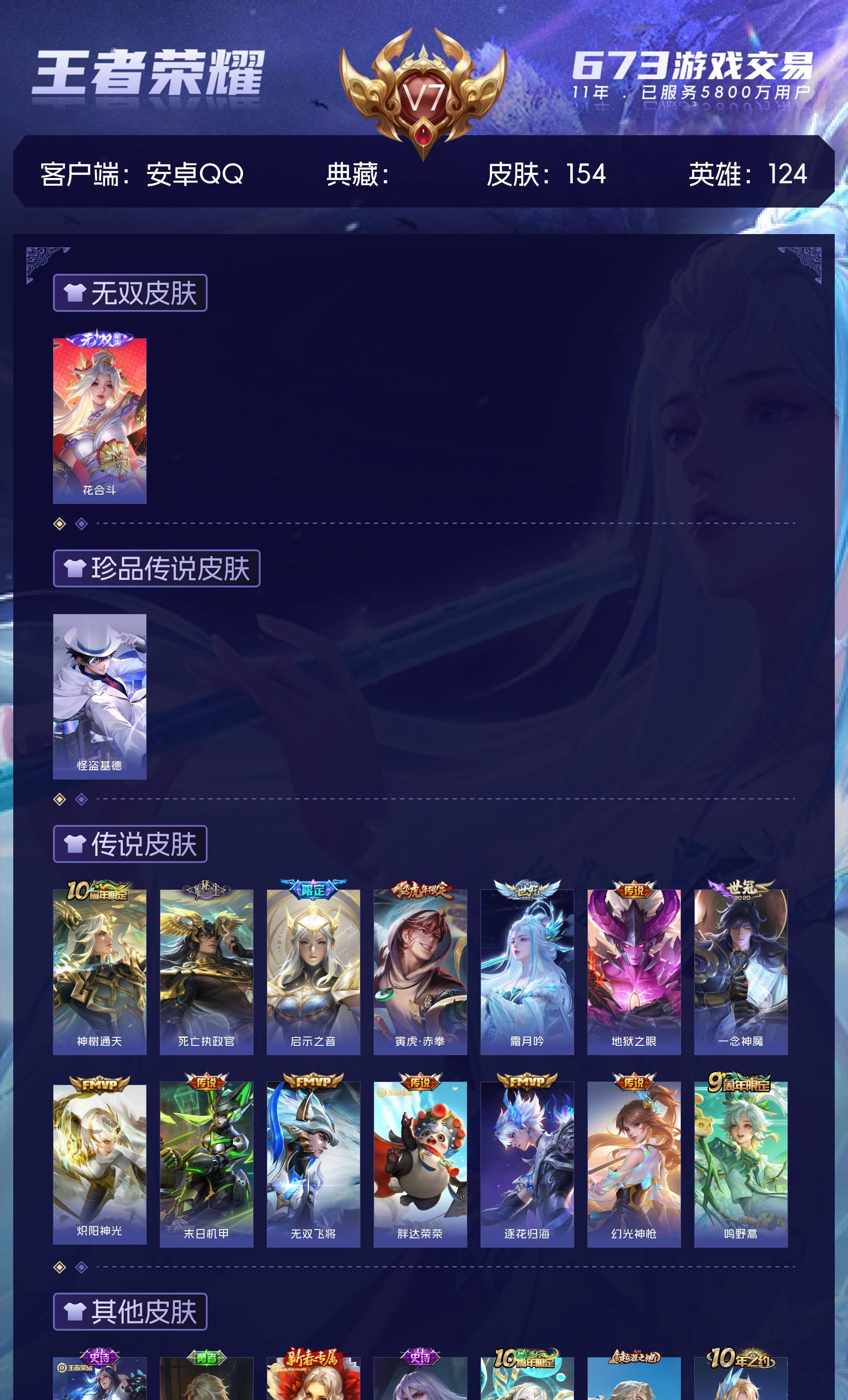 V7 皮肤154 英雄124 无双王者 无双皮肤1 珍品传说1 星传说1 传说14 其他皮肤144