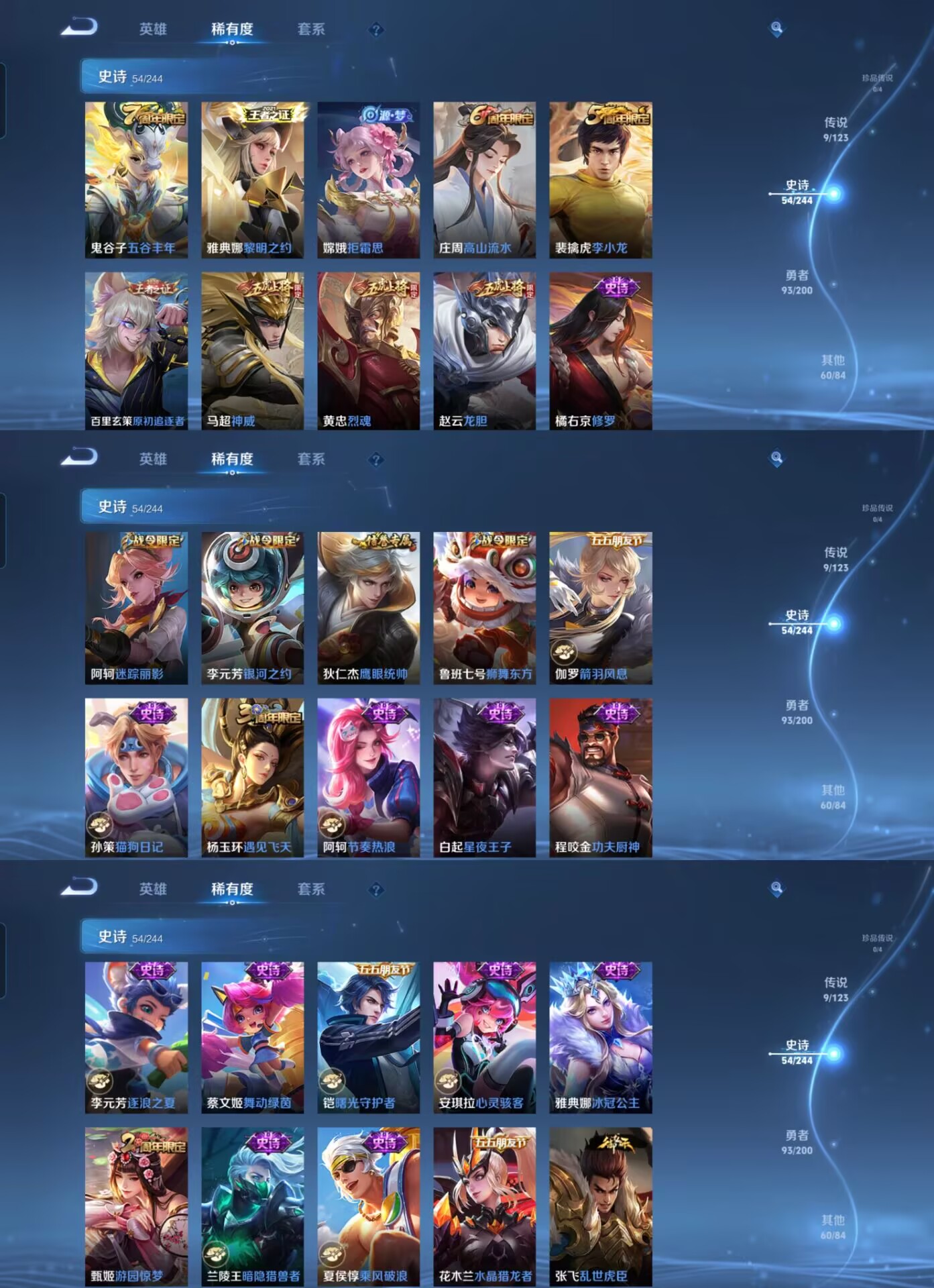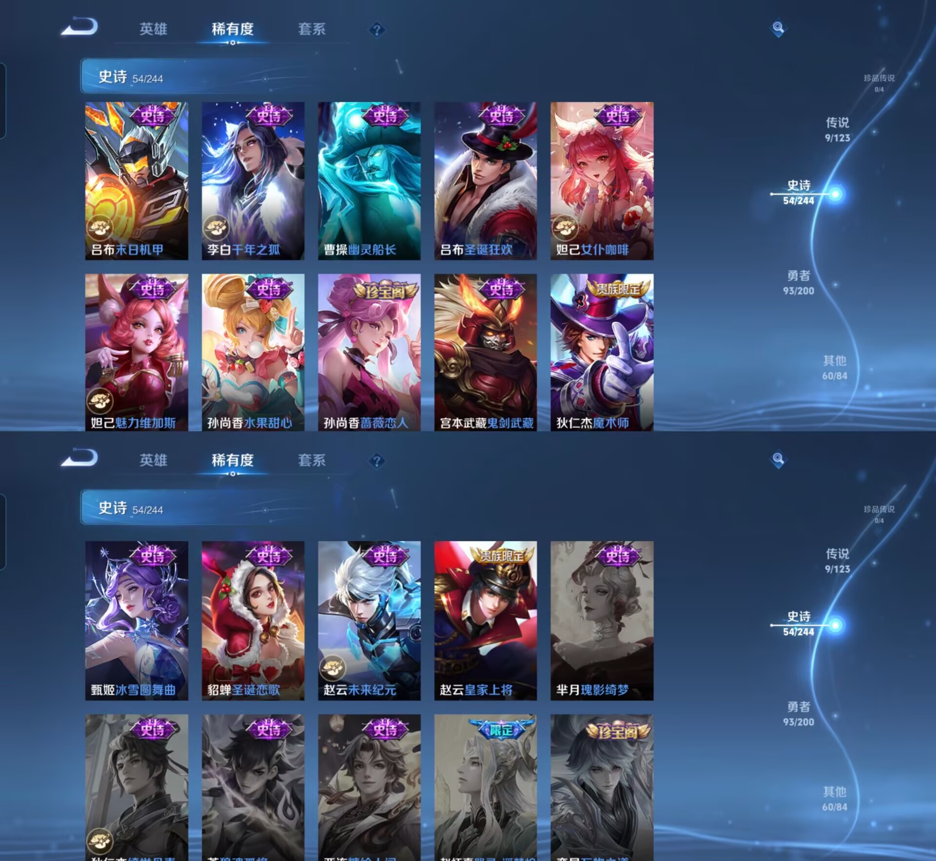 【史诗皮肤】 星界战将 烈魂 神威 龙胆 江河有灵 完美运算 荣光圣徽 漠中幻影 星界游侠 顽趣 舞动绿茵 幽灵船长 拒霜思 功夫厨神 女仆咖啡 魅力维加斯 魔术师 鹰眼统帅 圣诞恋歌 箭羽风息 鬼剑武藏 水晶猎龙者 修罗 曙光守护者 暗隐猎兽者 千年之狐 逐浪之夏 银河之约 狮舞东方 圣诞狂欢 末日机甲
