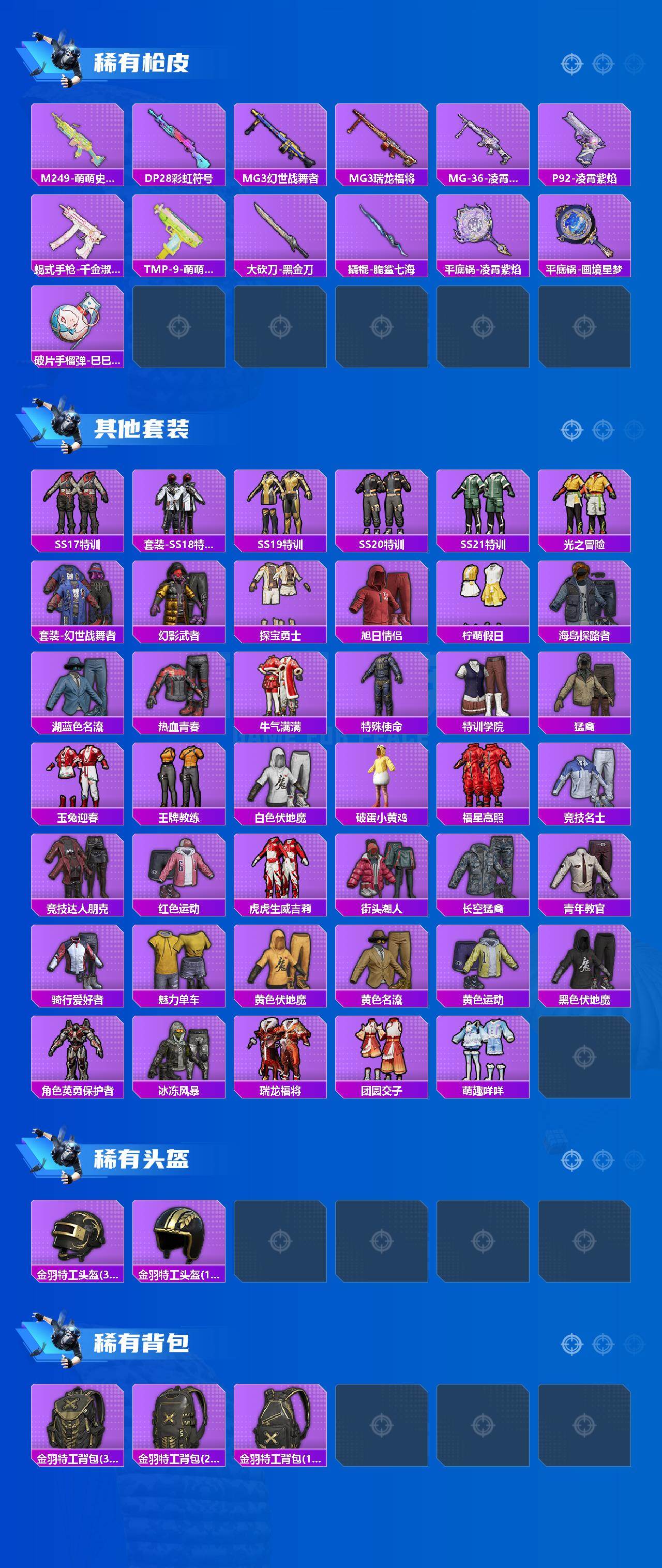【粉色枪皮等级】:AKM-炫紫旋律(六级),M416-墨龙九天(三级),AUG-暖羊咩咩(五级),AKS-74U-森灵之息(四级),Kar98K-巳巳如意(五级),M24-镜域双华(三级),DP-28-豹影疾电(四级)