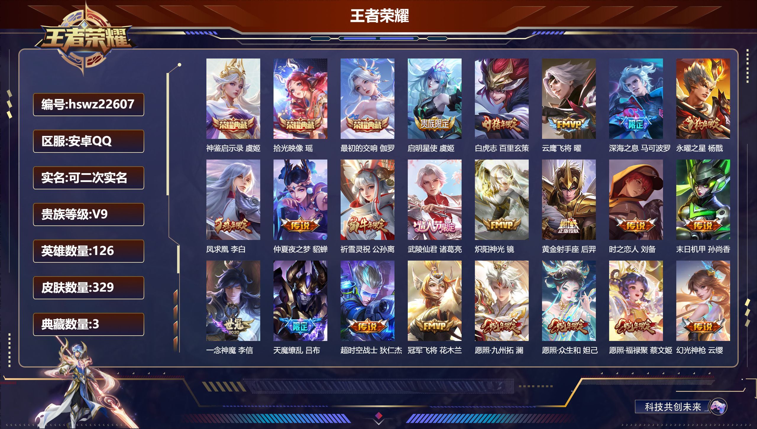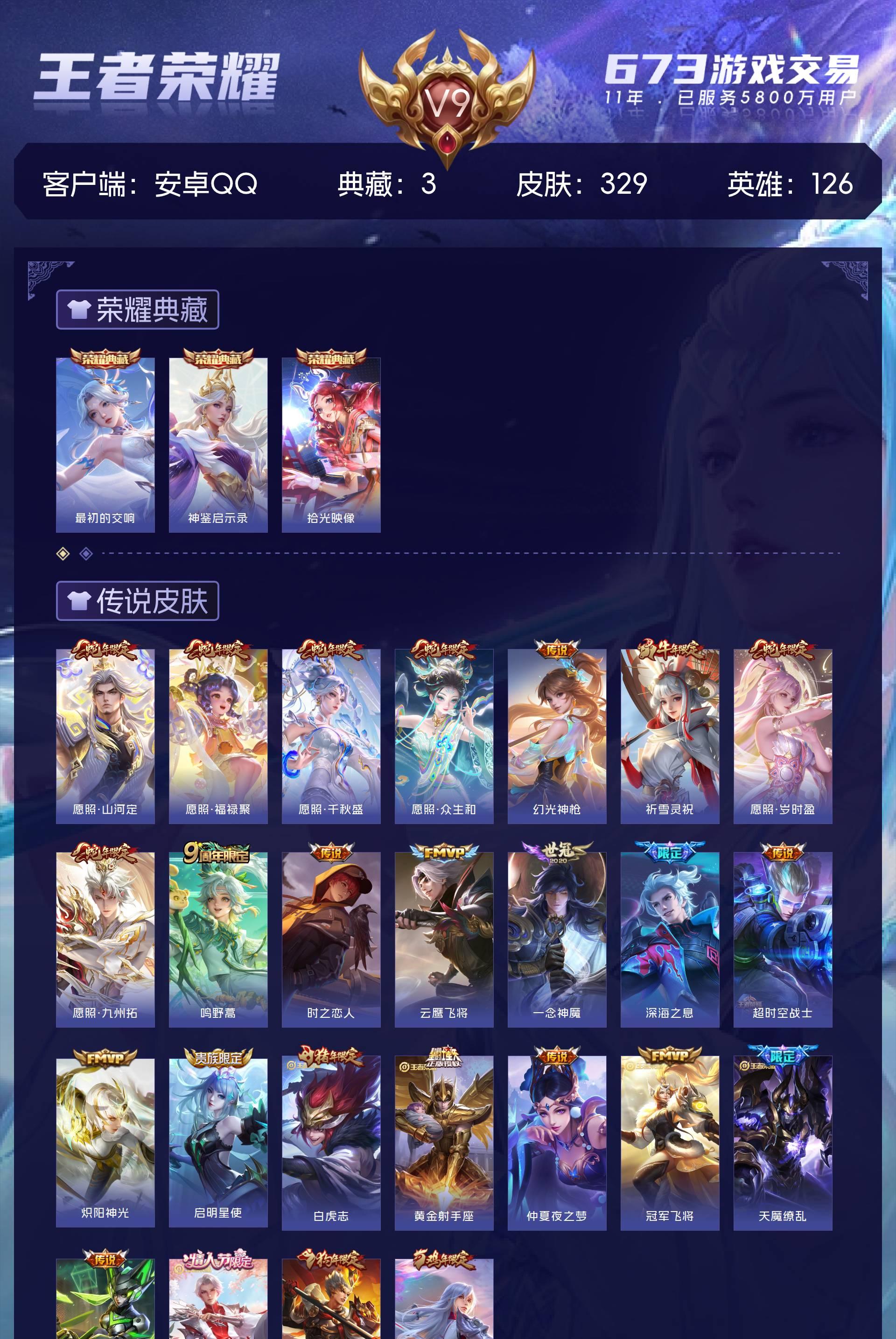 安卓QQ/至尊星耀/329皮肤/126英雄/3典藏/0珍品无双/0无双/0珍品传说/25传说/97史