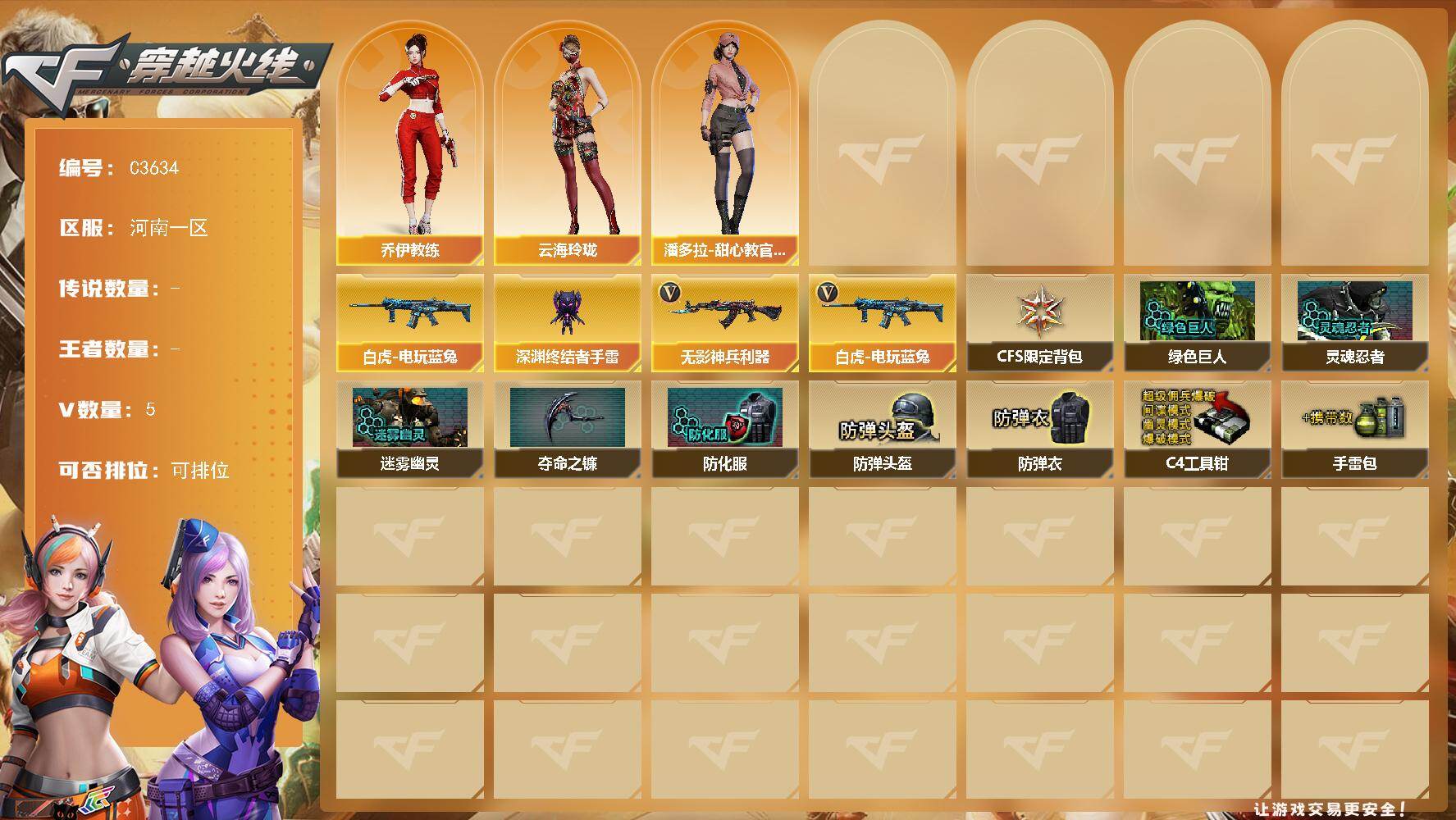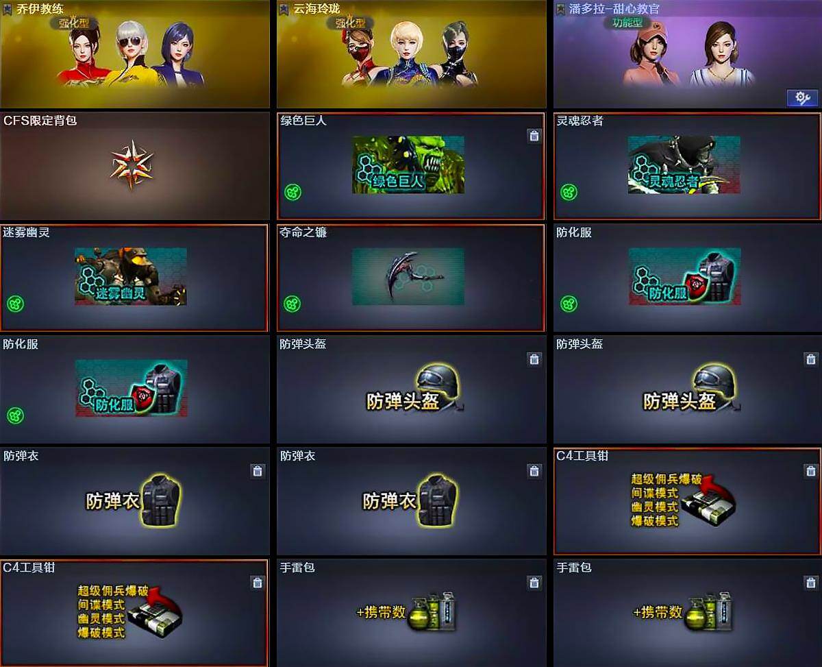 【道具】:CFS限定背包,绿色巨人,灵魂忍者,迷雾幽灵,夺命之镰,防化服*2,防弹头盔*2,防弹衣*2,C4工具钳*2,手雷包*2