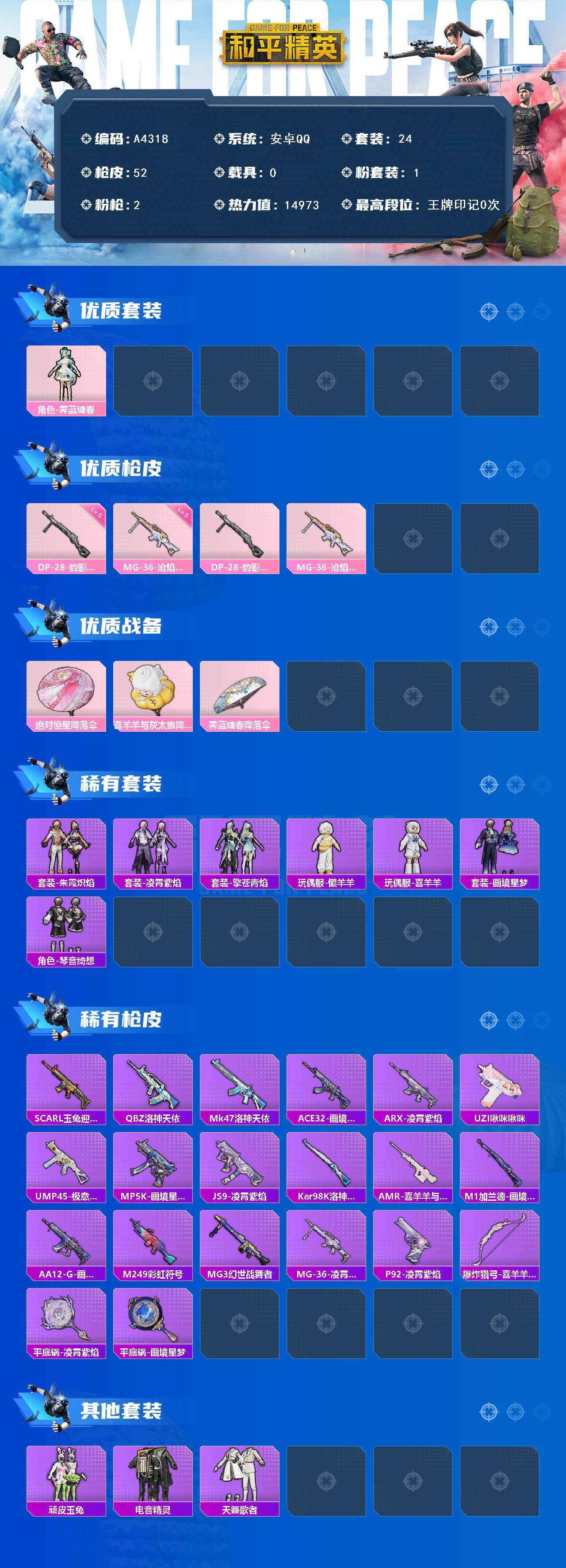 【A4318】安卓 【小号 霁蓝缠春/DP-28-豹影疾电(五级)】手Q-1粉装-2特效枪-0载具-1粉色飞行器-14973热力值-1王牌印记-24套装-52枪皮