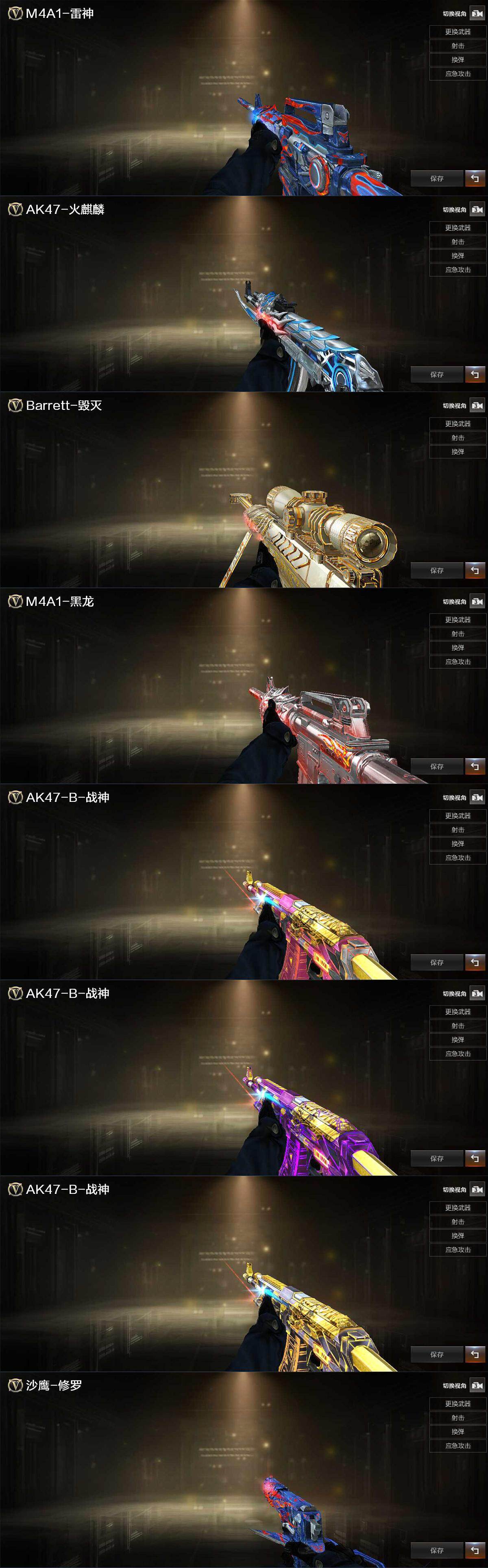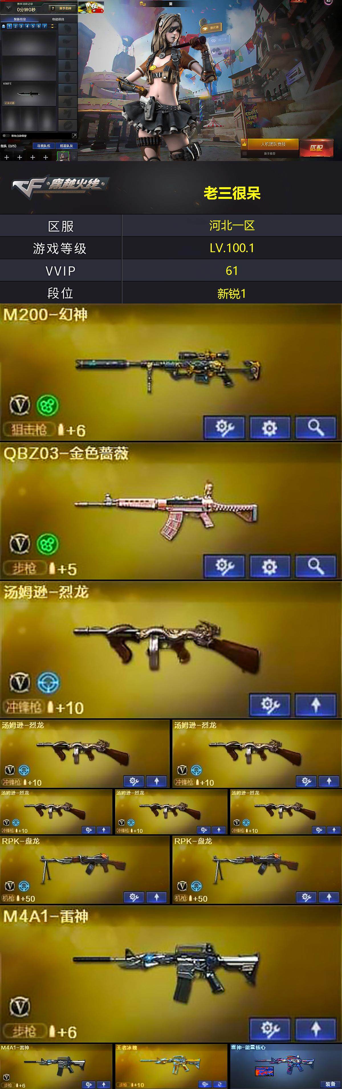【热门武器】:QBZ03-金色蔷薇,HK417-朱雀,M200-幻神,死亡之眼,M4A1-黑骑士,汤姆逊-烈龙*6,RPK-盘龙*2,斯泰尔-蝴蝶,沙鹰-修罗*2