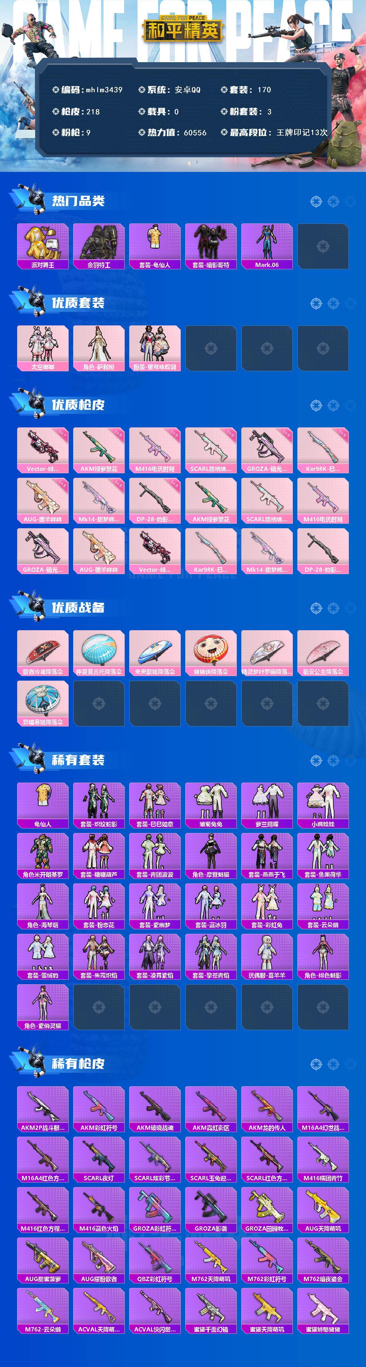 【mhlm3439】安卓 手Q-3粉装-9特效枪-0载具-2粉色飞行器-60556热力值-13王牌印记-170套装-218枪皮