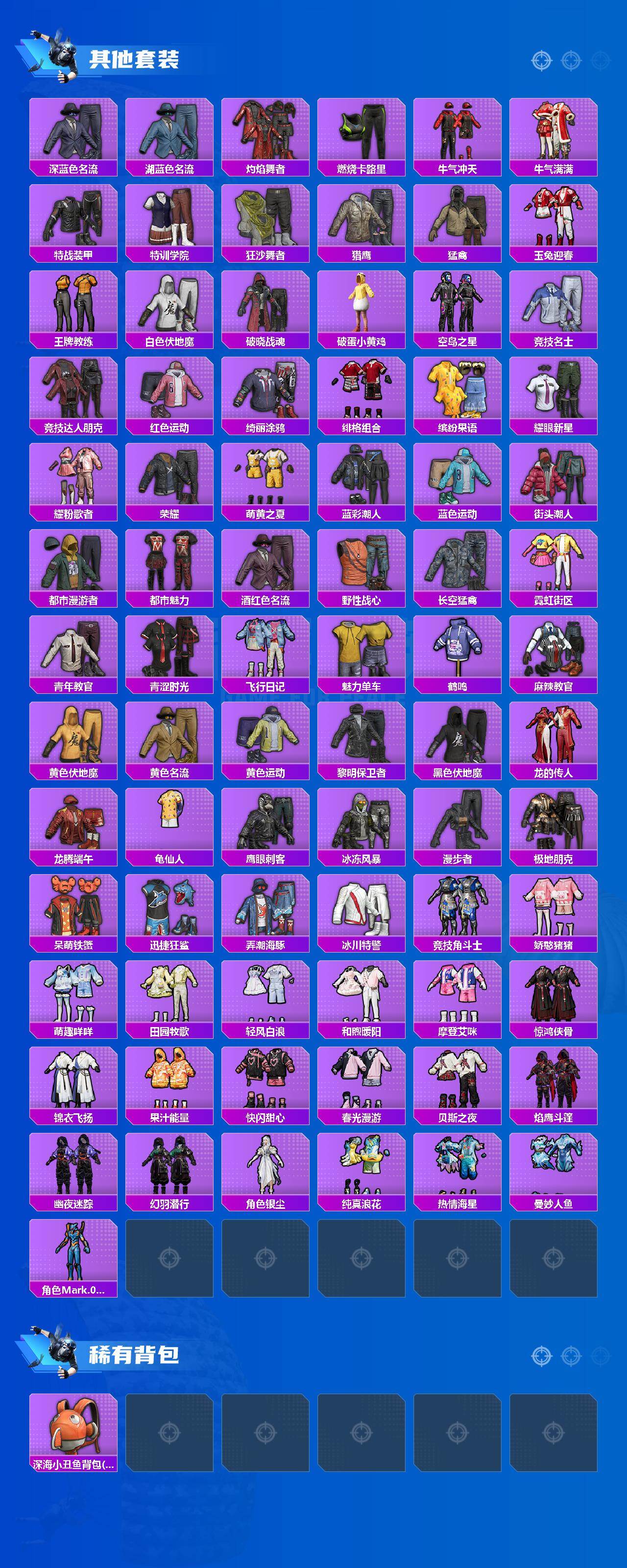 【热门品类】:套装-派对舞王,套装-金羽特工,套装-龟仙人,套装-暗影哥特,角色-Mark.06