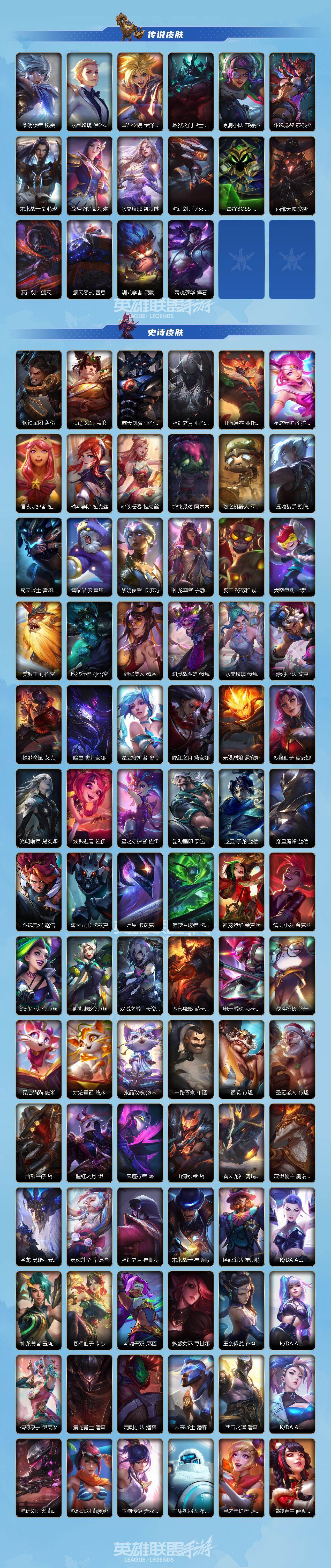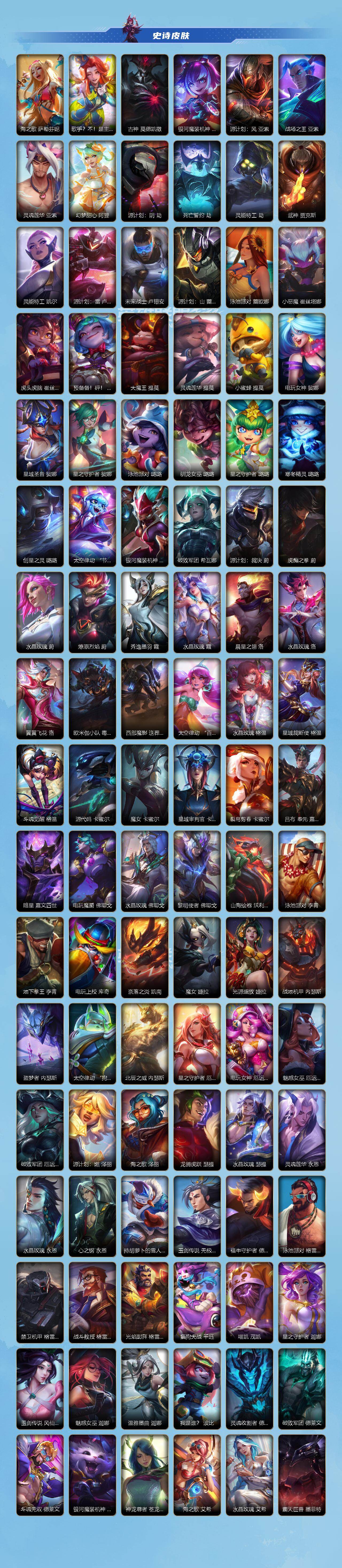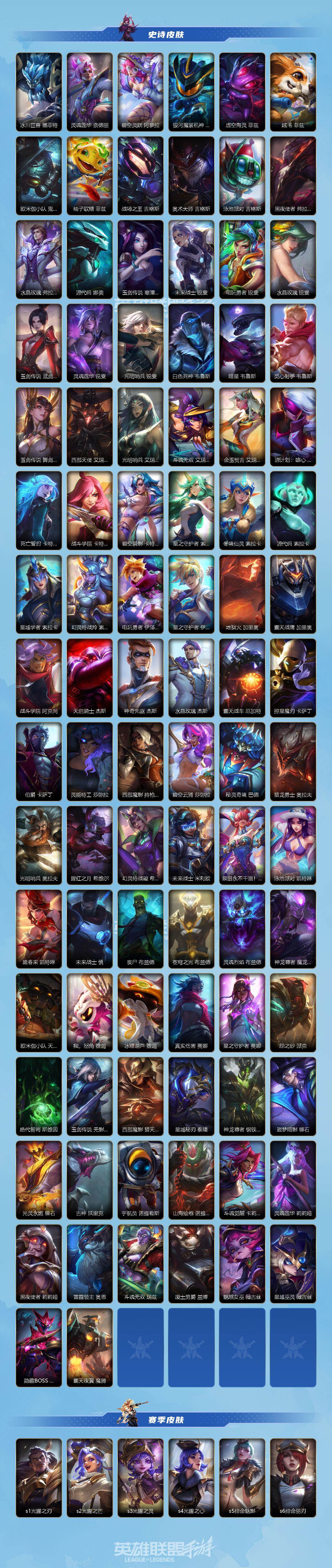 131英雄/493皮肤/1典藏/15神话/64传说/278史诗/傲世宗师/