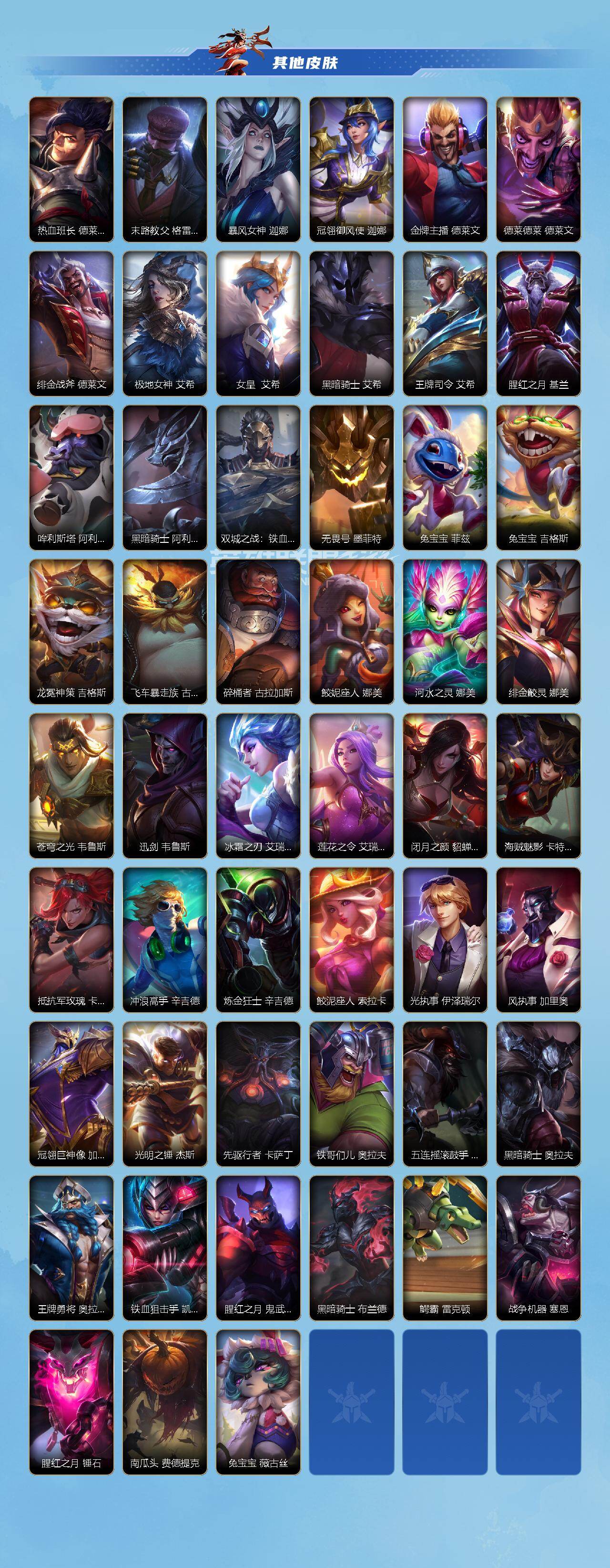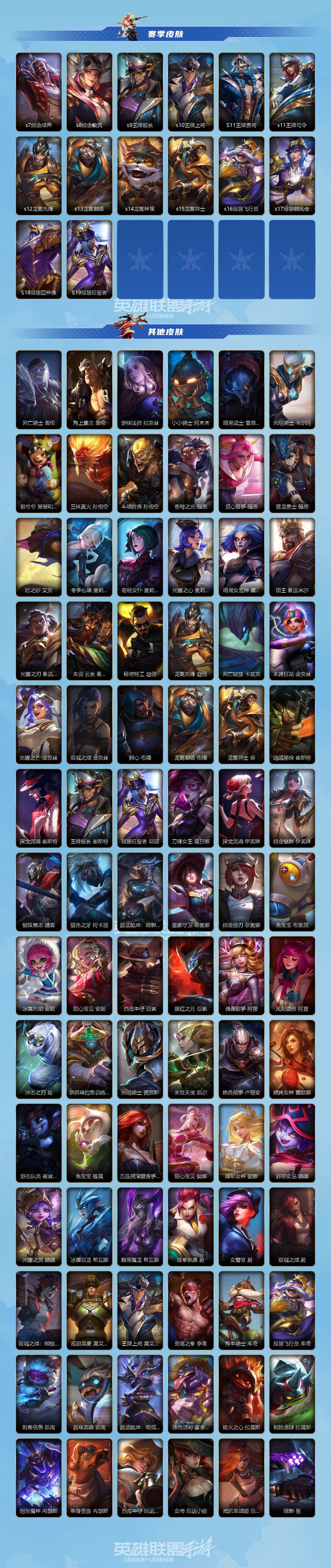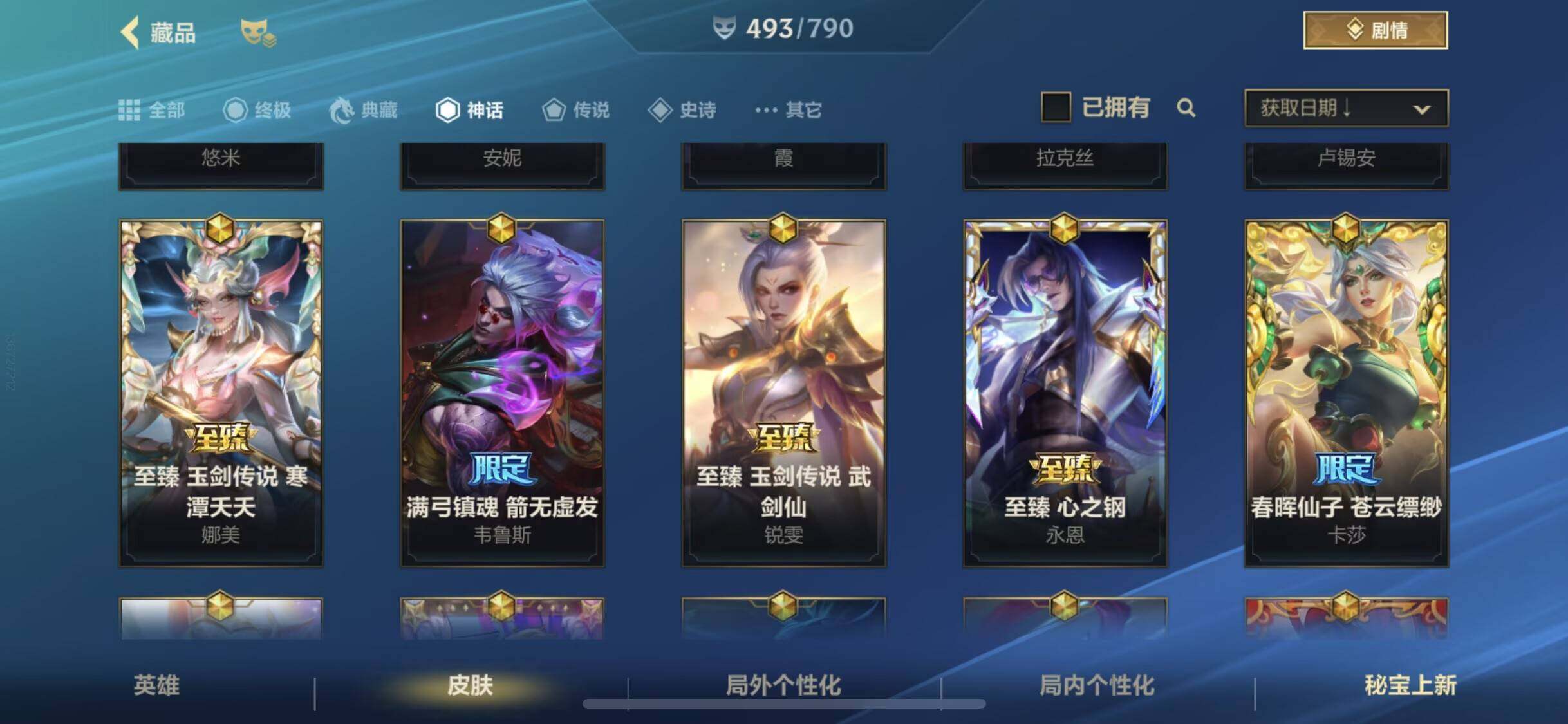 131英雄/493皮肤/1典藏/15神话/64传说/278史诗/傲世宗师/