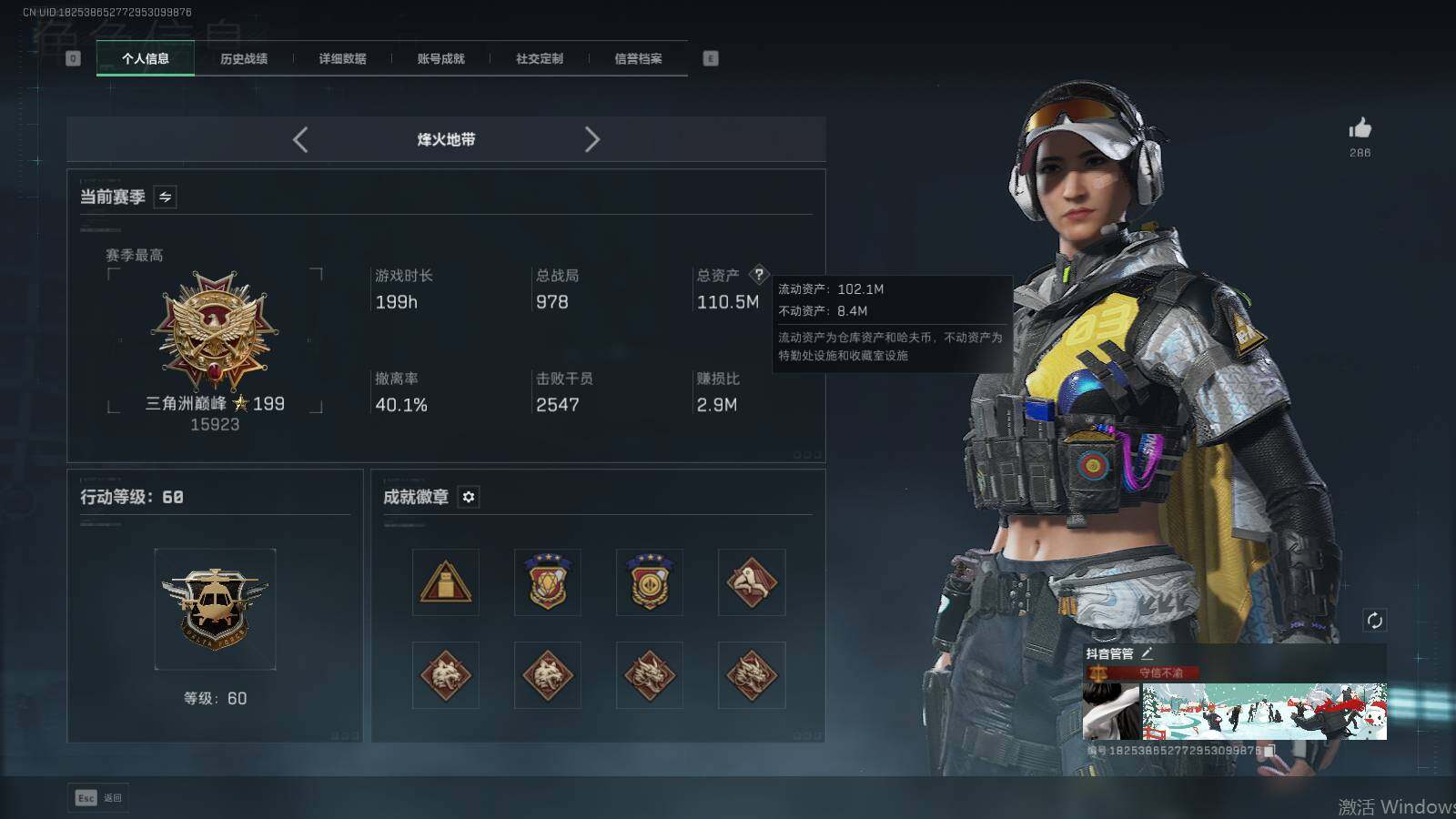 总资产(M):110M/哈夫币(K):5082K/传说枪皮数:32/全面战场等级:33_段位:上等兵/烽火地带等级:60_段位:三角洲巅峰/