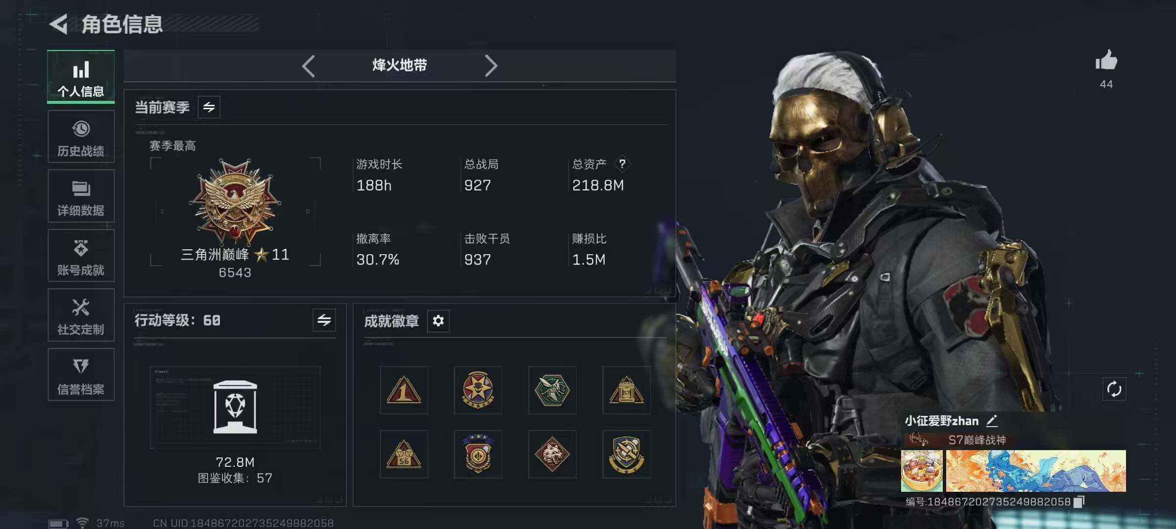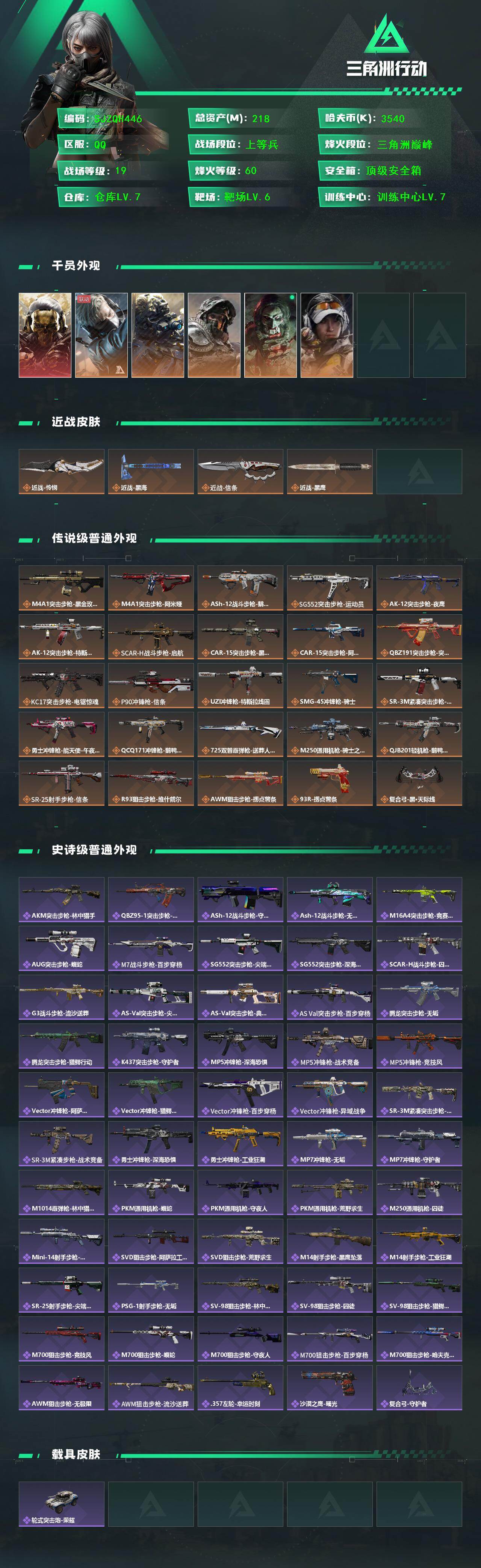 总资产(M):218M/哈夫币(K):3540K/传说枪皮数:25/全面战场等级:19_段位:上等兵/烽火地带等级:60_段位:三角洲巅峰