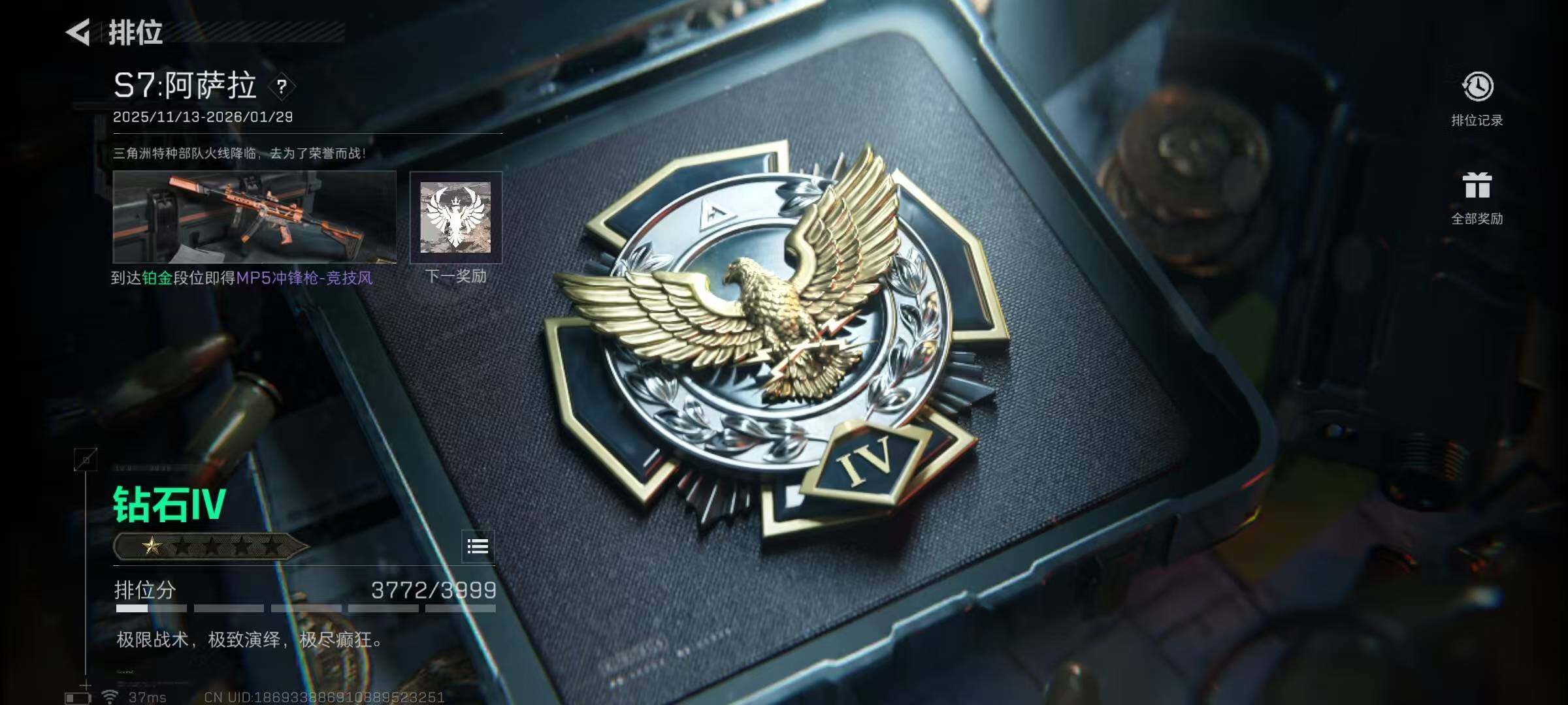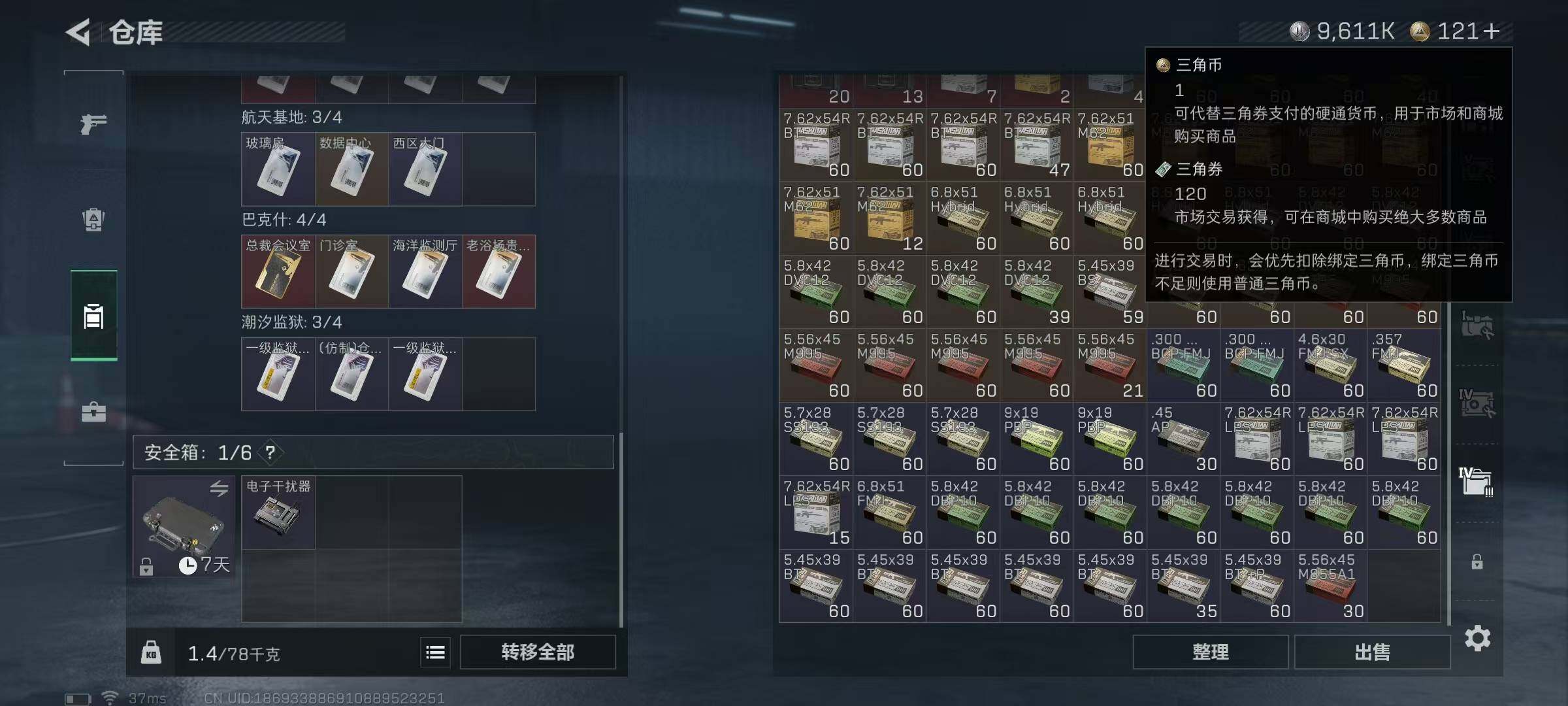 总资产(M):171M/哈夫币(K):9611K/传说枪皮数:4/全面战场等级:4_段位:无段位/烽火地带等级:60_段位:钻石/