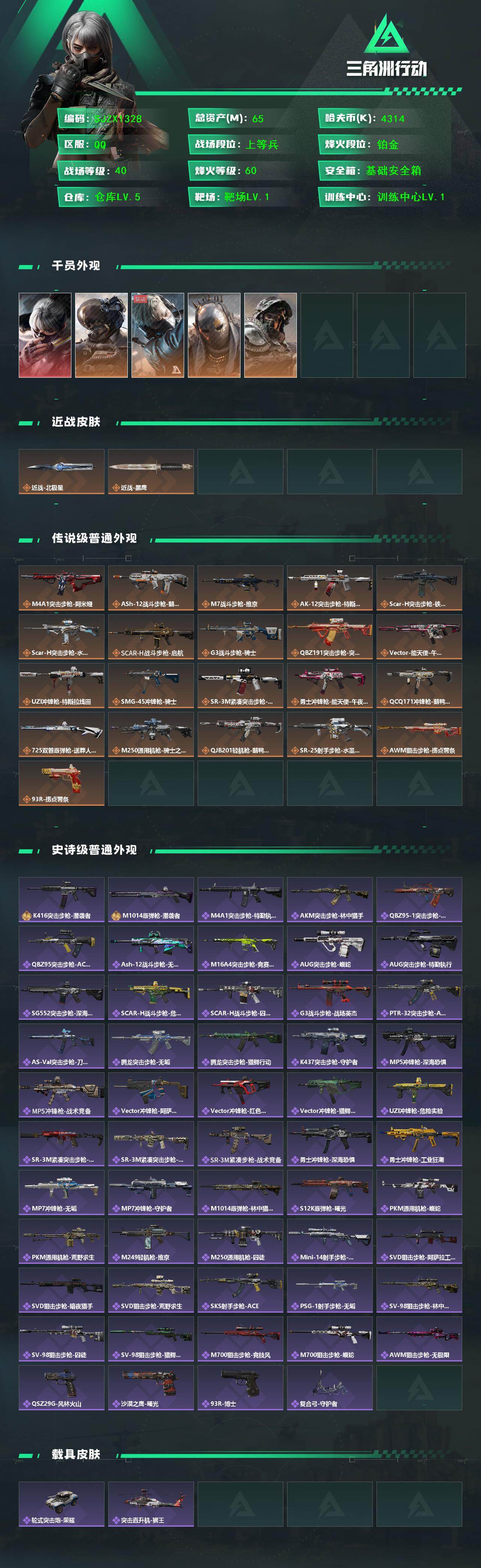 总资产(M):65M/哈夫币(K):4314K/传说枪皮数:21/全面战场等级:40_段位:上等兵/烽火地带等级:60_段位:铂金/