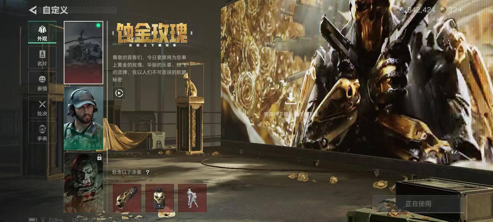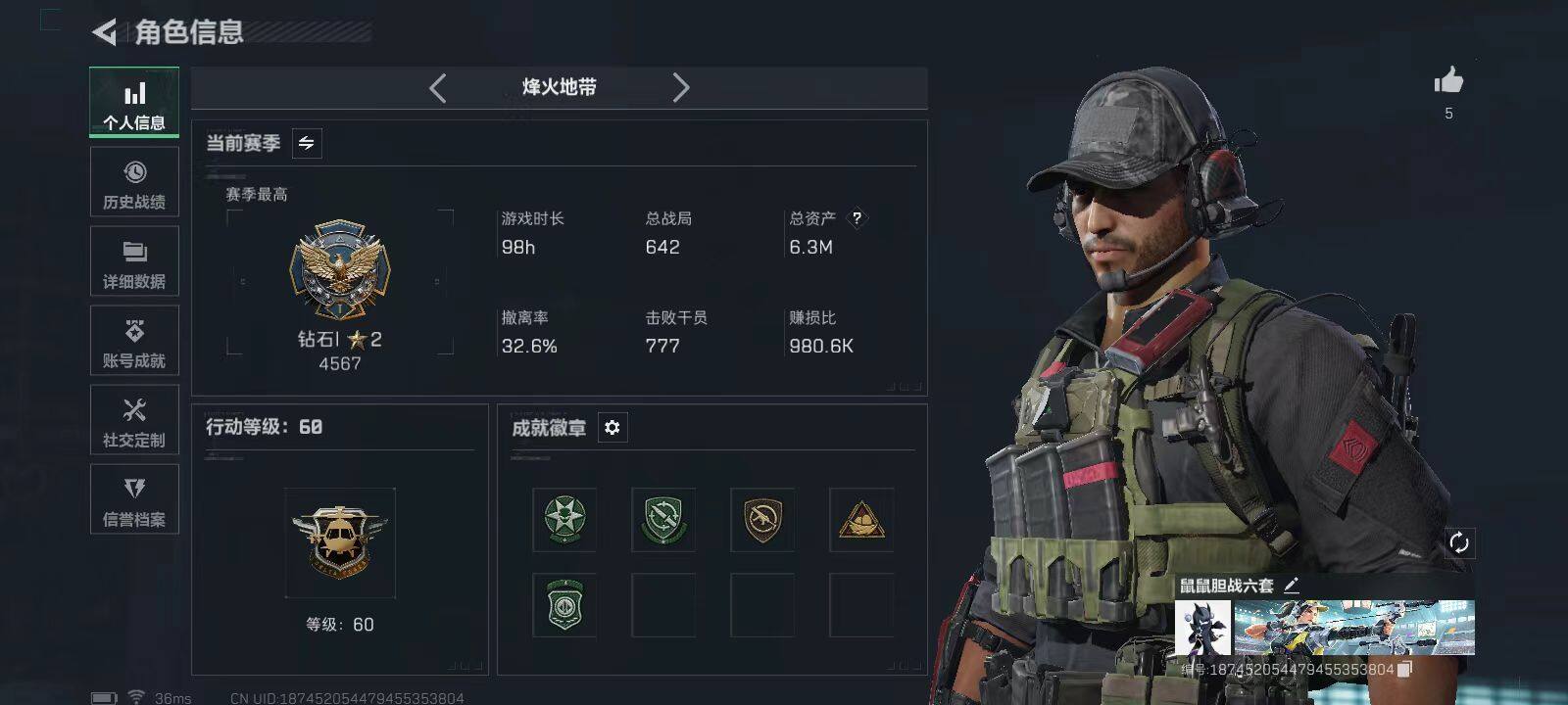 总资产(M):6M/哈夫币(K):842K/传说枪皮数:2/全面战场等级:1_段位:无段位/烽火地带等级:60_段位:钻石/