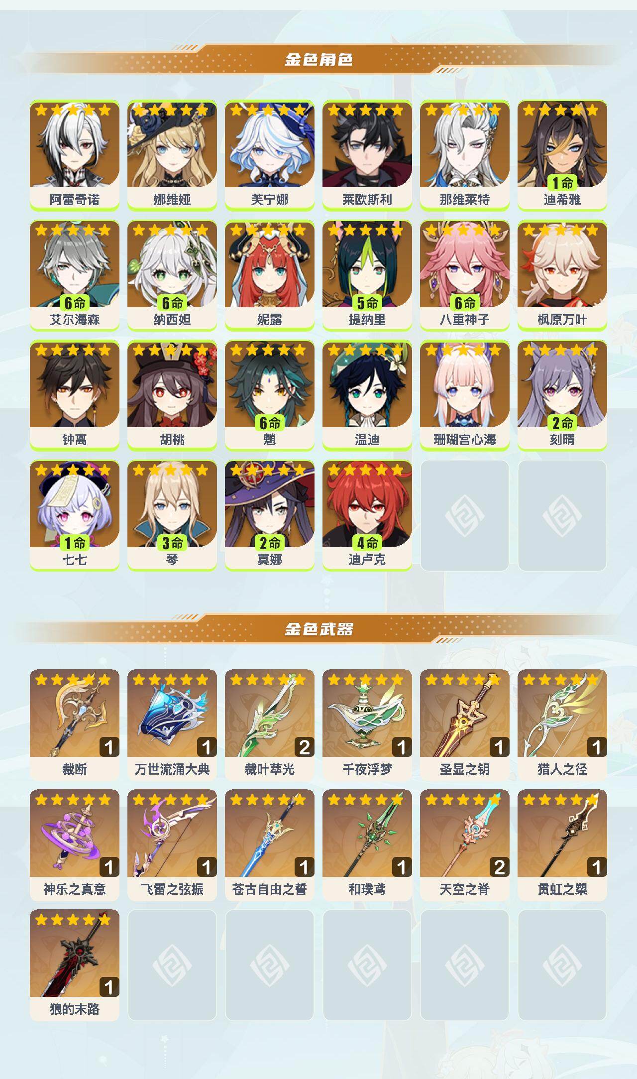 【YSYT617】60级/81黄/女主/22个五星角色/14个五星武器/枫原万叶/芙宁娜/那维莱特/钟离/娜维娅/满命魈/3命琴/满命八重神子/满命艾尔海森/满命纳西妲/5命提纳里/妮露/珊瑚宫心海/阿蕾奇诺/胡桃/莱欧斯利/2命莫娜/温迪/1命七七/2命刻晴/1命迪希雅/4命迪卢克/猎人之径/万世流涌大典/千夜浮梦/神乐之真意/和璞鸢/精2天空之脊/裁断/精2裁叶萃光/圣显之钥/苍古自由之誓/飞雷之弦振/狼的末路/贯虹之槊