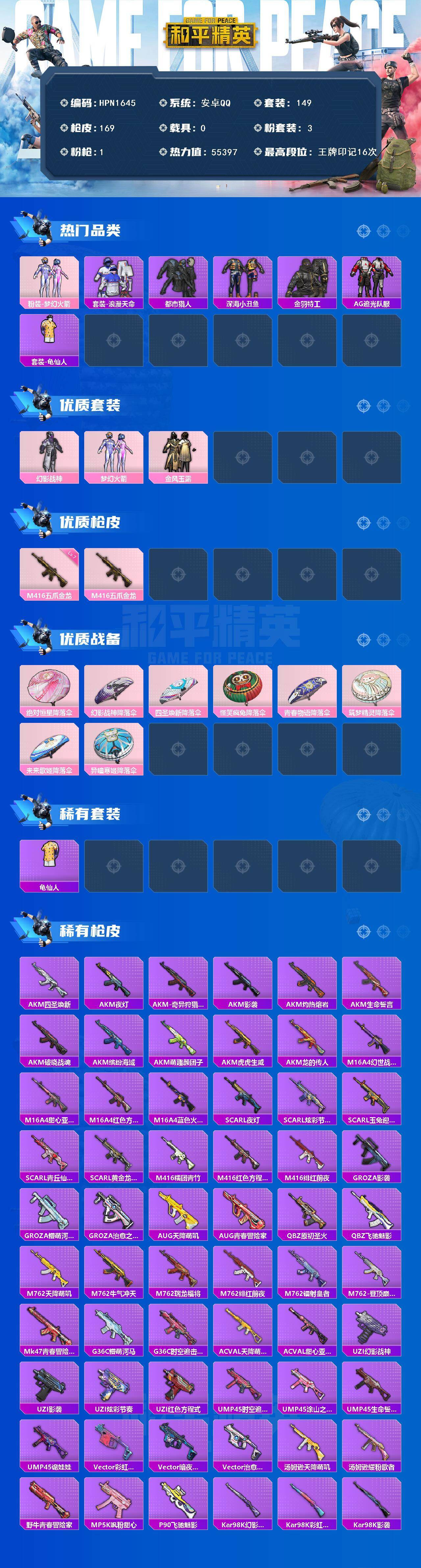 【HPN1645】149套装/枪械1/装备202/战备127/王牌印记16/热力值55397/七级M416-五爪金龙/粉装-梦幻火箭/套装-浪漫天命/都市猎人/深海小丑鱼/金羽特工/AG追光队服/套装-龟仙人/幻影战神/梦幻火箭/金风玉露/M416-五爪金龙/绝对恒星降落伞/幻影战神降落伞/四圣焕新降落伞/怪笑疯兔降落伞/青春物语降落伞/筑梦精灵降落伞/未来歌姬降落伞/异瞳寒姬降落伞/炫彩糖果降落伞/龟仙人/套装-雪国风尚/套装-炫彩糖果/AUG-冰晶雪宝/AKM-四圣焕新/AKM-夜灯/AKM