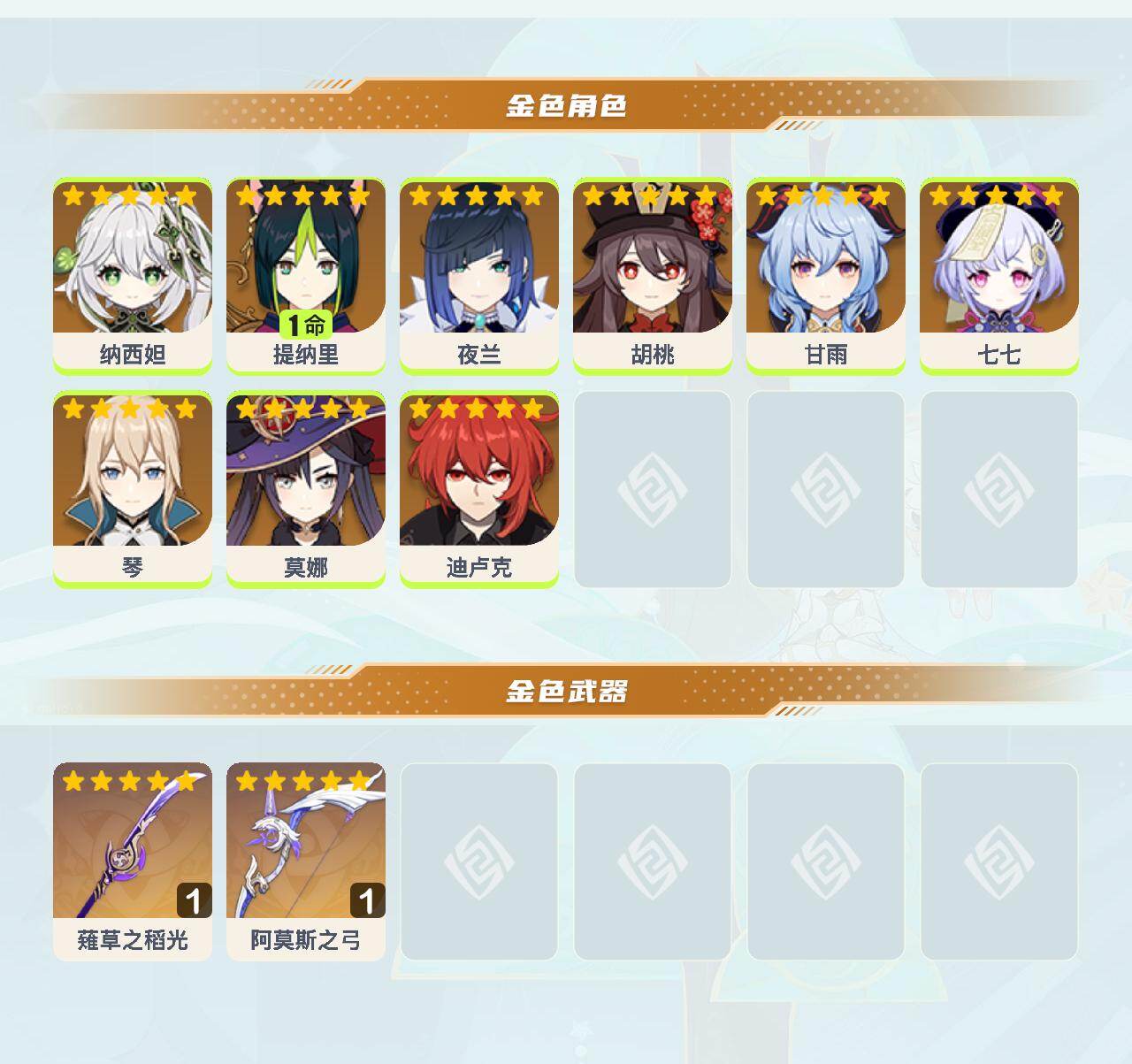 【YSX1523】55级/12黄/女主/9个五星角色/2个五星武器/甘雨/胡桃/夜兰/纳西妲/琴/七七/1命提纳里/莫娜/迪卢克/阿莫斯之弓/薙草之稻光