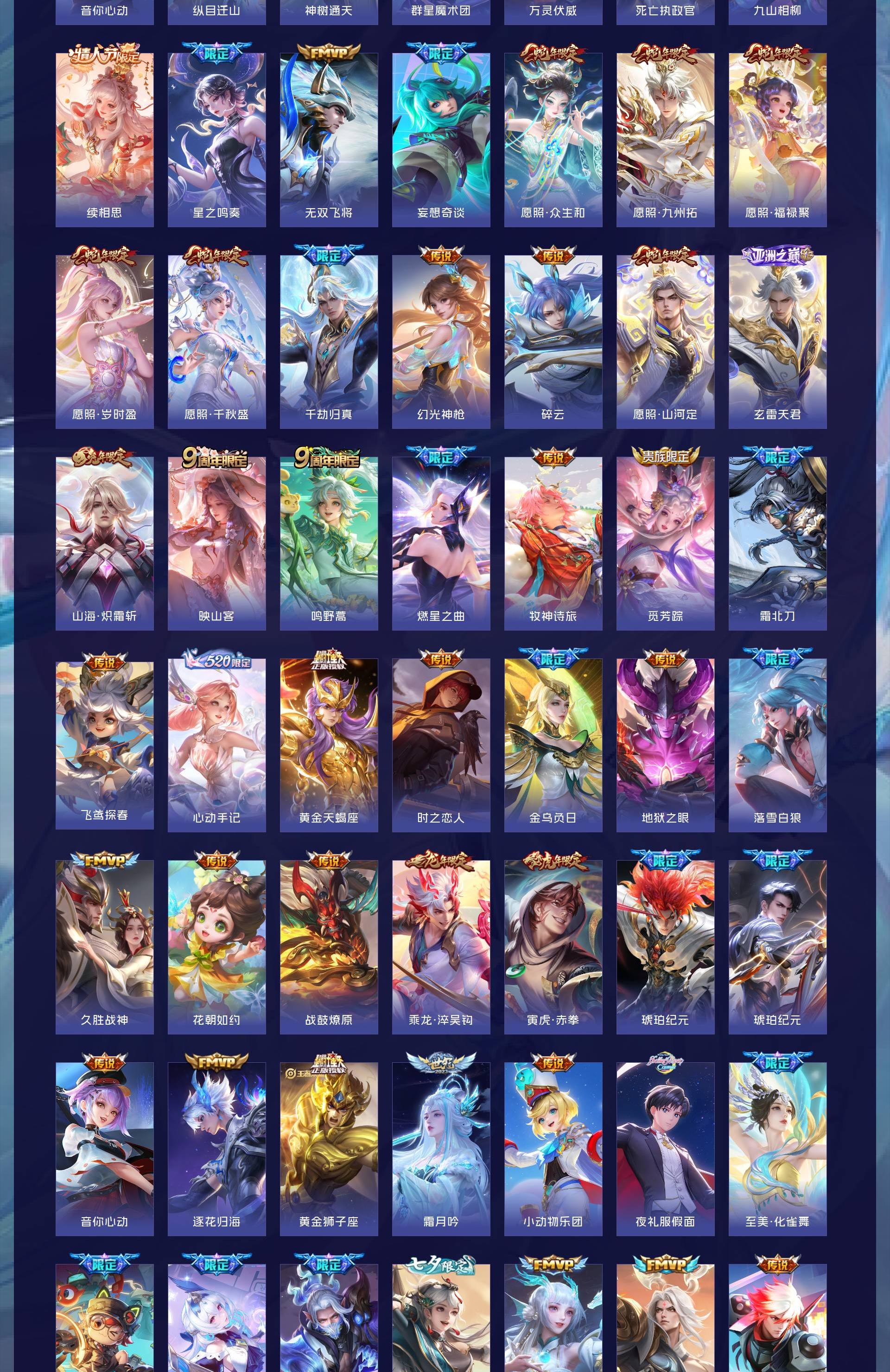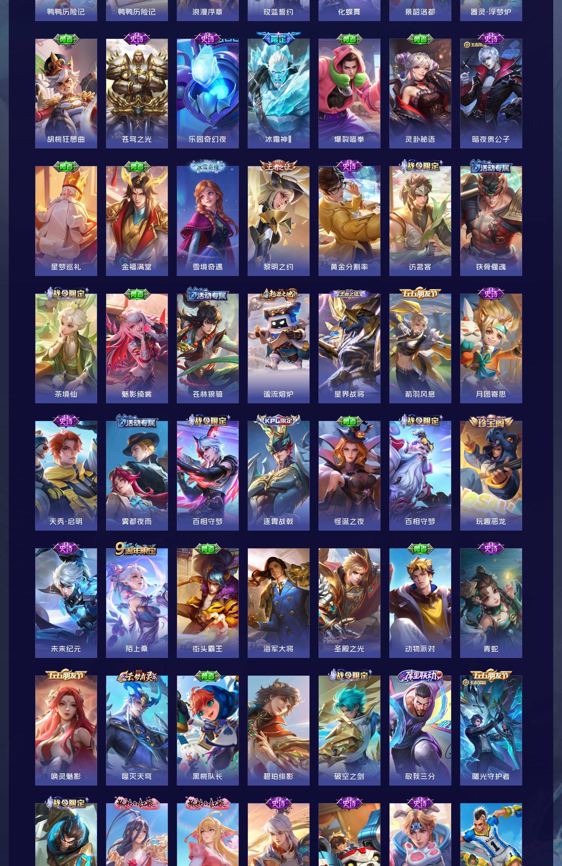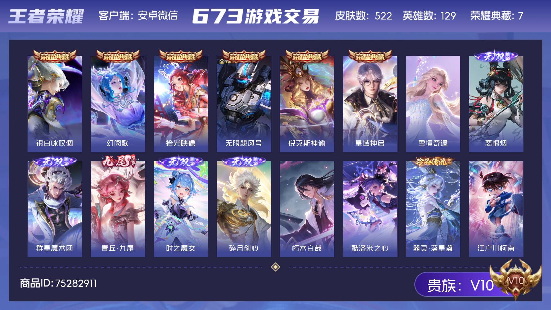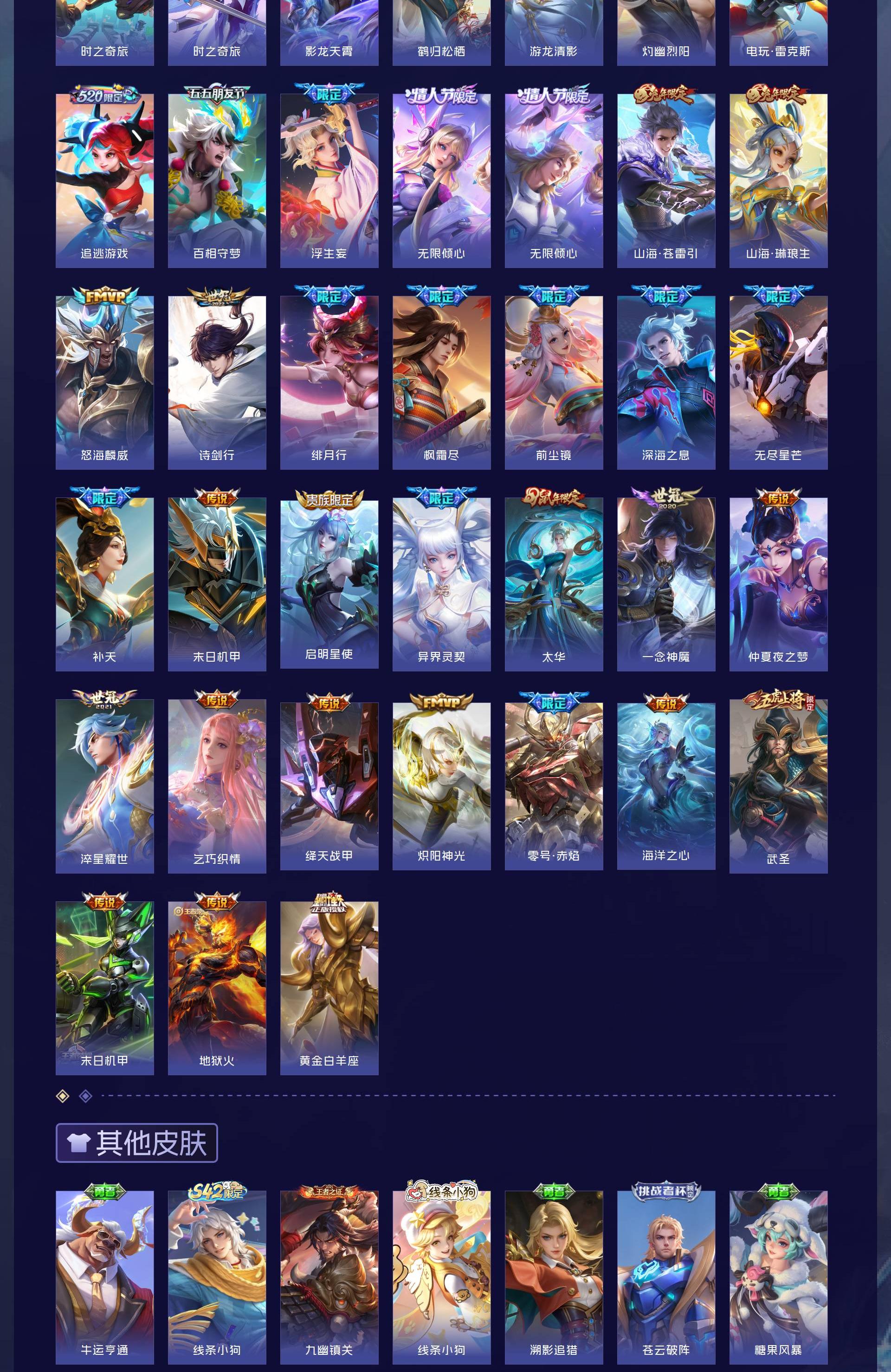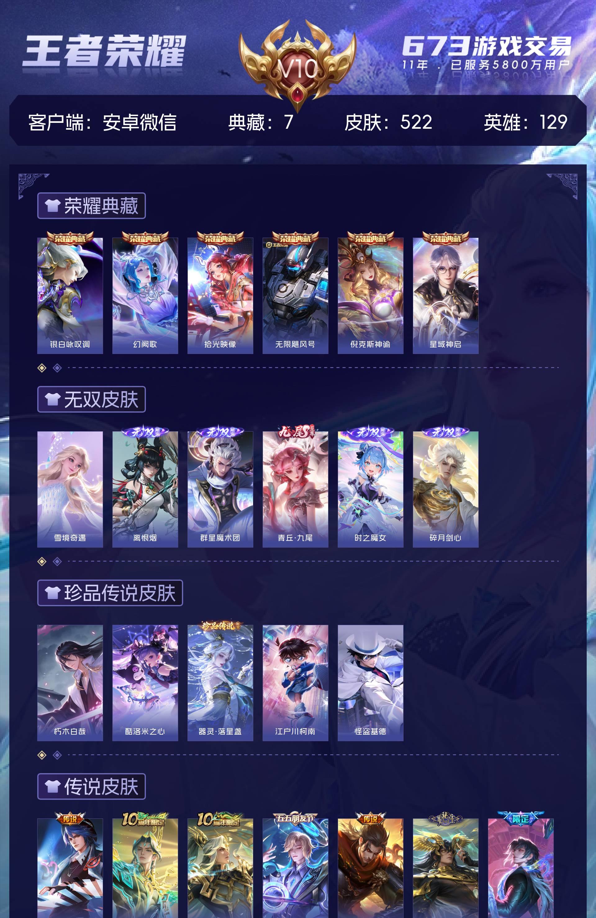V10 皮肤522 英雄129 最强王者 荣耀典藏7 无双皮肤6 珍品传说5 传说88 其他皮肤421