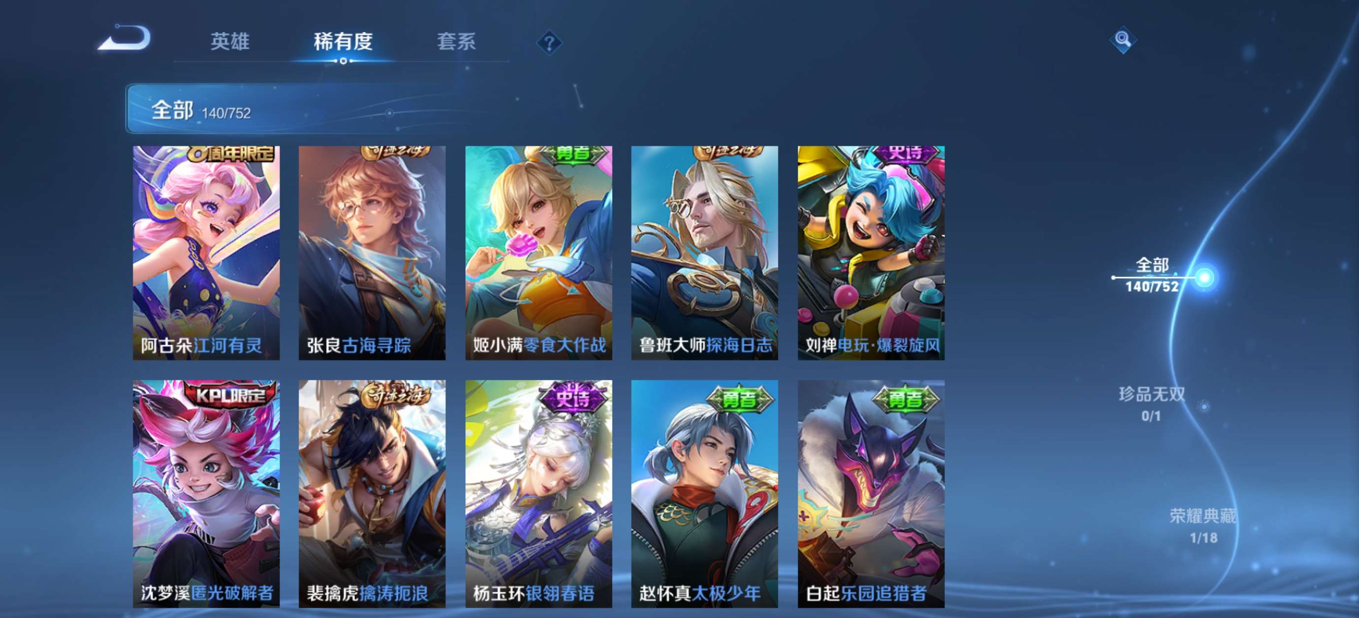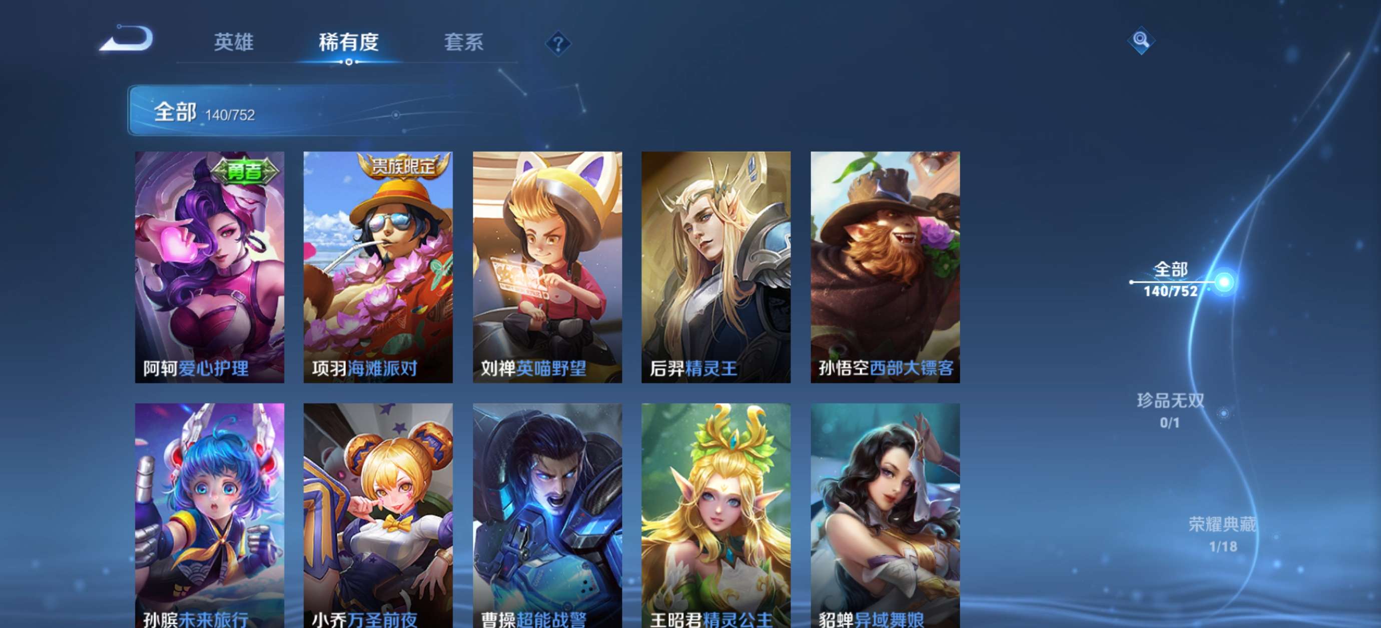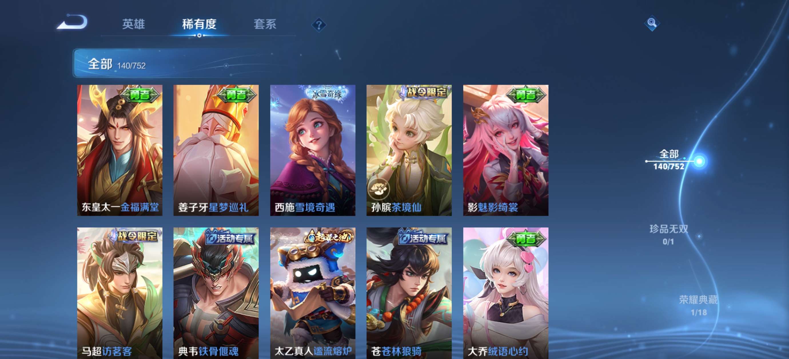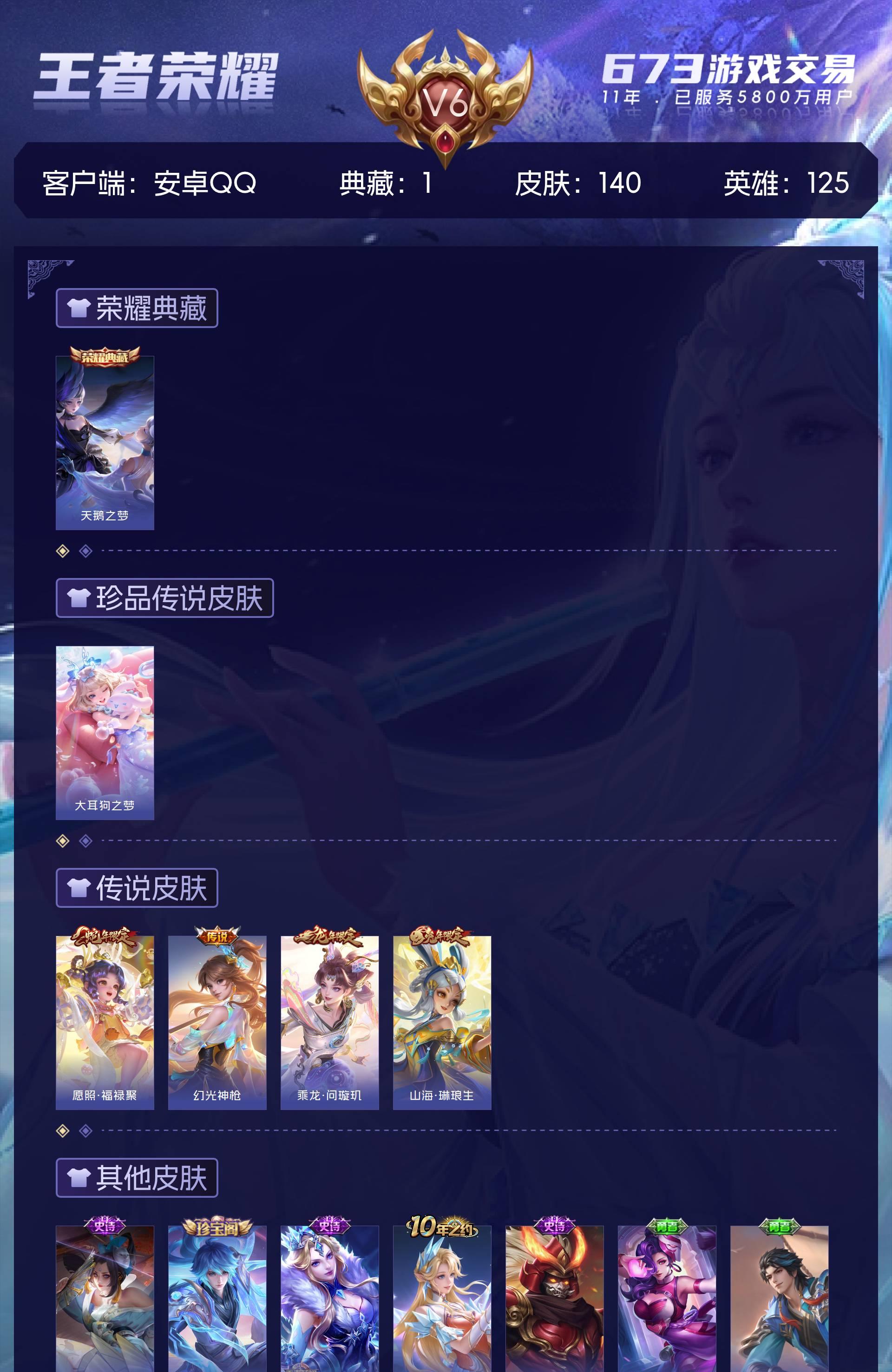 V6 皮肤140 英雄125 永恒钻石 荣耀典藏1 珍品传说1 传说4 其他皮肤140