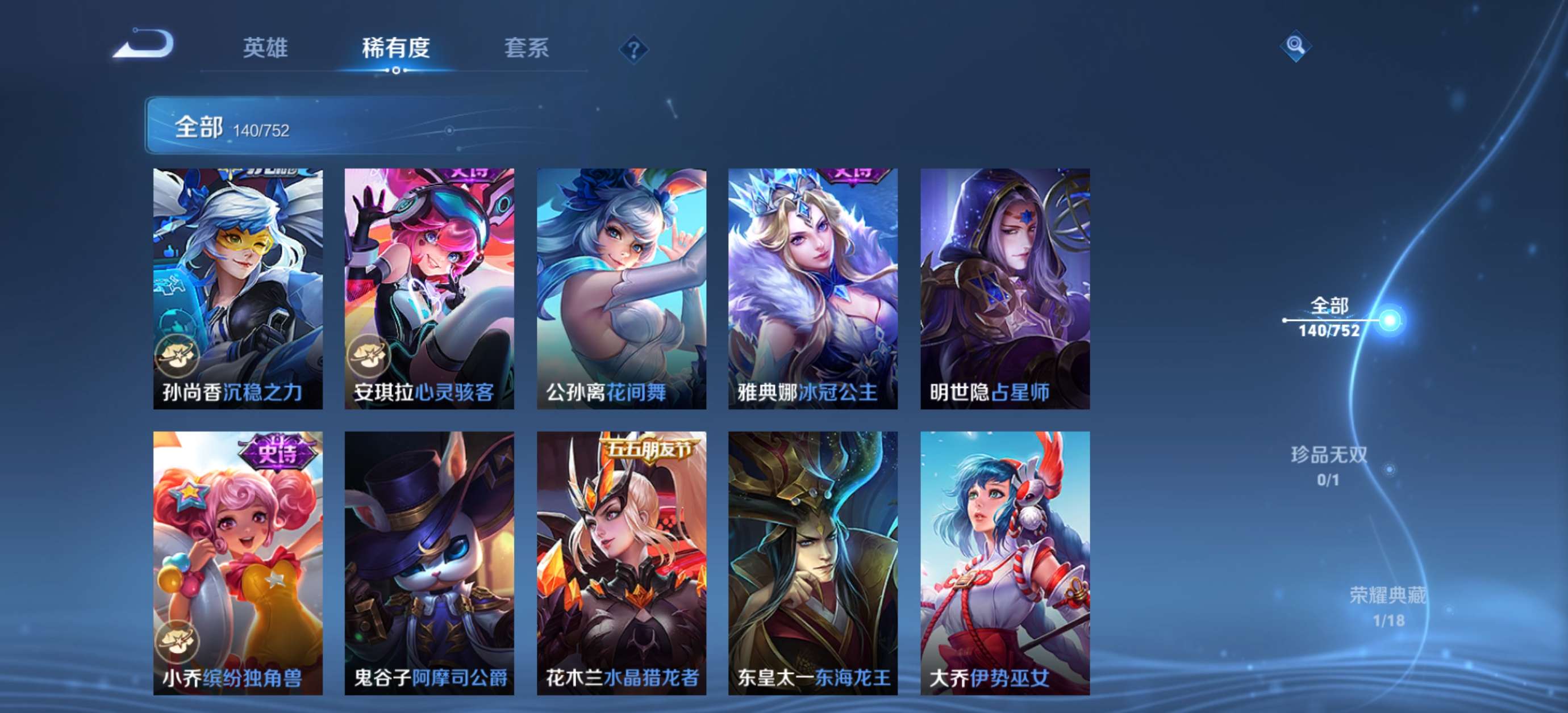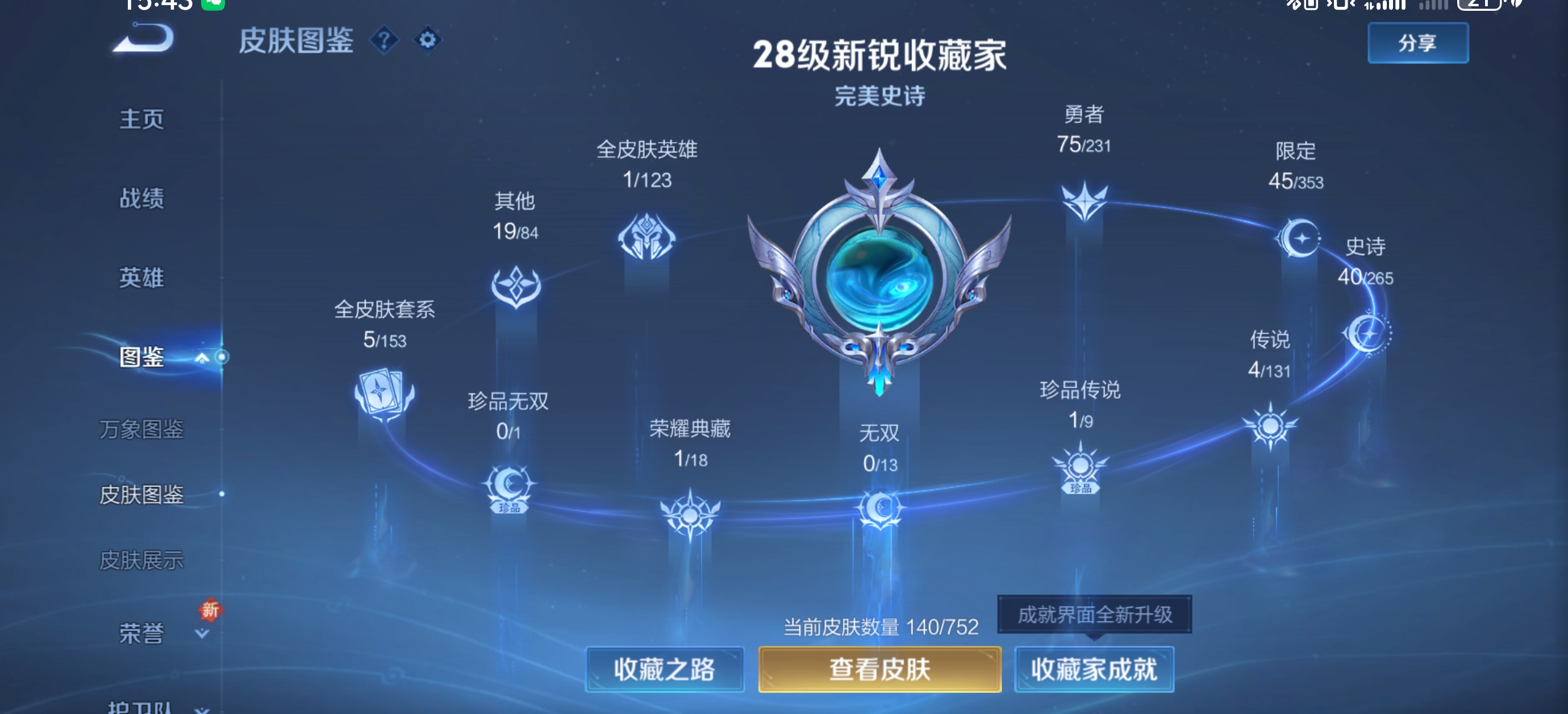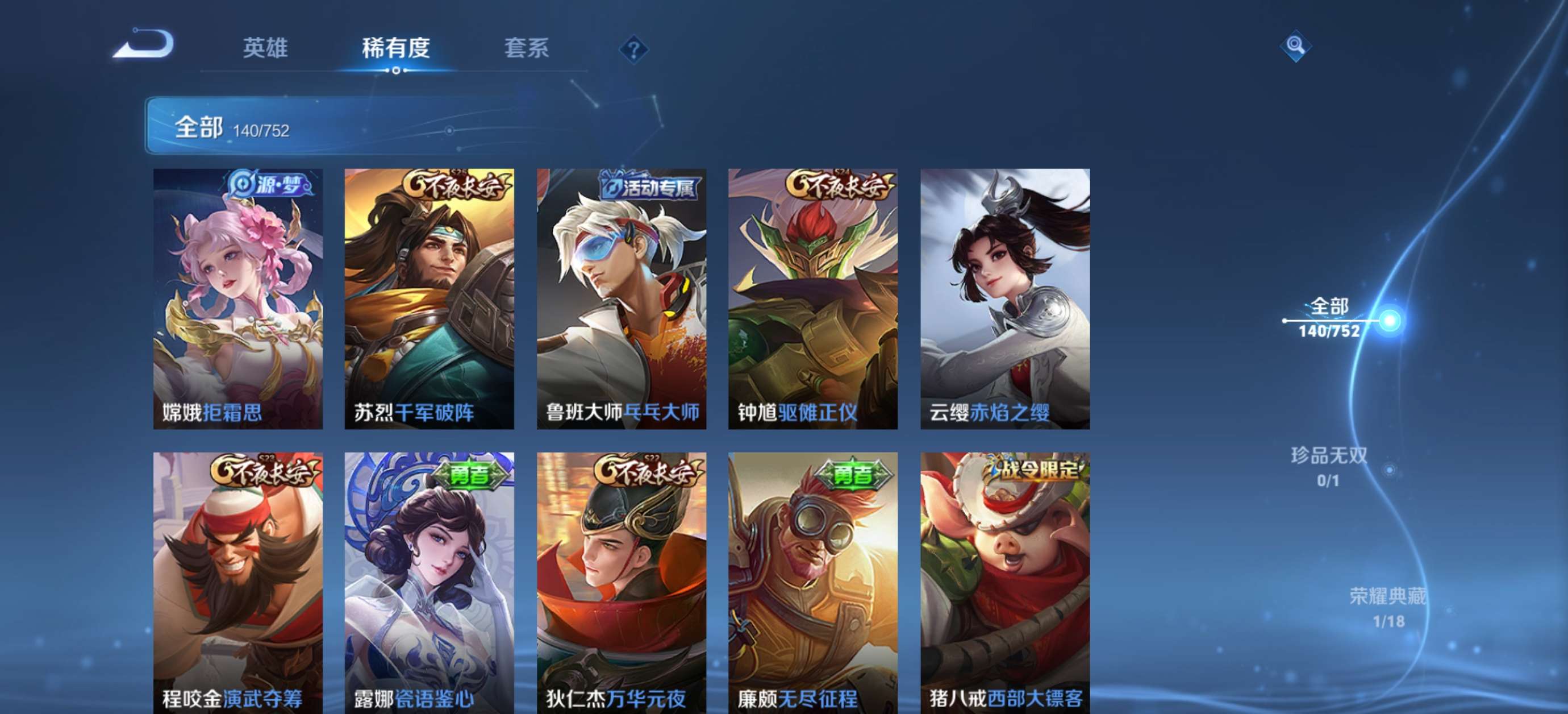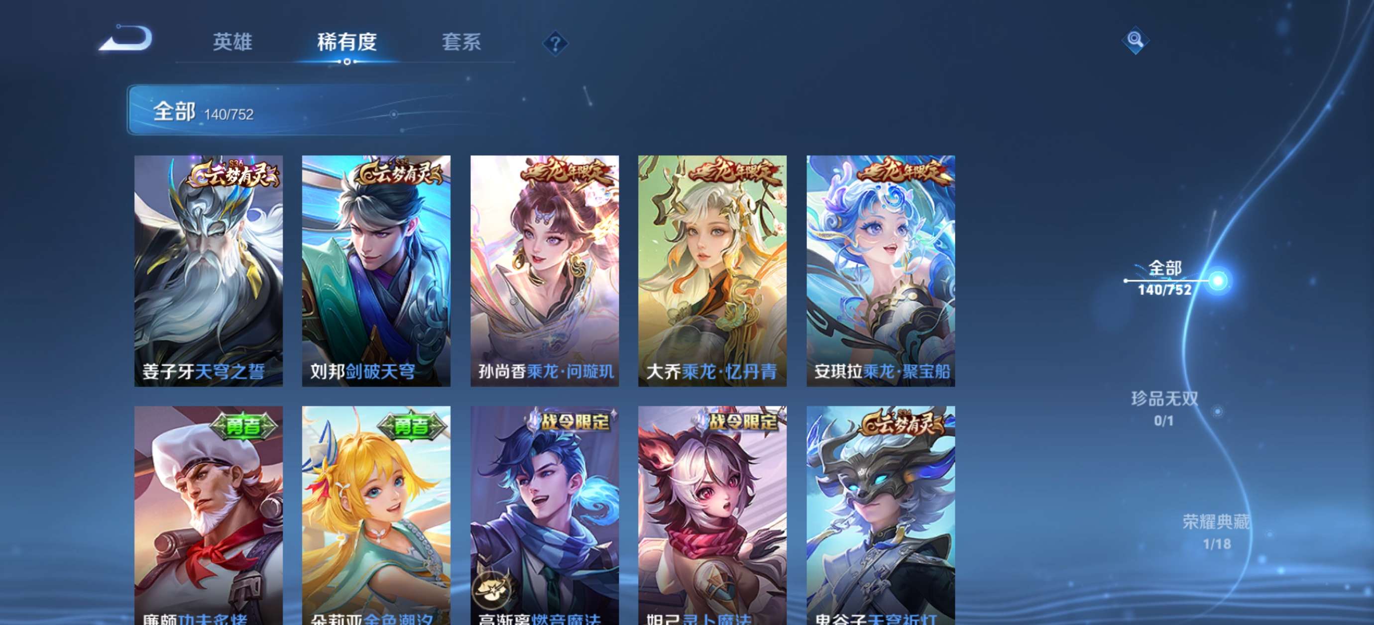 V6 皮肤140 英雄125 永恒钻石 荣耀典藏1 珍品传说1 传说4 其他皮肤140